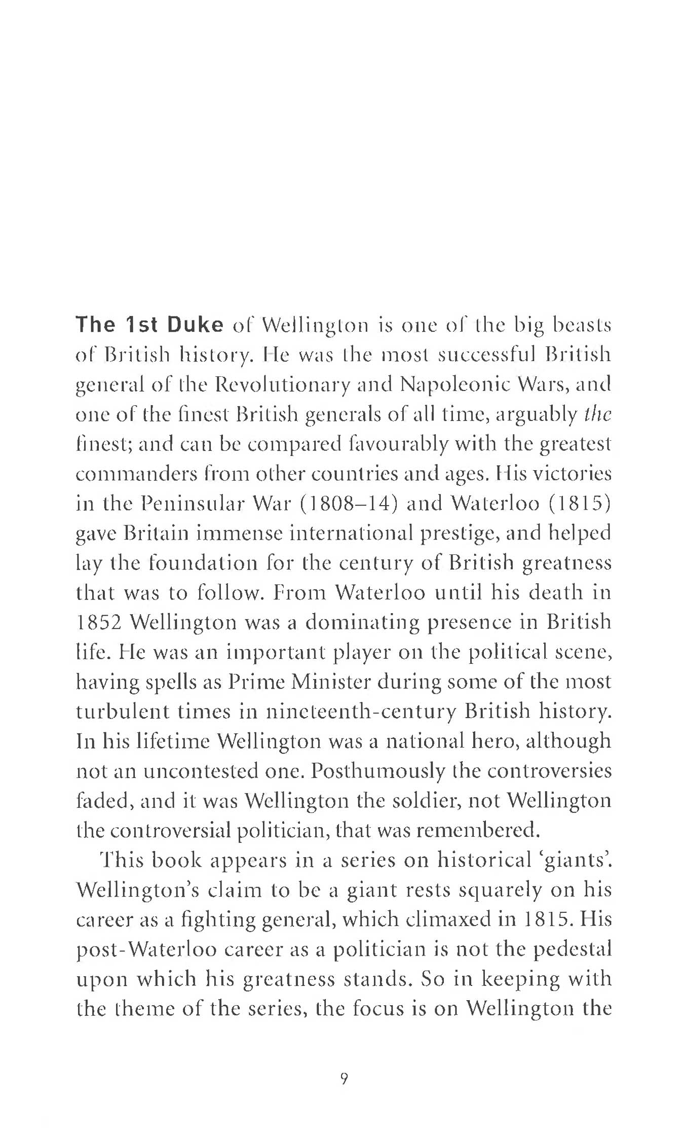 Wellington is a giant because he was one of the greatest military commanders in British history, an important figure in the emergence of Britain as a great imperial power, a man who dominated British society and politics for 35 years. He was the only one of Napoleon's contemporaries who can be mentioned in the same breath as a general - a master of logistics, politics and coalition warfare as well as strategy, operations and tactics. The book's focus is on Wellington's military career, and it looks at all of these aspects, placing them in the context of the military and political developments of the time. It explores Wellington's personality - a key to understanding his success - and briefly examines his post-Waterloo career as a politician. It concludes that Wellington was not only a military genius, but an icon whose fame endures to our own time.