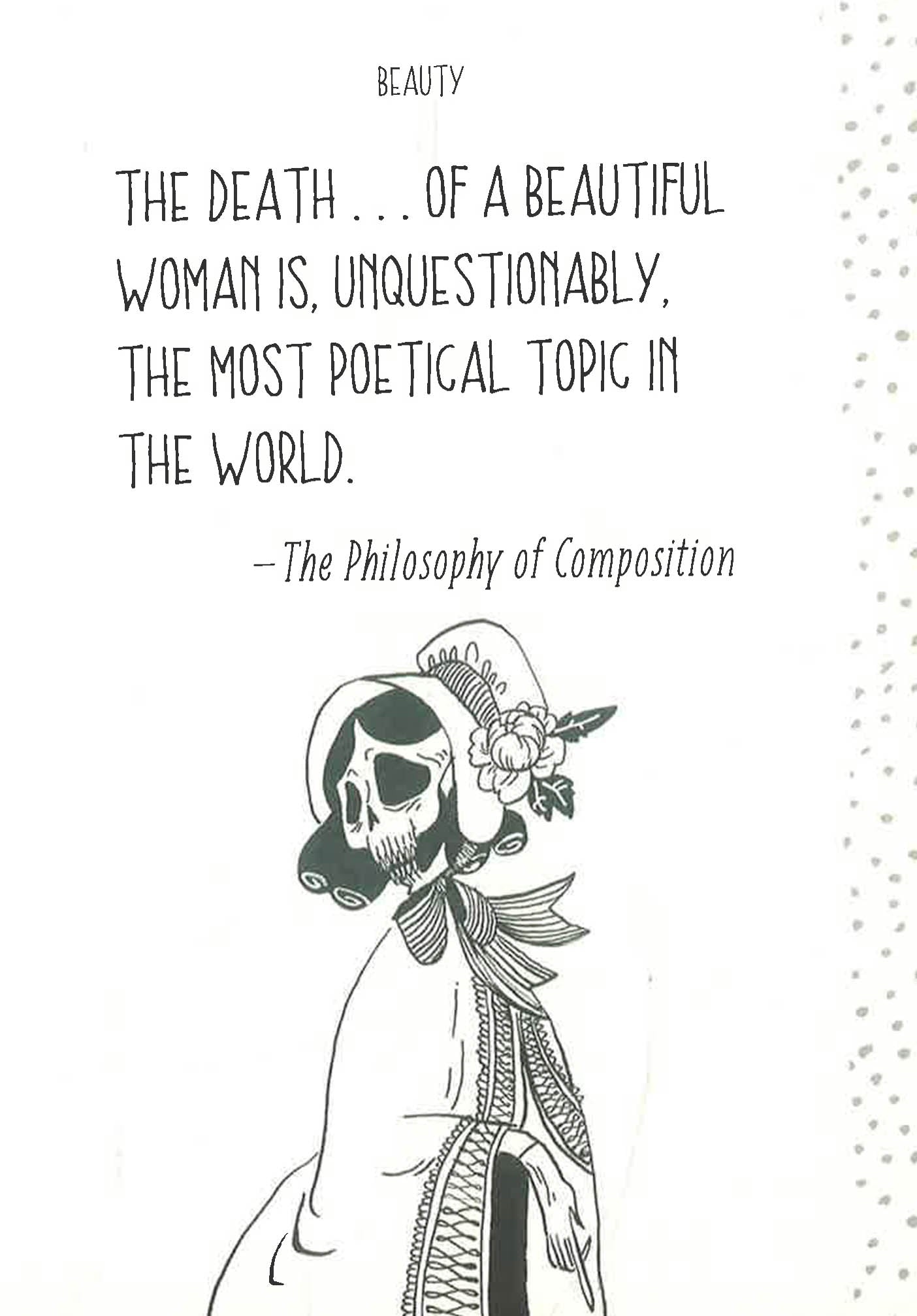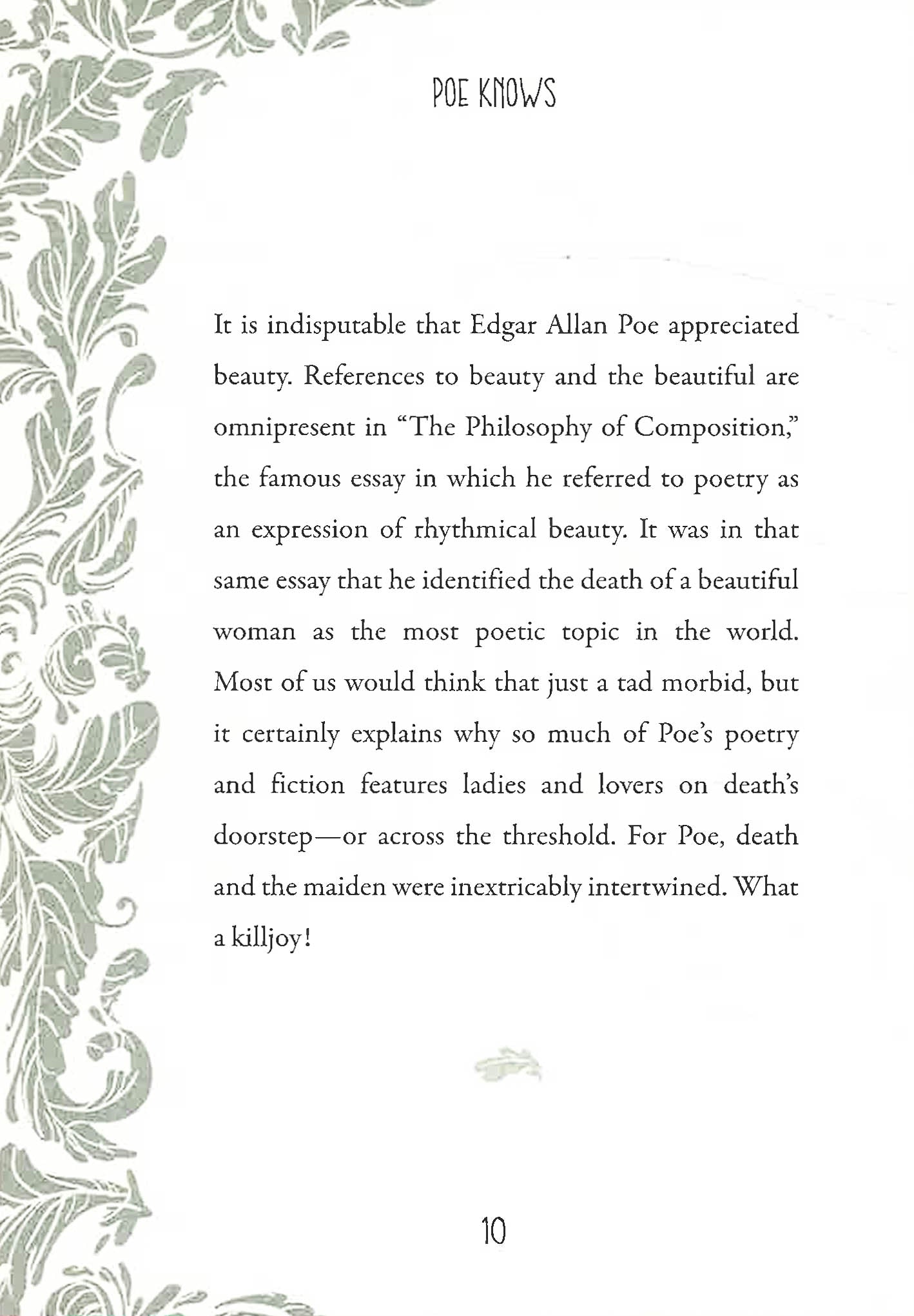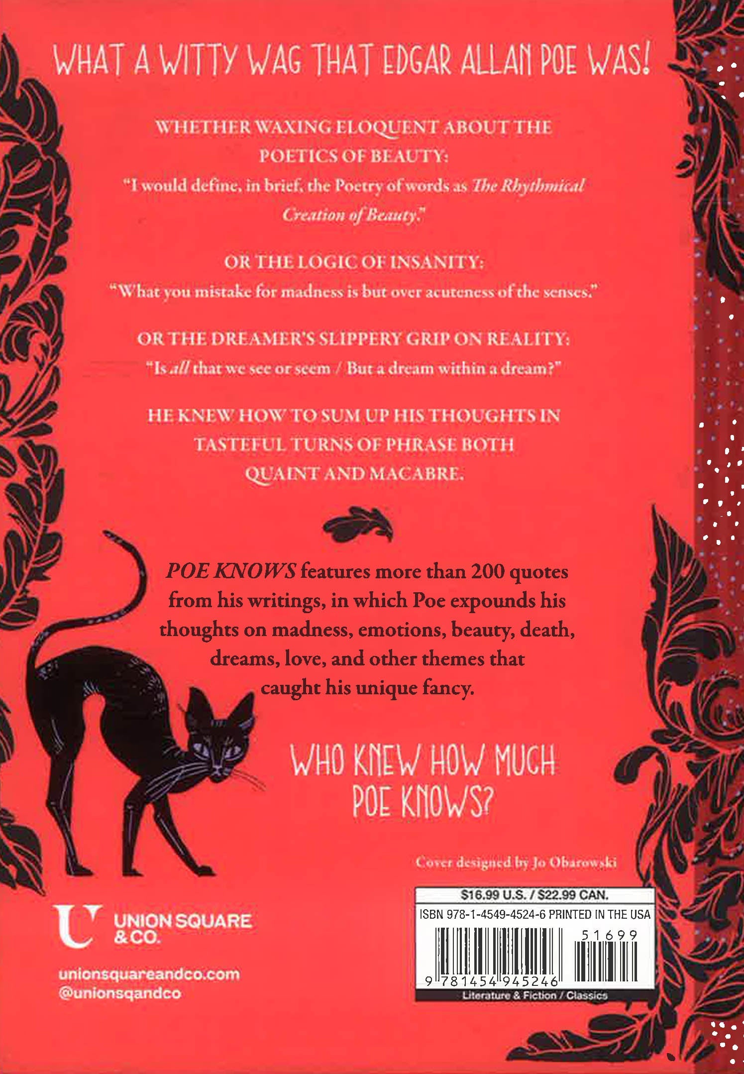 An illustrated wit-and-wisdom-style packaging of quotes and excerpts from the fiction and nonfiction of Edgar Allan Poe, organized by theme and presented in a lighter-than-Poe context.