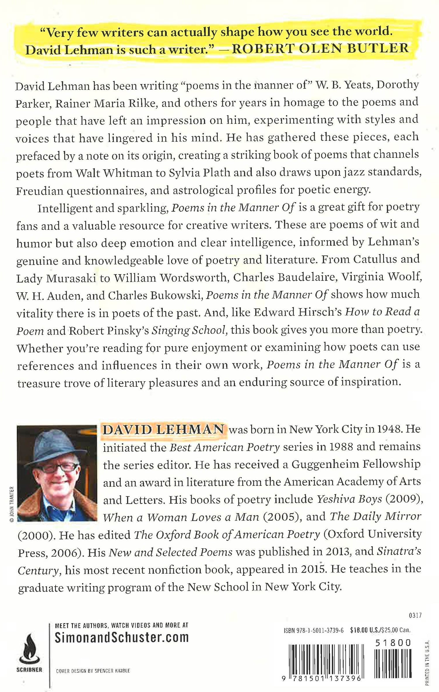 Poems in the Manner Of is an illuminating journey through centuries of writers who continue to influence new work today, including that of respected poet and series editor of The Best American Poetry David Lehman.