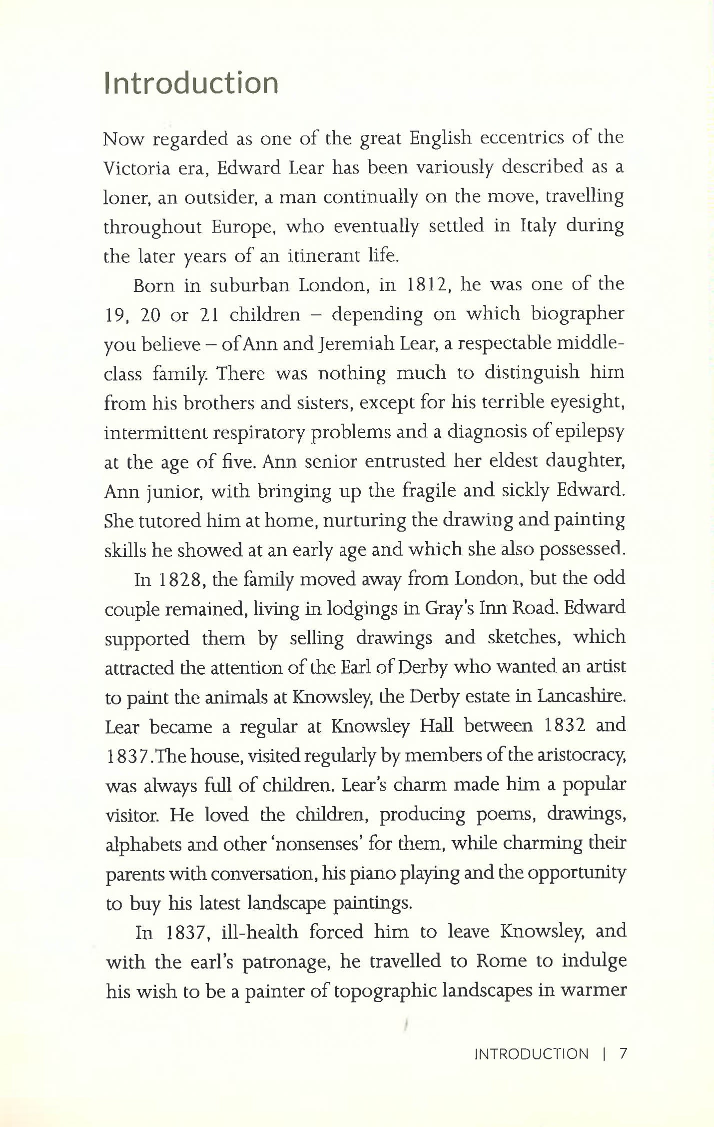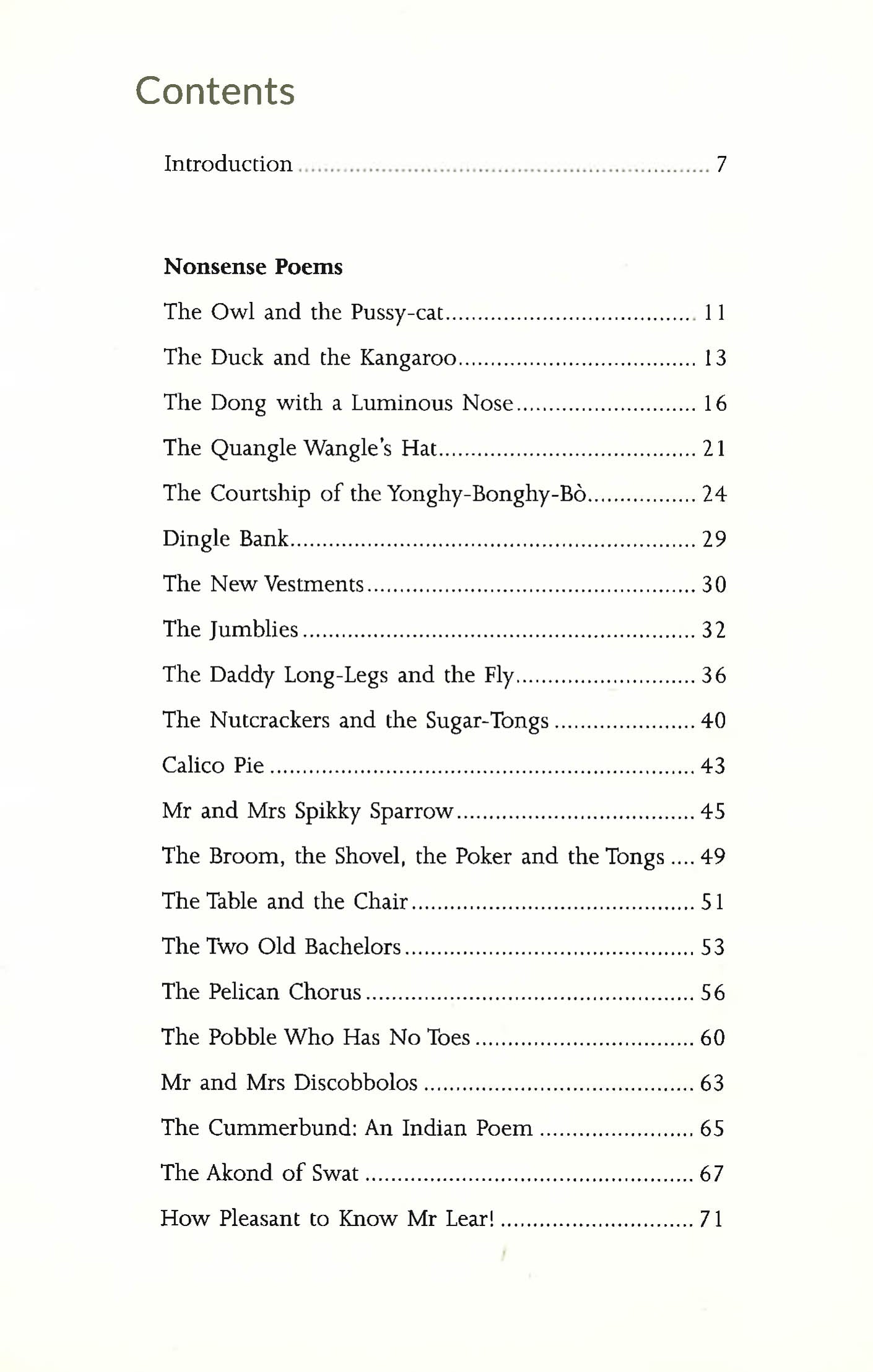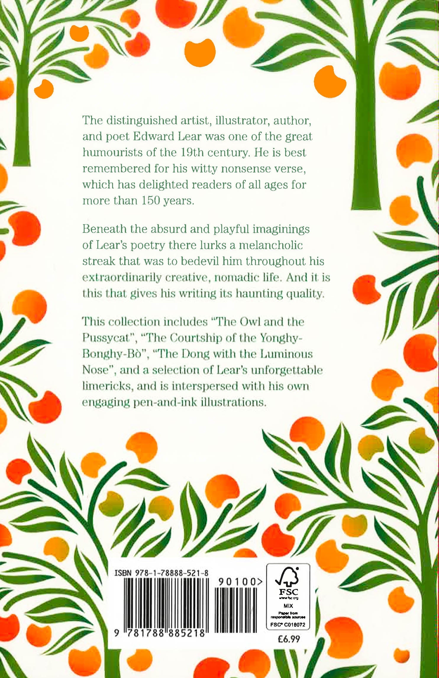 A popular guest at the Earl of Derbyâ€s Lancashire estate, Edward Lear became adept at creating poems and drawings to entertain other visitors, particularly children. This volume brings together a selection of his limericks and ‘nonsense†alphabets and poems – including the much-loved ‘The Owl and the Pussycat†– and examples of his pen-and-ink illustrations.