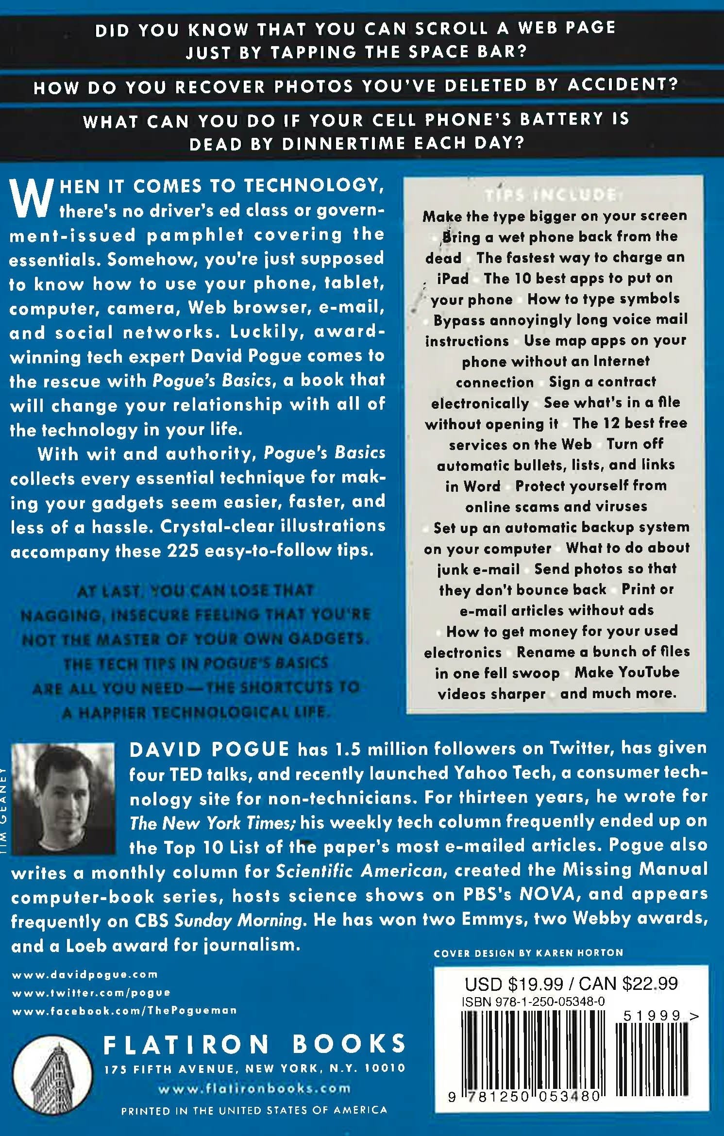 When David Pogue gave this kind of advice in the New York Times, his columns were consistently the most e-mailed of the week. When he gave a TED Talk of his tips, 1.3 million people watched it in the first 90 days. Pogue's tips have earned him 1.5 million followers on Twitter. And now that he writes his columns for Yahoo Tech, the audience for this advice has grown by millions more. Here at last is the book all these fans have been waiting for: a book of 200 tips that will change your relationship to your phone, computer, tablet, camera - all of the technology in your life. A layflat format makes this the perfect reference book that you can turn to time and time again to pick up more helpful cheats for all your devices. At last, you can lose the nagging, insecure feeling that you're not the master of your own gadgets; the tech tips in Pogue's Basics are all you need to get by...the shortcuts to a happier technological life.