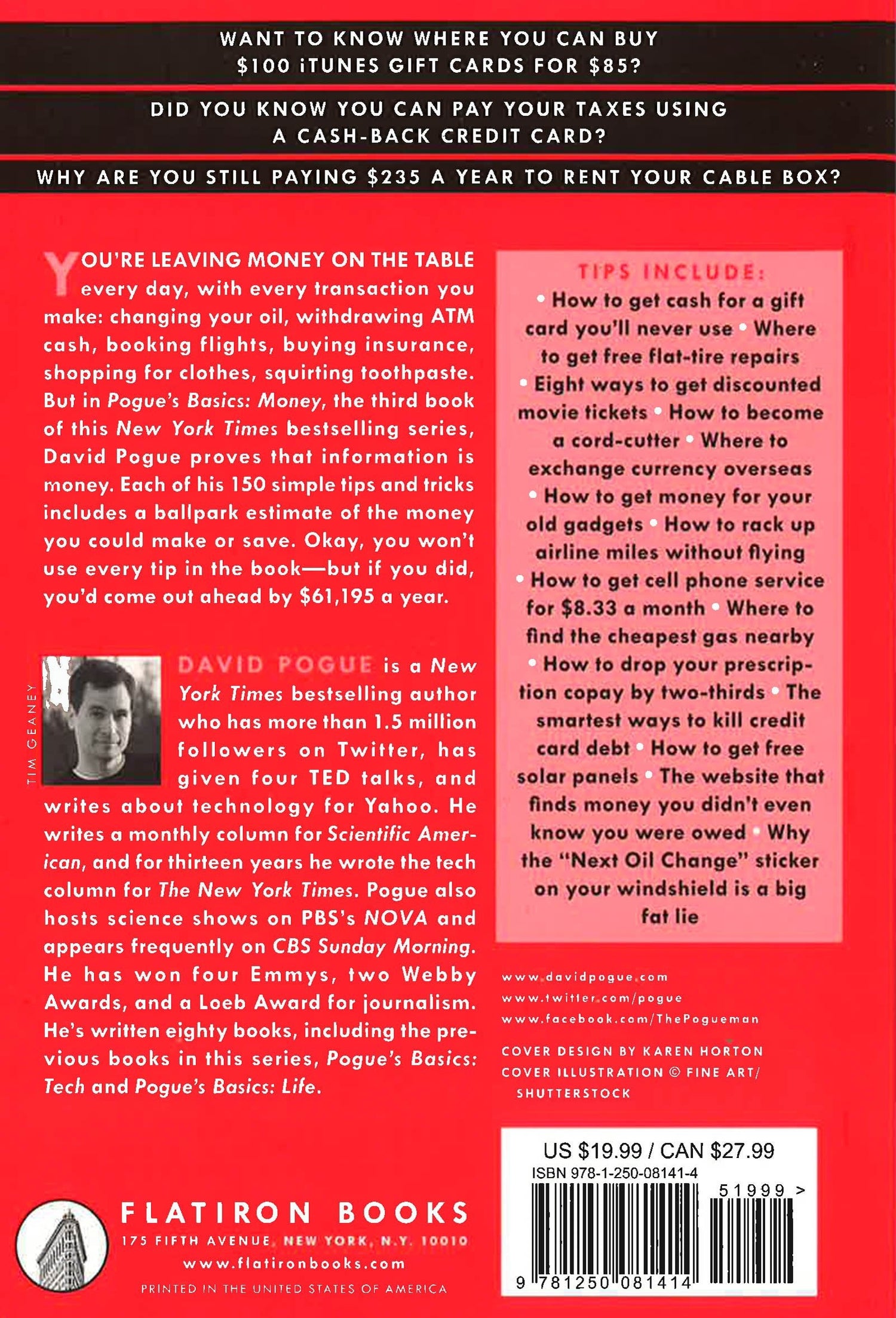 Want to know where you can buy $100 iTunes gift cards for $85? Did you know you can pay your taxes by using a cash-back credit card? Why are you still paying $235 a year to rent your cable box? You're leaving money on the table every day, with every transaction you make: changing your oil, withdrawing ATM cash, booking flights, buying insurance, shopping for clothes, squirting toothpaste. But in Pogue's Basics: Money, the third book of this New York Times bestselling series, David Pogue proves that information is money. Each of his 150 simple tips and tricks includes a ballpark estimate of the money you could make or save. Okay, you won't use every tip in the book--but if you did, you'd come ahead by $61,195 a year. *This book may have a remainder mark