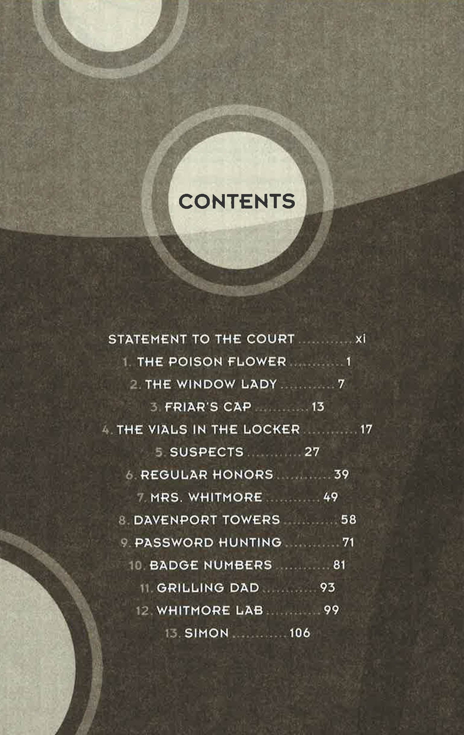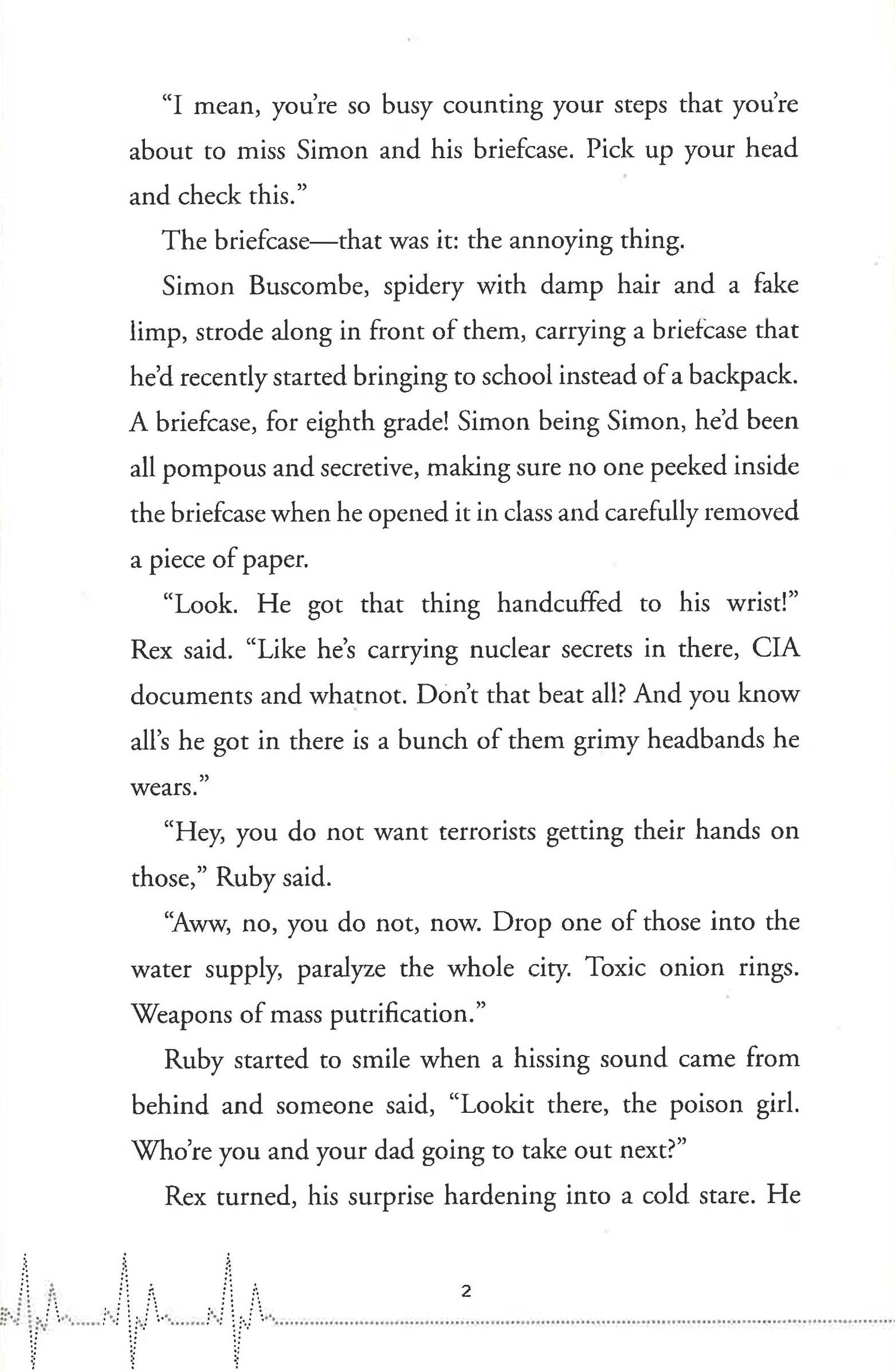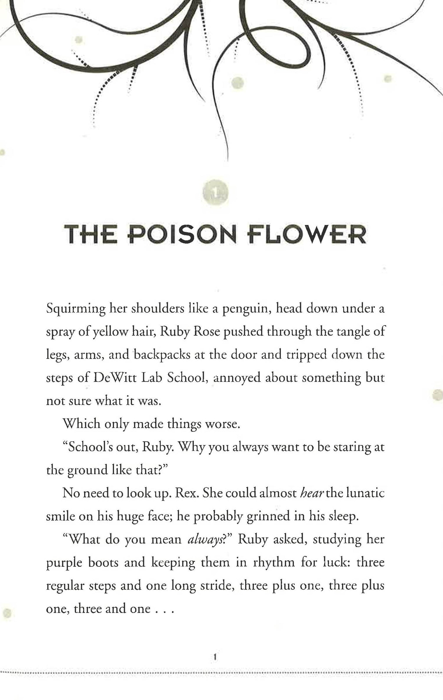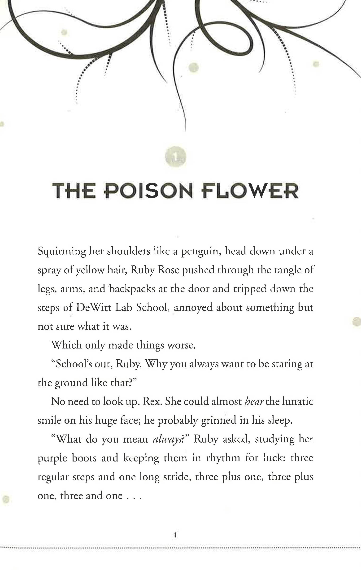 Murder in the lab! The famous forensic scientist Dr. Ramachandran is stone-cold dead, and Ruby Rose's father is the prime suspect. It's one more reason for Ruby to hate the Gardens, the funky urban neighborhood to which she has been transplanted. Wise but shy, artistic but an outsider, Ruby must marshal everything and everyone she can to help solve the mystery and prove her father didn't poison his boss. Everyone? The list isn't too long: there's T. Rex, Ruby's big, goofy but goodhearted friend; maybe those other two weird kids from class; and that mysterious old lady in the apartment upstairs, who seems to know a lot about chemistry . . . which could come in very handy.