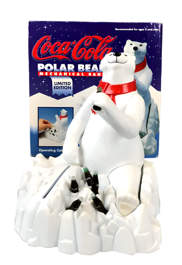 The Coca Cola Company began using the symbol of the Polar Bear in 1993 to promote advertising slogan of "Always Coca Cola." Featured in many television and print advertisements, the Coca Cola Polar Bear is most fondly remembered from the 1994 Winter Olympic Games in Lilehammer, Norway. The Polar Bear skied and sledded his way into the hearts of the millions who watched the games worldwide. Today Ertl Collectibles has adapted the Coca Cola Polar Bear into a high quality, die cast metal mechanical bank .