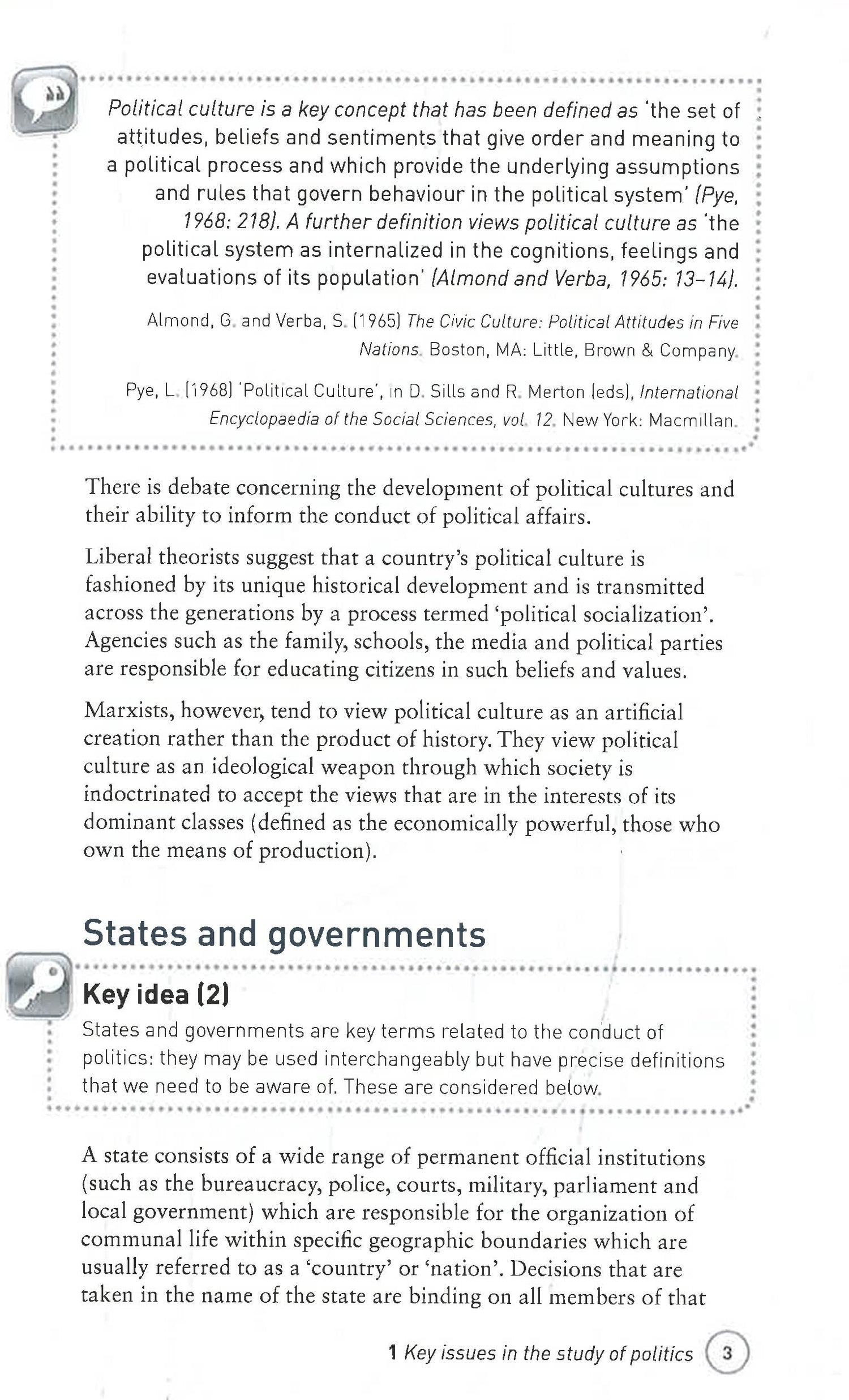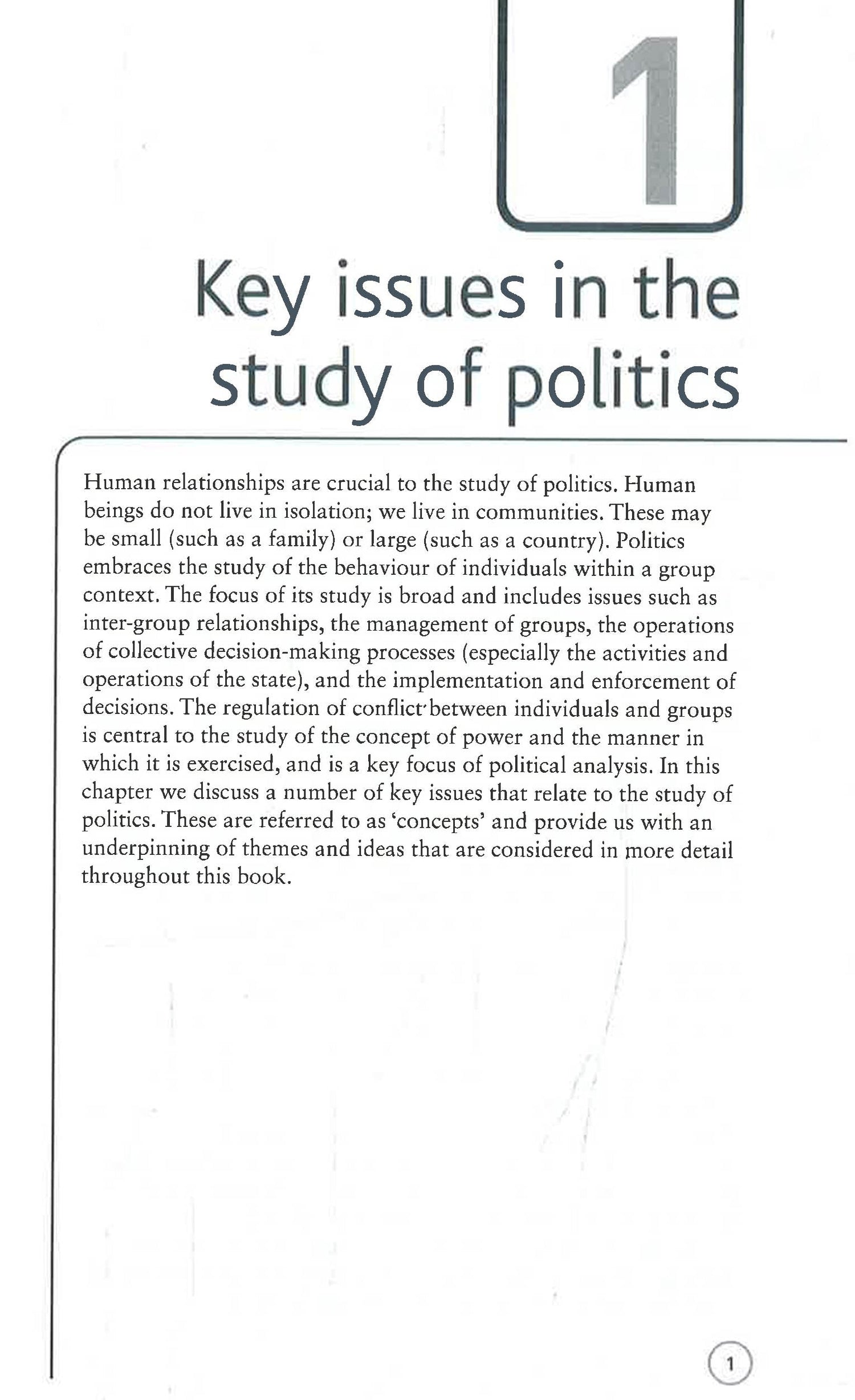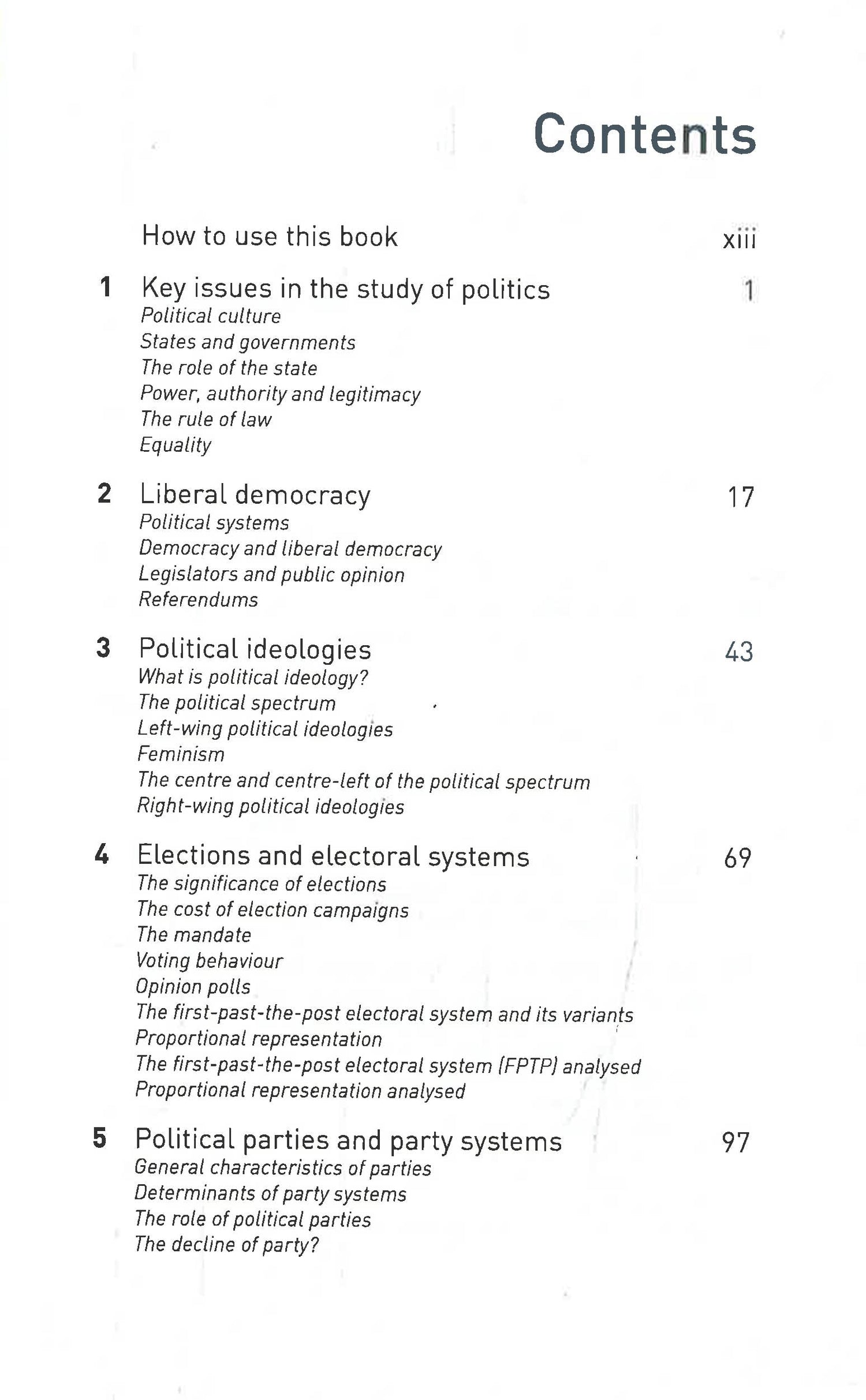 Chapters include: Key issues in politics; Political ideologies; Elections and electoral systems; Political parties and party systems; Pressure groups and protest; The media; Constitutions and human rights; The bureaucracy; Executive, legislative and judicial branches of government; The nation state; International terrorism and political extremism.