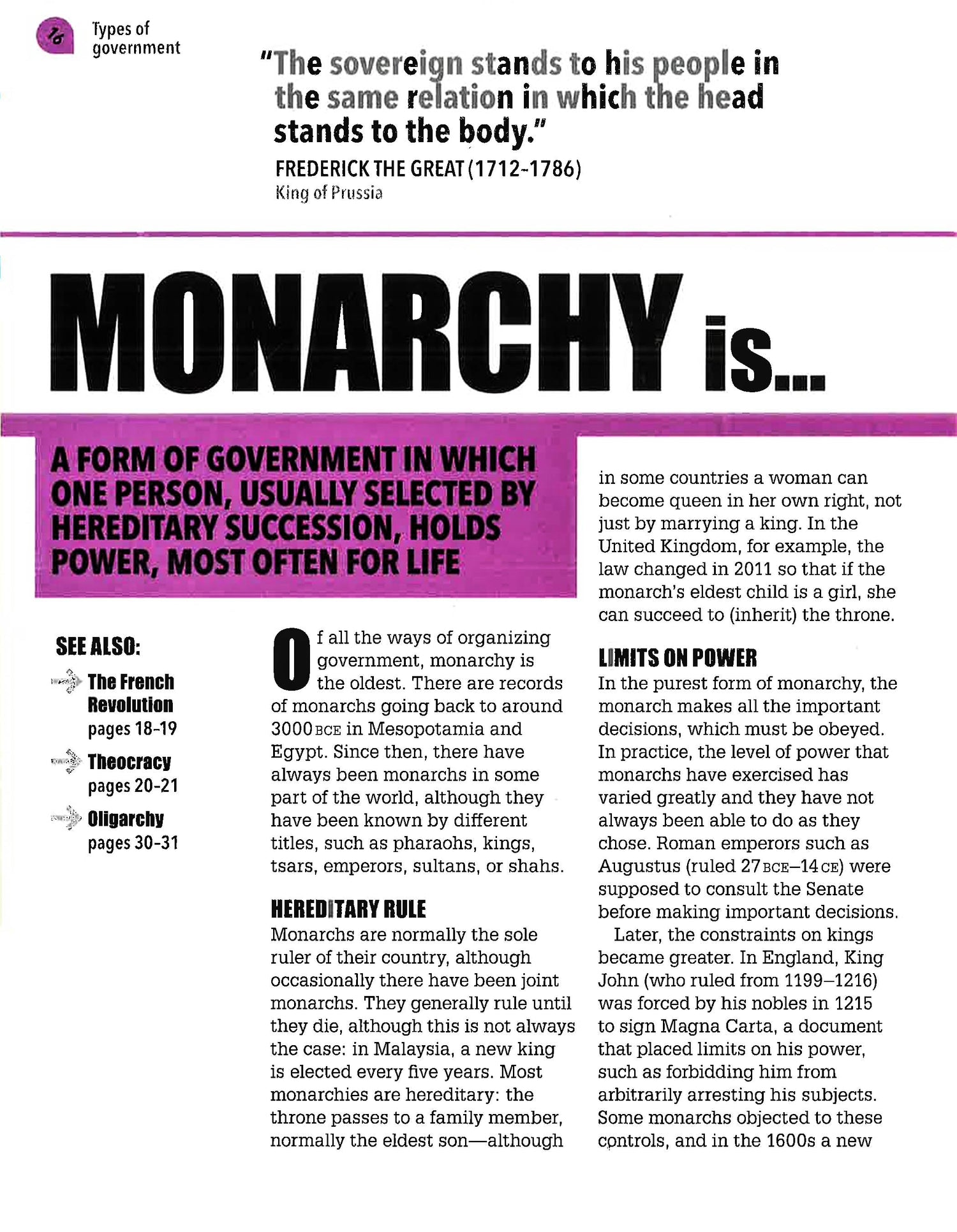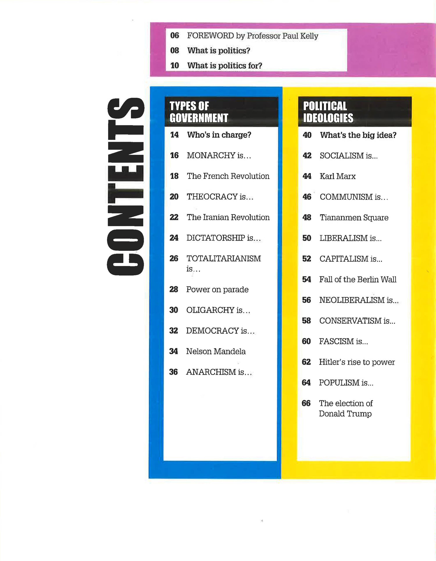 Politics is... looks at the beliefs of political thinkers, leaders, and activists from around the world, covers the key branches of government, and examines authority. While focusing on contemporary issues, the book also traces the history of politics. It explains the ideas and -isms that shape our world as well as investigating the role of external factors, such as protest and the media, in political decision-making.