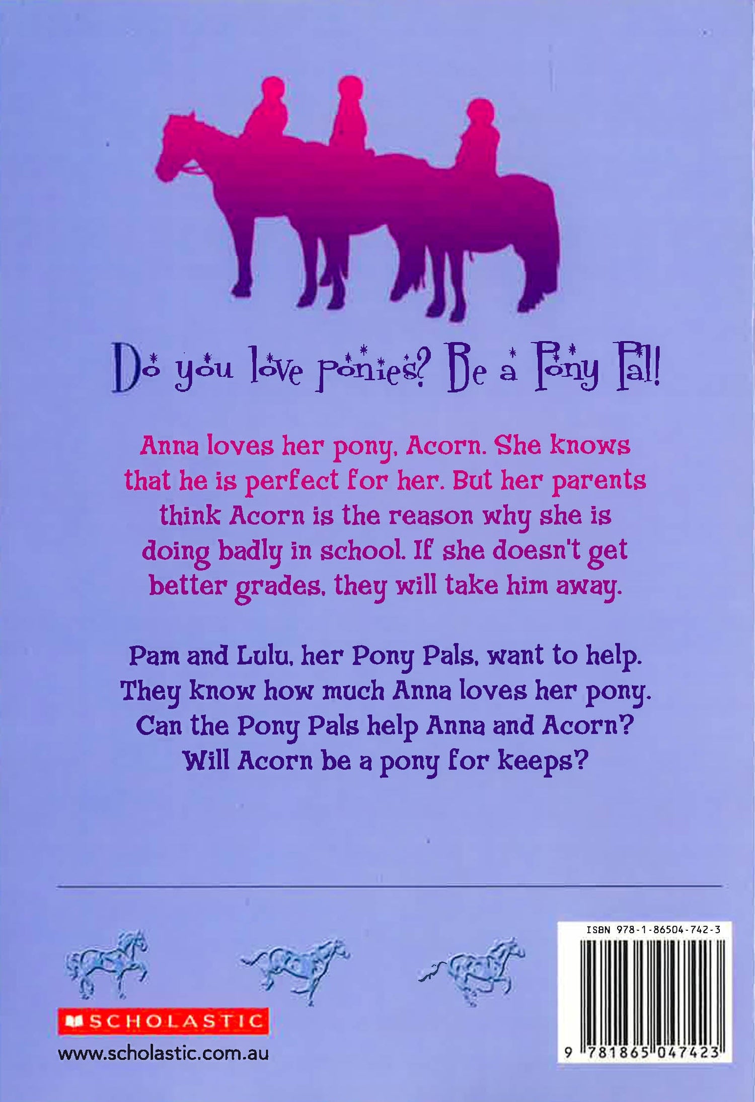 Anna loves her pony, Acorn. She knows that he is perfect for her. But her parents think Acorn is the reason why she is doing badly in school. If she doesn't get better grades, they will take him away. Pam and Lulu, her Pony Pals, want to help. They know how much Anna loves her pony. Can the Pony Pals help Anna and Acorn? Will Acorn be a pony for keeps?