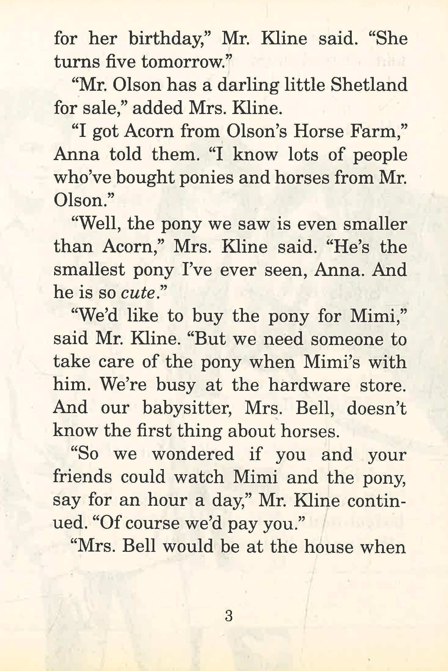 Hired to teach Mimi Kline basic pony care, the Pony Pals are soon thwarted by the headstrong six-year-old, who quickly proves to them that taking care of the tiny pony Tongo is more work than anyone could have imagined.