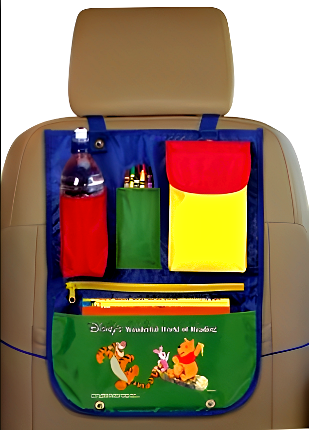 Get rid of the clutter in your car and make your life tidier with Disney?s Wonderful World of Reading backseat organizer featuring Winnie the Pooh and his friends. This clever, easy-to-clean device features a pocket for a drink bottle, a pencil or crayon holder, and a medium pocket perfect for a pack of traveling tissues or snacks. The organizer, which fits easily over the front-seat headrest, also has a large pocket so your children can entertain themselves with those most treasured possessions?books. A unique zippered compartment keeps your child?s belongings safe, clean, and dry. *Image shown is for illustrative purposes only and may show decorative items that is not included for sale.