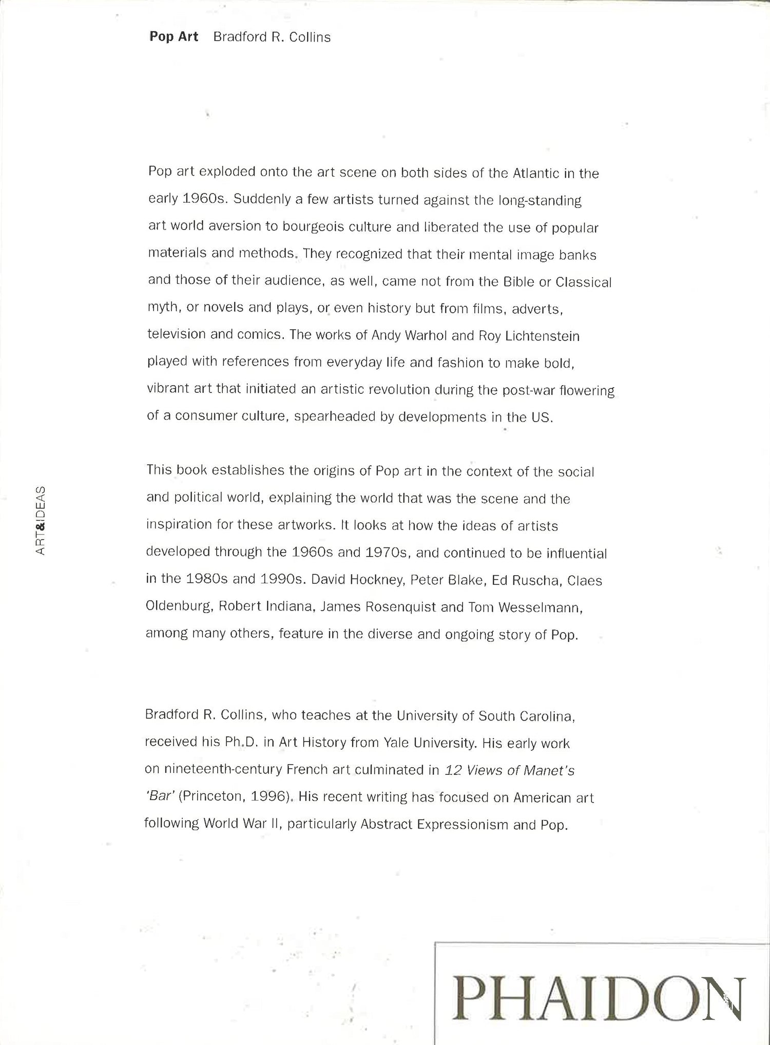 This new title in the renowned Art & Ideas series is a thorough introduction to, and significant appraisal of, the art of Pop. Bradford Collins explains the essence of Pop art and examines its full history in contemporary cultural and political context - the origins of the movement during the 1950s, the flourishing of Pop art in America and the UK during the 1960s, and its further incarnations and more widespread impact. The 250 illustrations include all the most classic examples of Pop art by such well-known figures as Andy Warhol and Roy Lichtenstein, as well as lesser known works that have been neglected in recent years but are essential to a thorough understanding of Pop. Contemporary source material used by artists to make their works and consideration of what was in the media at the time support discussions of the inspiration, creation and impact of the art.