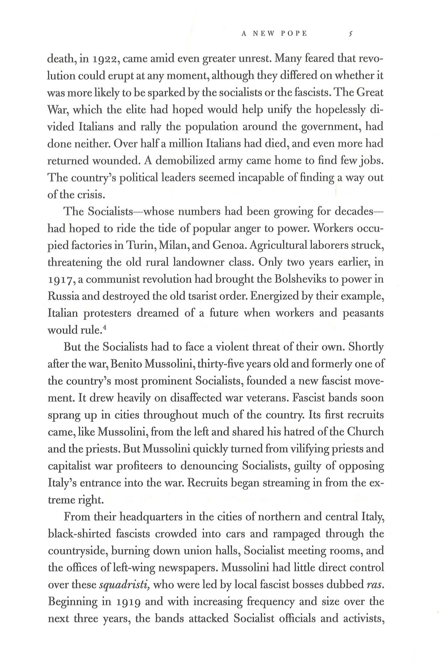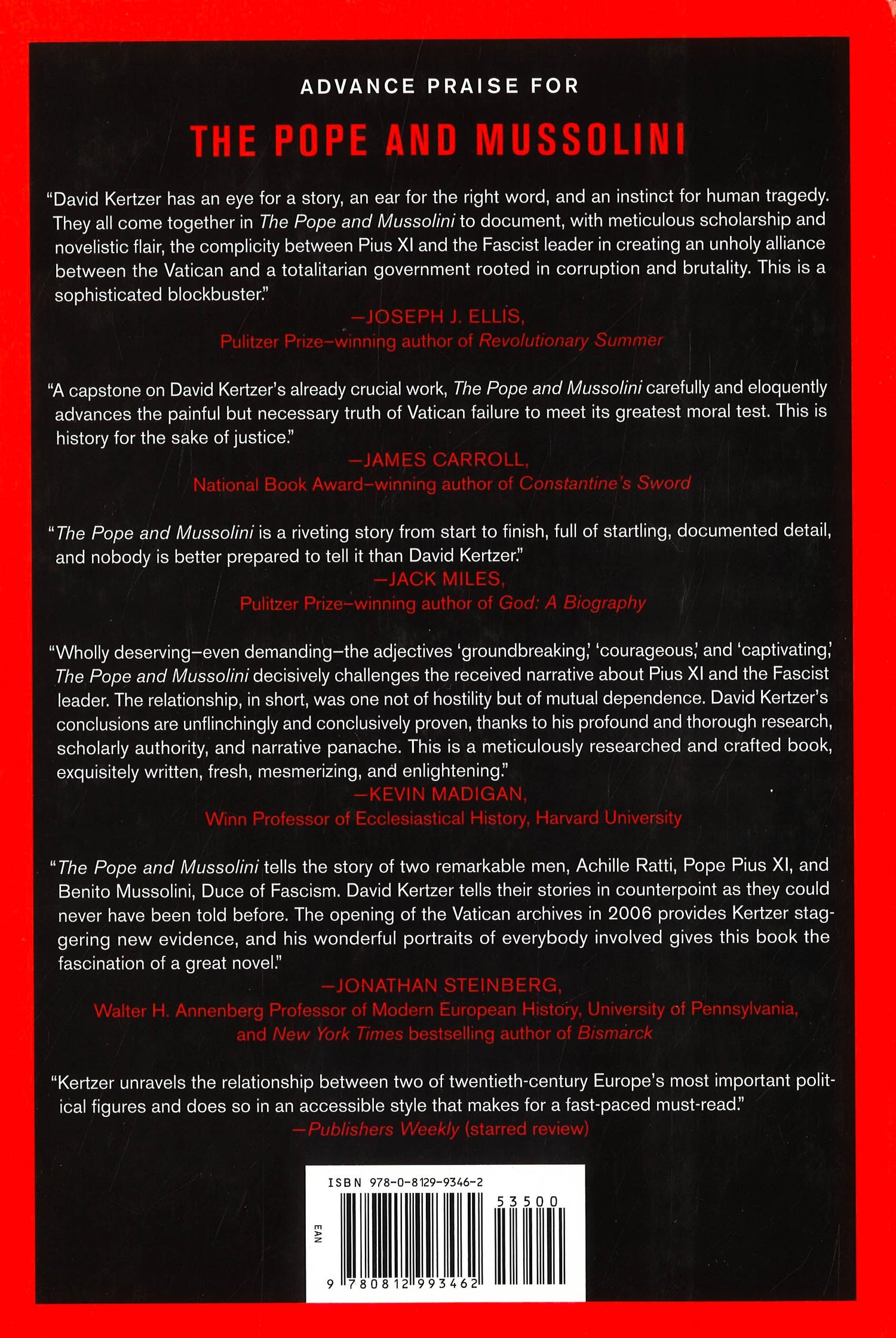 PULITZER PRIZE WINNER"" From National Book Award finalist David I. Kertzer comes the gripping story of Pope Pius XI s secret relations with Italian dictator Benito Mussolini. This groundbreaking work, based on seven years of research in the Vatican and Fascist archives, including reports from Mussolini s spies inside the highest levels of the Church, will forever change our understanding of the Vatican s role in the rise of Fascism in Europe."The Pope and Mussolini" tells the story of two men who came to power in 1922, and together changed the course of twentieth-century history. In most respects, they could not have been more different. One was scholarly and devout, the other thuggish and profane. Yet Pius XI and Il Duce had many things in common. They shared a distrust of democracy and a visceral hatred of Communism. Both were prone to sudden fits of temper and were fiercely protective of the prerogatives of their office. ( We have many interests to protect, the Pope declared, soon after Mussolini seized control of the government in 1922.) Each relied on the other to consolidate his power and achieve his political goals.In a challenge to the conventional history of this period, in which a heroic Church does battle with the Fascist regime, Kertzer shows how Pius XI played a crucial role in making Mussolini s dictatorship possible and keeping him in power. In exchange for Vatican support, Mussolini restored many of the privileges the Church had lost and gave in to the pope s demands that the police enforce Catholic morality. Yet in the last years of his life as the Italian dictator grew ever closer to Hitler the pontiff s faith in this treacherous bargain started to waver. With his health failing, he began to lash out at the Duce and threatened to denounce Mussolini s anti-Semitic racial laws before it was too late. Horrified by the threat to the Church-Fascist alliance, the Vatican s inner circle, including the future Pope Pius XII, struggled to restrain the headstrong pope from destroying a partnership that had served both the Church and the dictator for many years."The Pope and Mussolini" brims with memorable portraits of the men who helped enable the reign of Fascism in Italy: Father Pietro Tacchi Venturi, Pius s personal emissary to the dictator, a wily anti-Semite known as Mussolini s Rasputin; Victor Emmanuel III, the king of Italy, an object of widespread derision who lacked the stature literally and figuratively to stand up to the domineering Duce; and Cardinal Secretary of State Eugenio Pacelli, whose political skills and ambition made him Mussolini s most powerful ally inside the Vatican, and positioned him to succeed the pontiff as the controversial Pius XII, whose actions during World War II would be subject for debate for decades to come.With the recent opening of the Vatican archives covering Pius XI s papacy, the full story of the Pope s complex relationship with his Fascist partner can finally be told. Vivid, dramatic, with surprises at every turn, "The Pope and Mussolini "is history writ large and with the lightning hand of truth.NAMED ONE OF THE BEST BOOKS OF THE YEAR BY"SAN FRANCISCO CHRONICLE"Kertzer has an eye for a story, an ear for the right word, and an instinct for human tragedy. This is a sophisticated blockbuster. Joseph J. Ellis, Pulitzer Prize winning author of"Revolutionary Summer"""A fascinating and tragic story. " The New Yorker"Revelatory . . . [a] detailed portrait. "The New York Review of Books""