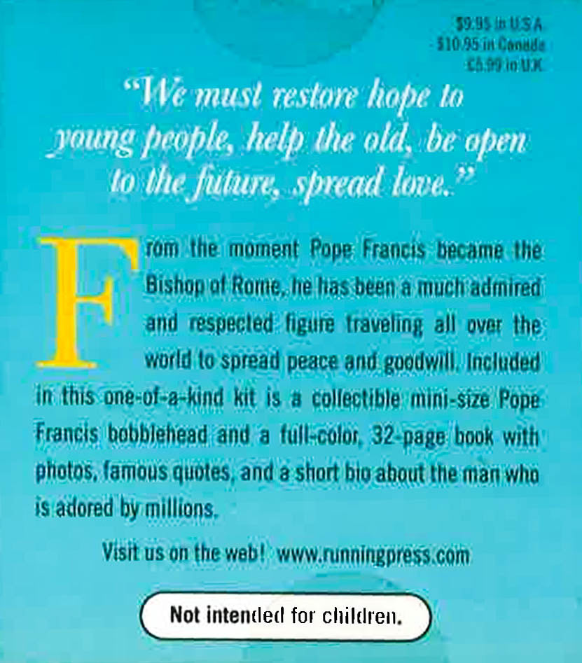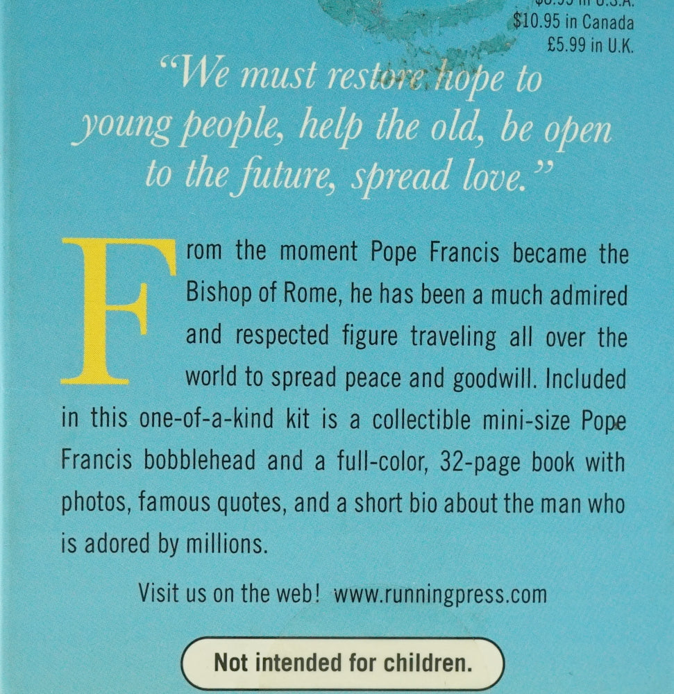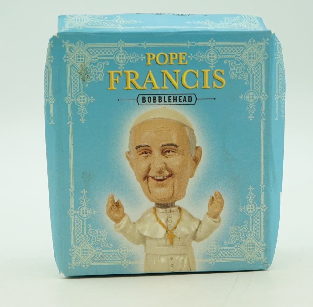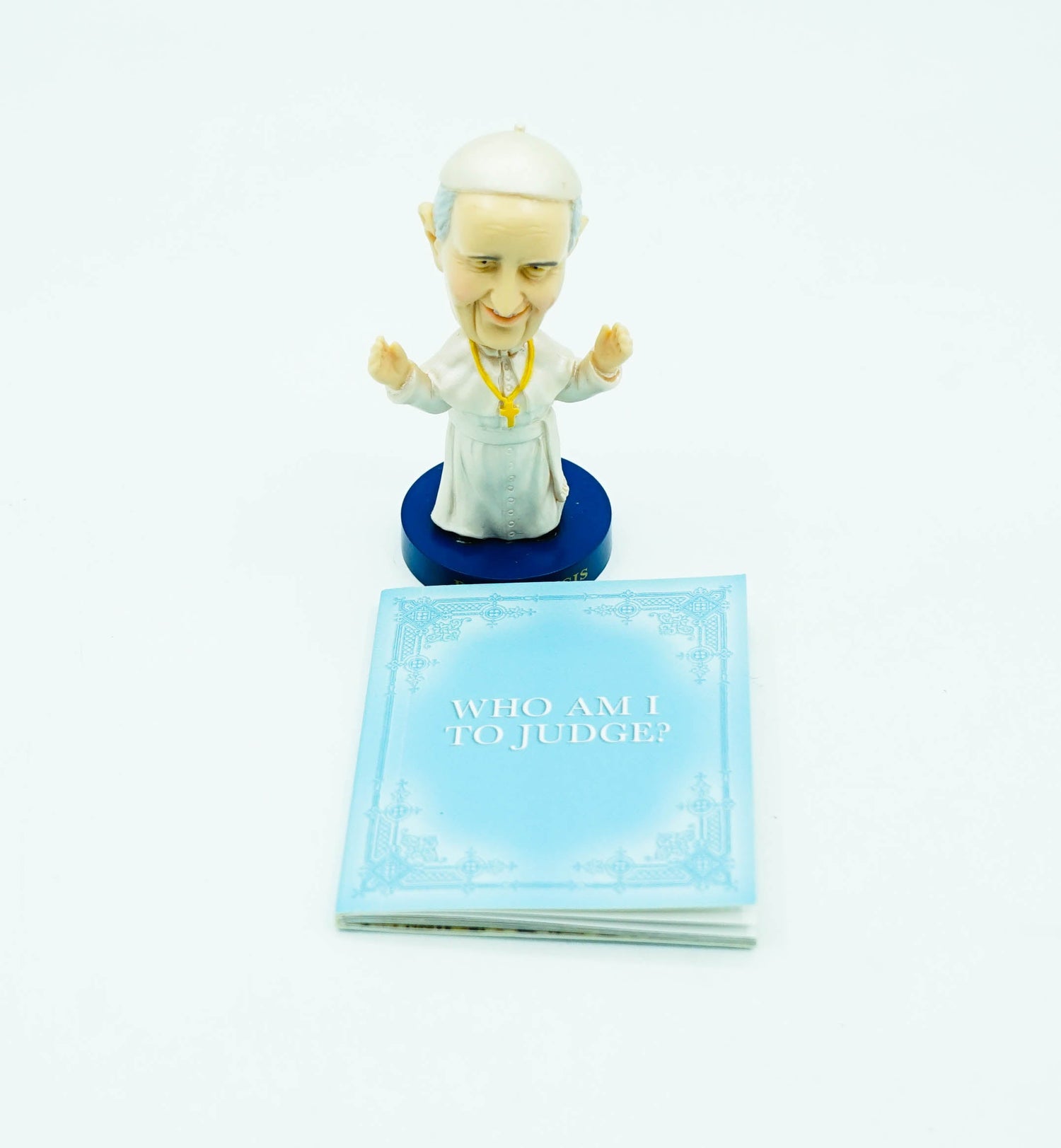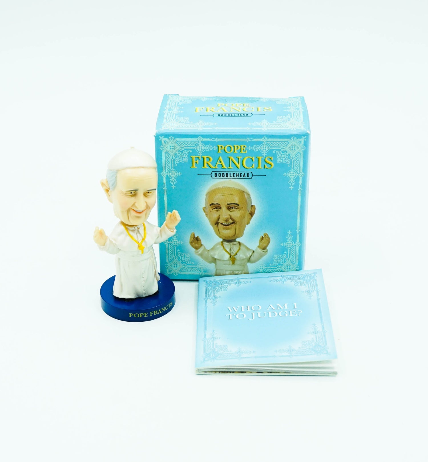 A one-of-a-kind mini Pope Francis bobblehead! From the moment Pope Francis became the Bishop of Rome, he has been a much admired and respected figure traveling all over the world to spread peace and goodwill. Included in this kit is a collectible mini-size Pope Francis bobblehead and a full-color, 32-page book with photos, quotes, and bio about the man who is adored by millions.