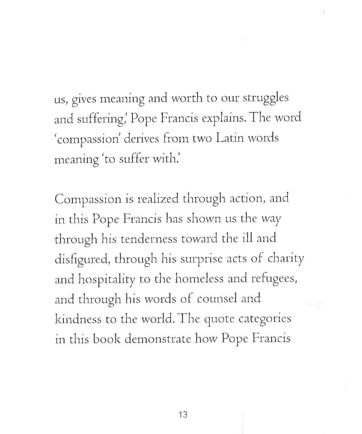 This beautiful and handy book provides 250 quotes of inspiration from one of the most popular popes of all time. A pope of the people, Pope Francis is cherished around the world and continues to be well loved by the faithful and non-religious alike. During his short papacy so far, his commitment to compassion and humility have already cemented his position as one of the most popular popes of all time and his words are a comfort and inspiration to millions. Pope Francis' Little Book of Compassion offers quotes of faith and hope from this incredible man, concentrating on the teachings of his Holy Year of Mercy, including prayer, charity, forgiveness, and solidarity.