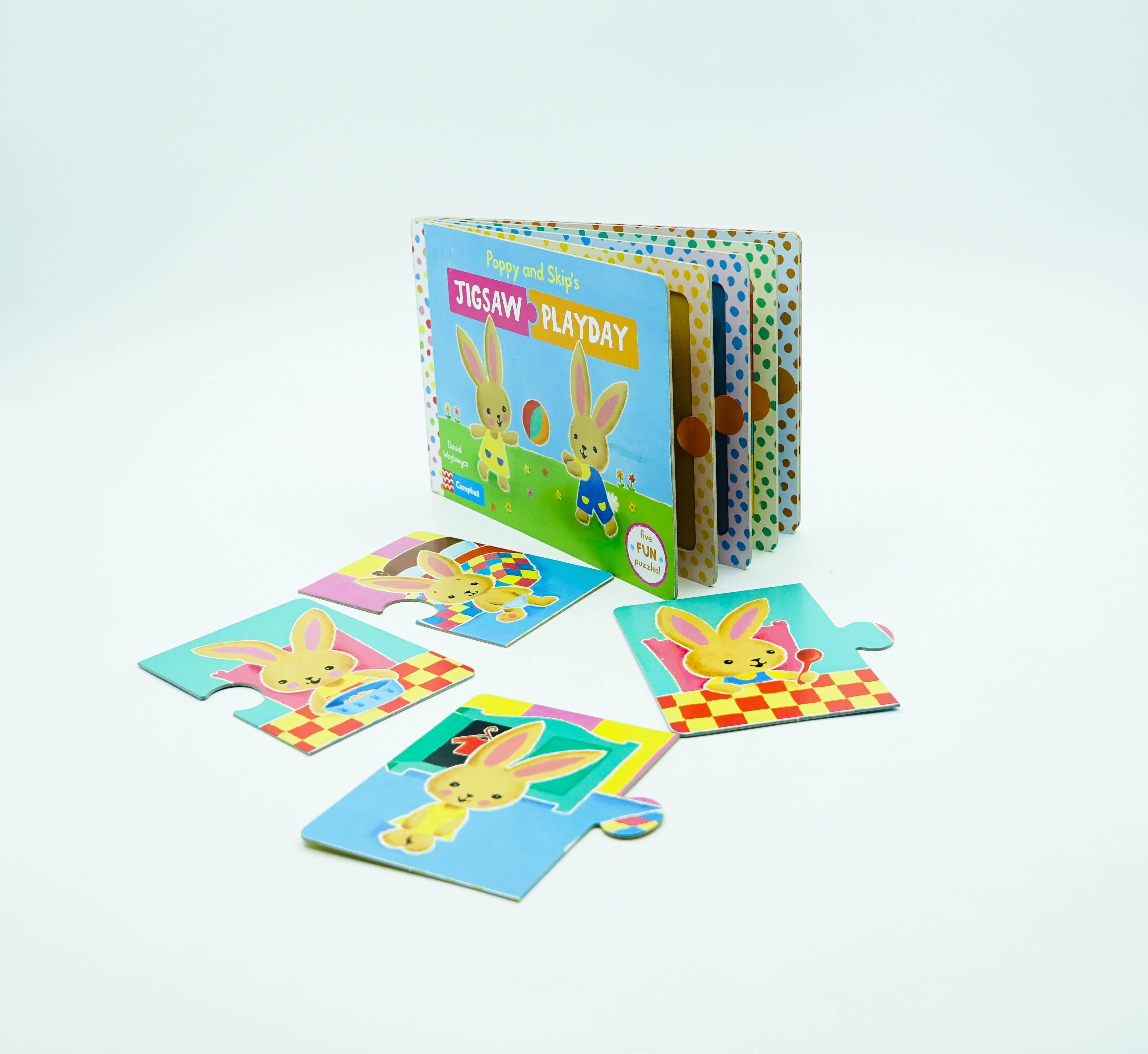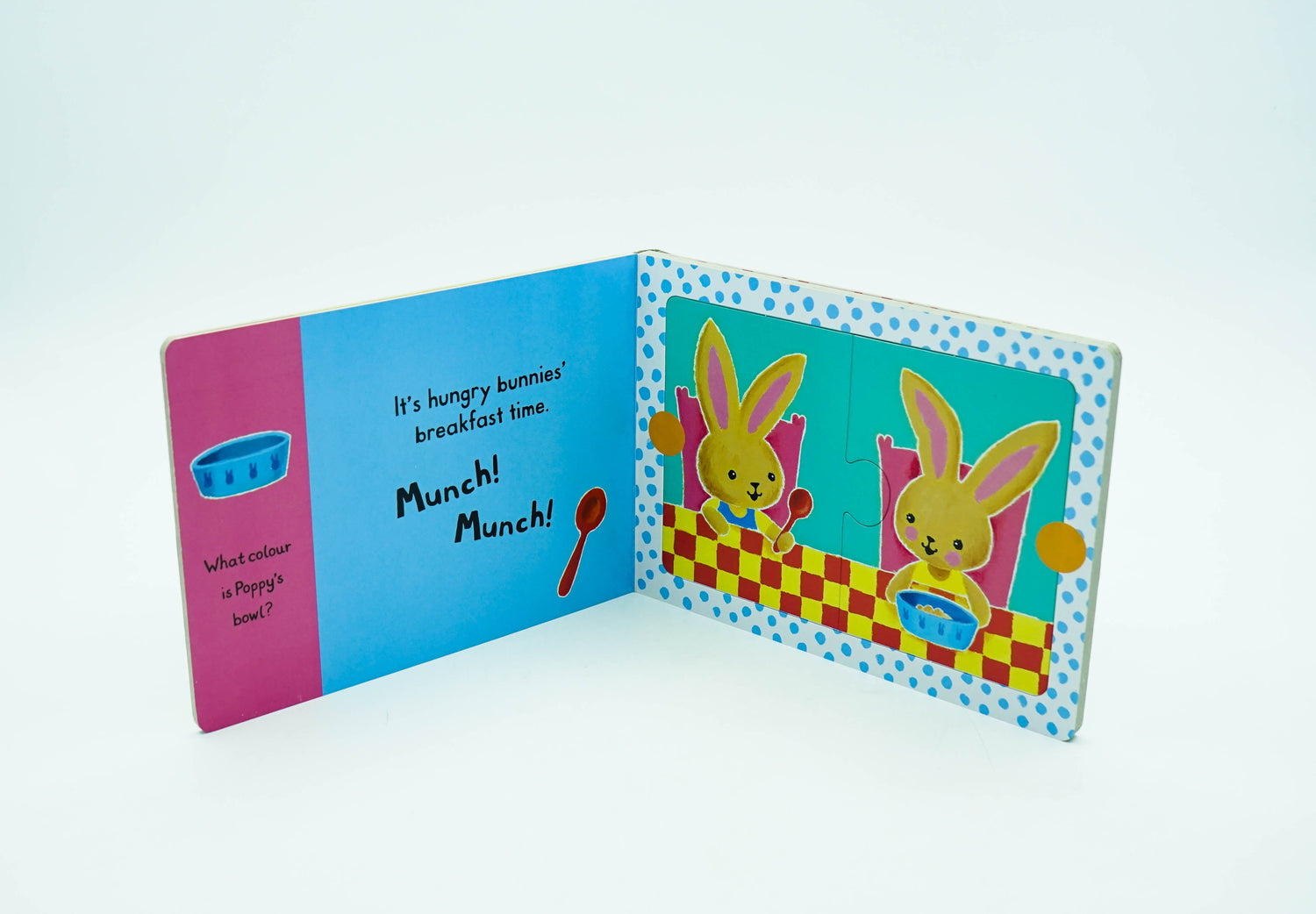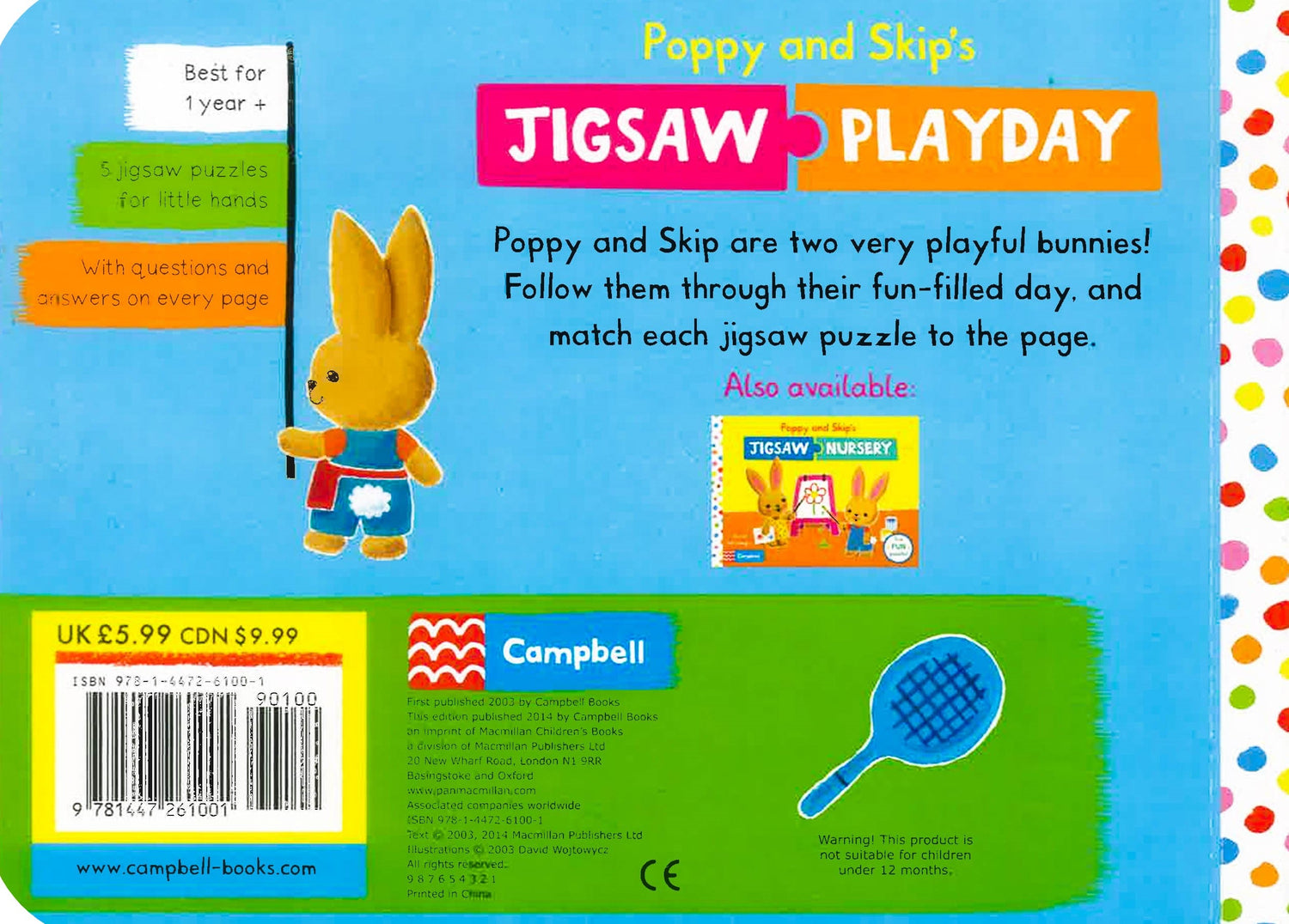 Poppy and Skip are two very busy bunnies! Follow their antics throughout the day as they have fun playing at home, starting with a yummy breakfast and finishing with lots of games in the garden. Best of all, there's a jigsaw puzzle on every spread, making this a great book for children to play with as well as read. With bright, bold illustrations by David Wojtowycz, a playful rhyming text and large chunky puzzle pieces, this is an excellent first jigsaw book for toddlers.