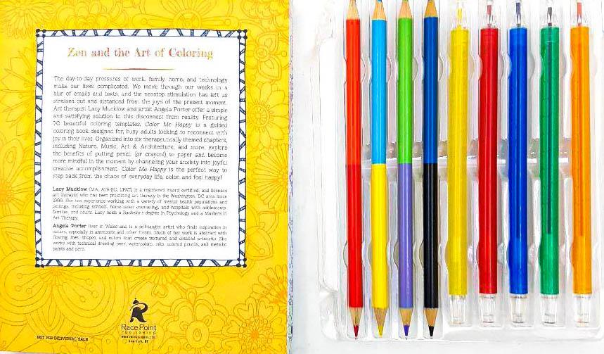 Art-therapy for the stressed out adult - Portable Color Me Happy Kit offers over 70 colouring templates, crayons, and coloured pencils to keep you colouring anywhere. The Portable Color Me Happy Kit includes a guided colouring book, twistable crayons, double sided coloured pencils, giving you everything you need to get started! This kit is designed for busy adults and formatted to fit easily in your bag and includes the pencils and crayons for people on the go! Organised into therapeutically-themed chapters including Mandalas, Water Scenes, Wooded Scenes, Geometric Patterns, Flora & Fauna, Natural Patterns, and Spirituality, this kit examines the benefits of putting pencil to paper and offers adults an opportunity to channel their anxiety into joyful creative accomplishment. Part of the international bestselling Color Me series, this is the perfect way step back from the stress of everyday life, colour, and relax even when you're on the go!Don't forget to try Portable Color Me Calm Kit and the full-sized colouring books, Color Me Stress-Free, Color Me Calm, Color Me Happy, and more!