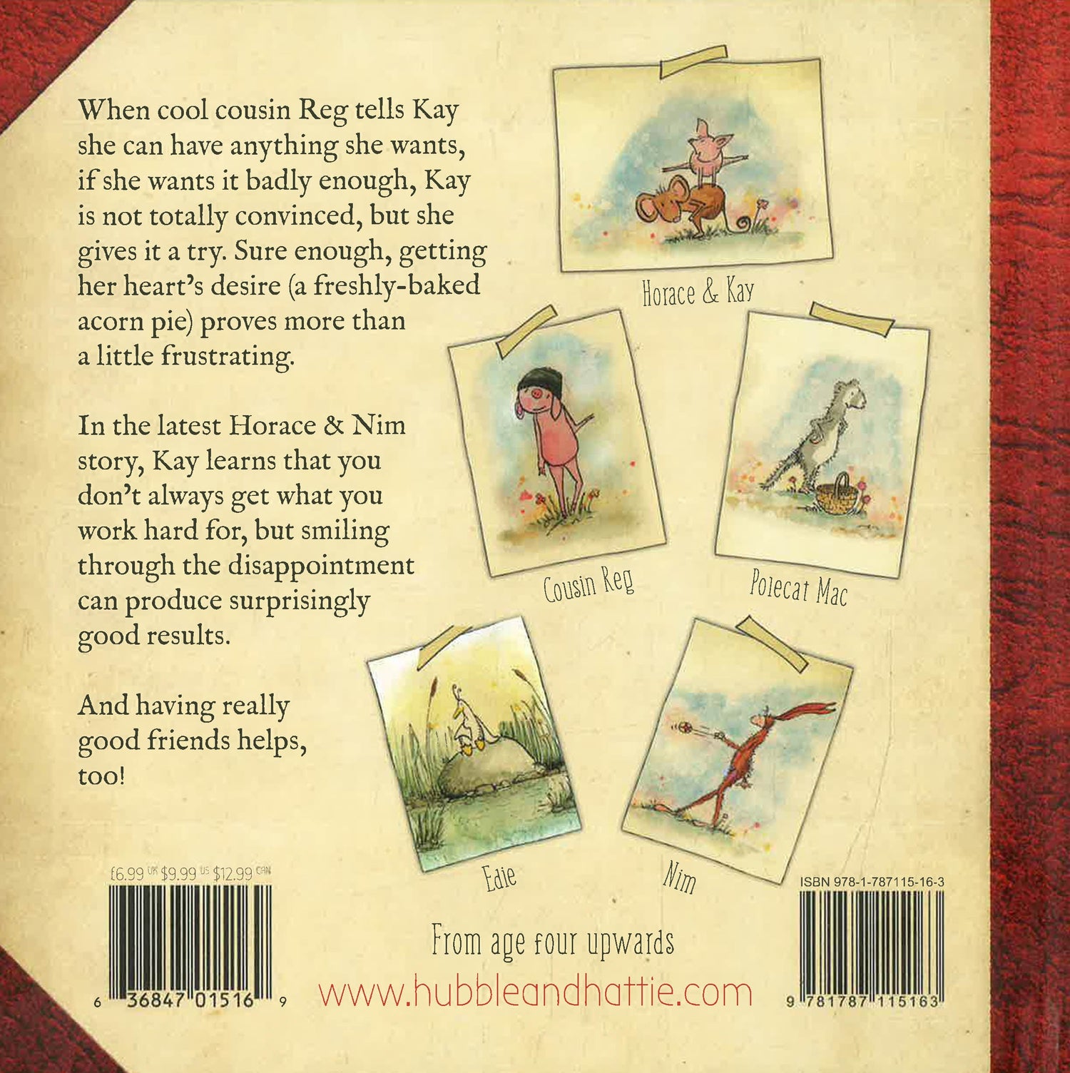 When cool cousin Reg tells Kay that she can have anything she wants, if she wants it badly enough, Kay is not totally convinced, but she gives it a try. Sure enough, getting her heart's desire (a freshly-baked acorn pie) proves more than a little frustrating. Kay learns that you don't always get what you work hard for, but smiling through the disappointment can produce surprisingly good results! And having really good friends helps, too! A beautifully illustrated story book for young children, featuring woodland characters from Chantal Bourgonje's Horace & Nim series, this is sure to delight readers of all ages.