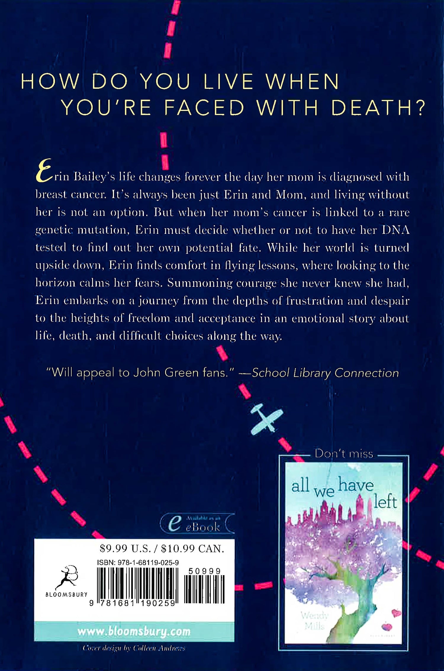 Erin Bailey's life changes forever the day her mom is diagnosed with breast cancer. It's always just been Erin and Mom, so living without her is not an option. Life takes another turn when the cancer is linked to a rare genetic mutation, and Erin must grapple with the decision of whether or not to have her own DNA tested. Her only outlets are flying lessons, where looking to the horizon calms her deepest fears, and her new friend Ashley, a girl she met in an online support group. But when a flash decision has Erin flying away to find her new friend, she embarks on a journey from the depths of despair to new love and a better understanding of the true meaning of beauty.