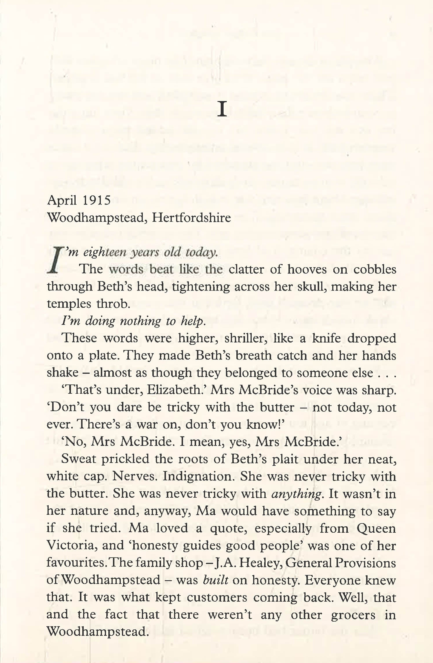 1915. On Beth Healey's eighteenth birthday, she hopes that she will be able to forget the ghastly war and celebrate. But that evening, her twin brother Ned announces that he has signed up to fight.