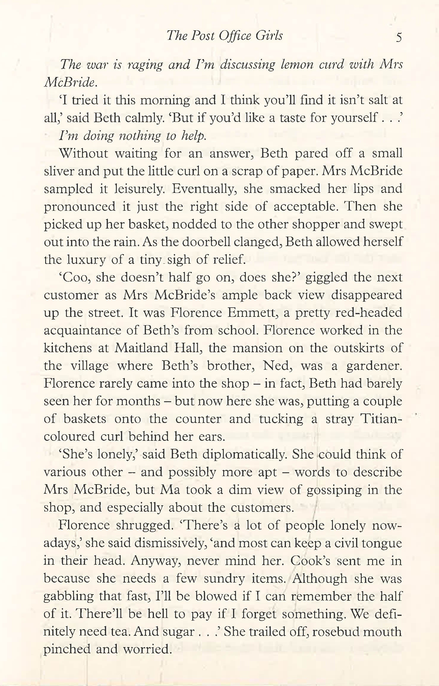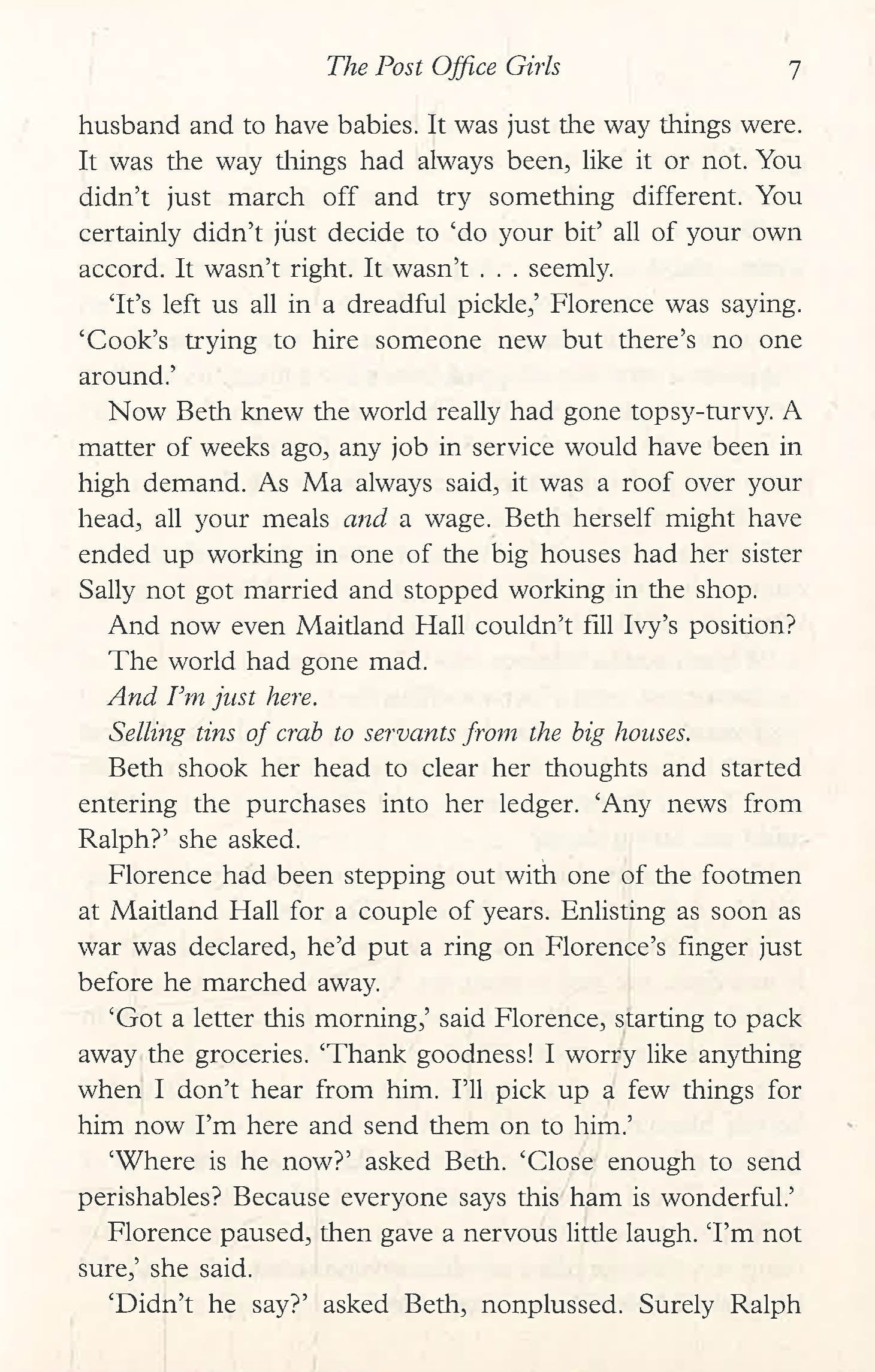 Beth is thrilled to be a crucial part of the war effort and soon makes friends with fellow post girls Milly and Nora, and meets the handsome James. But just as she begins to feel that her life has finally begun, everything starts falling apart, with devastating consequences for Beth and perhaps even the outcome of the war itself. Can Beth and her new friends keep it all together and find happiness at last?