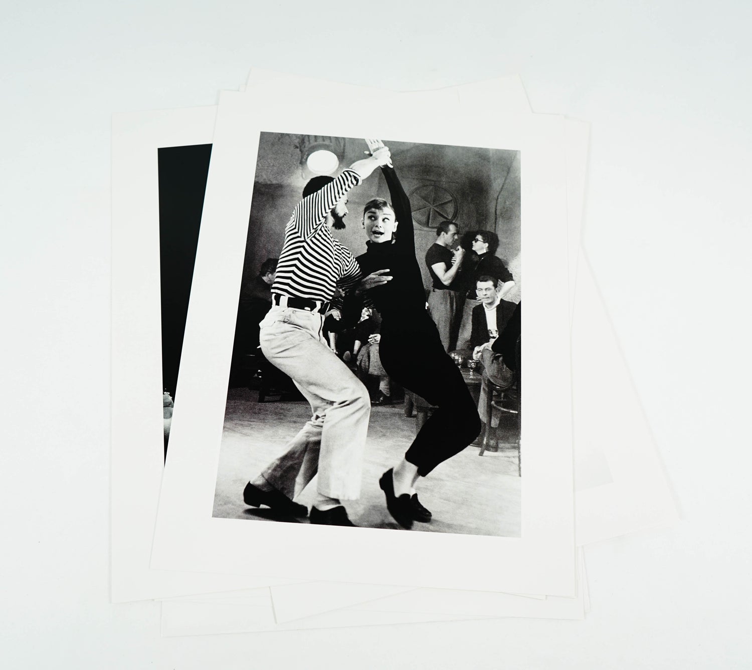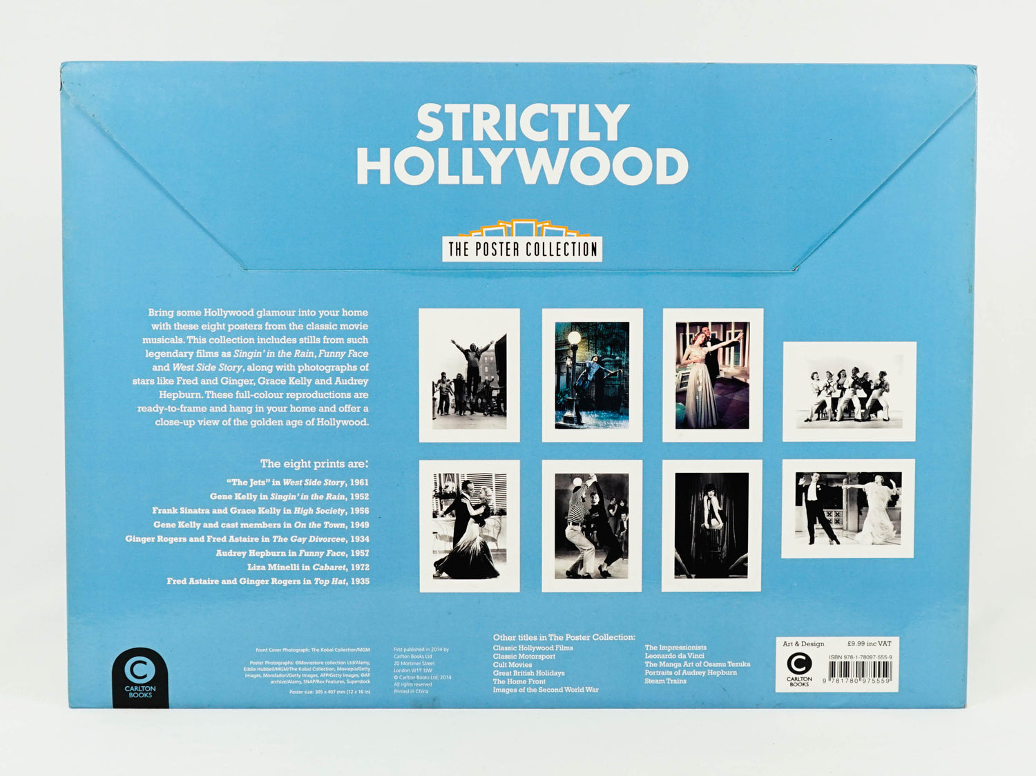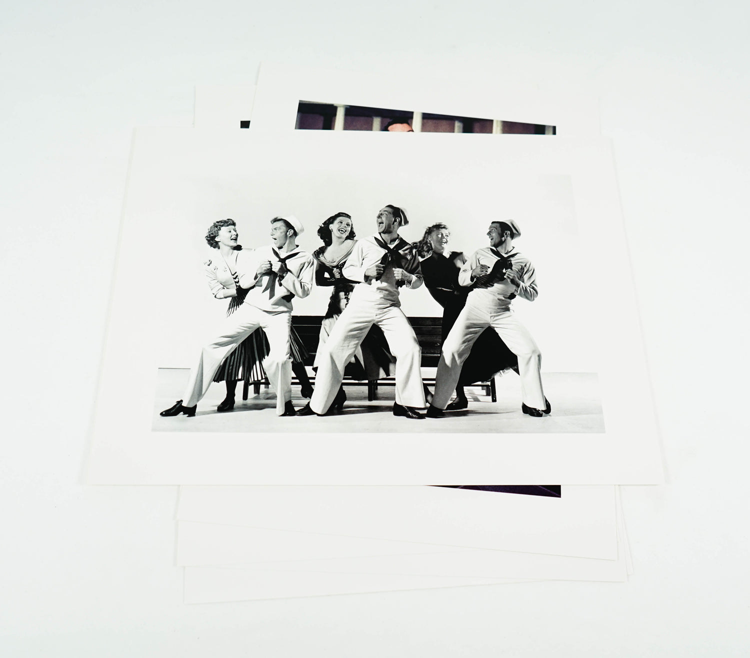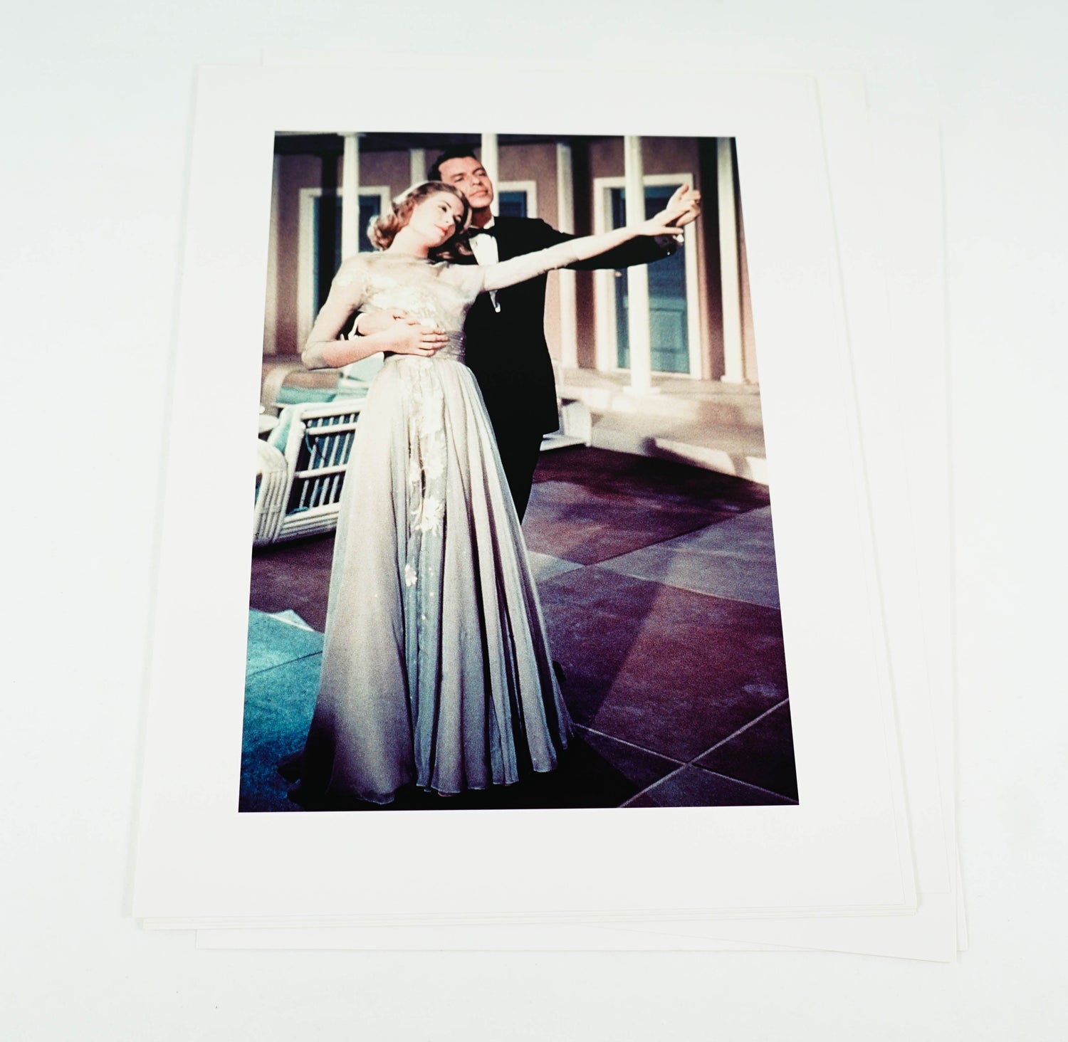 Eight posters, some full color and some black and white, offer a close-up view of the beauty and power involved in dance. Images include Gene Kelly and Leslie Caron in An American in Paris; Fred Astaire and Ginger Rogers in Swing Time; Frank Sinatra singing to Grace Kelly during High Society; astill from On the Town showing Betty Garrett, Frank Sinatra, Ann Miller, Gene Kelly, Jules Munshin, and Vera Ellen; Marge and Gower Champion in Show Boat; Gene Kelly in Singing in the Rain; The Jets dancing in West Side Story; and Audrey Hepburn and Fred Astaire in Funny Face.