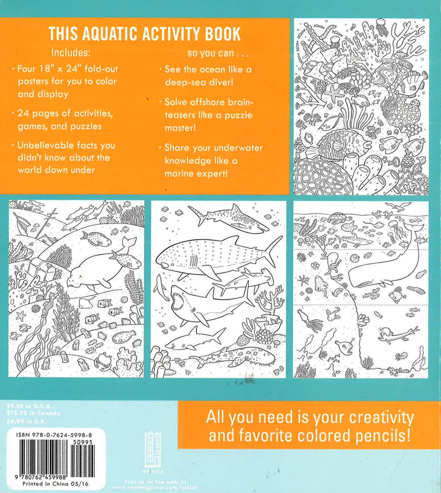 THIS AQUATIC ACTIVITY BOOK Includes: Four 18" x 24" fold-out posters for you to colour and display, 24 pages of activities, games, and puzzles, Unbelievable facts you didn't know about the world down under so you can . . . See the ocean like adeep-sea diver! Solve offshore brainteasers like a puzzle master! Share your underwater knowledge like a marine expert!