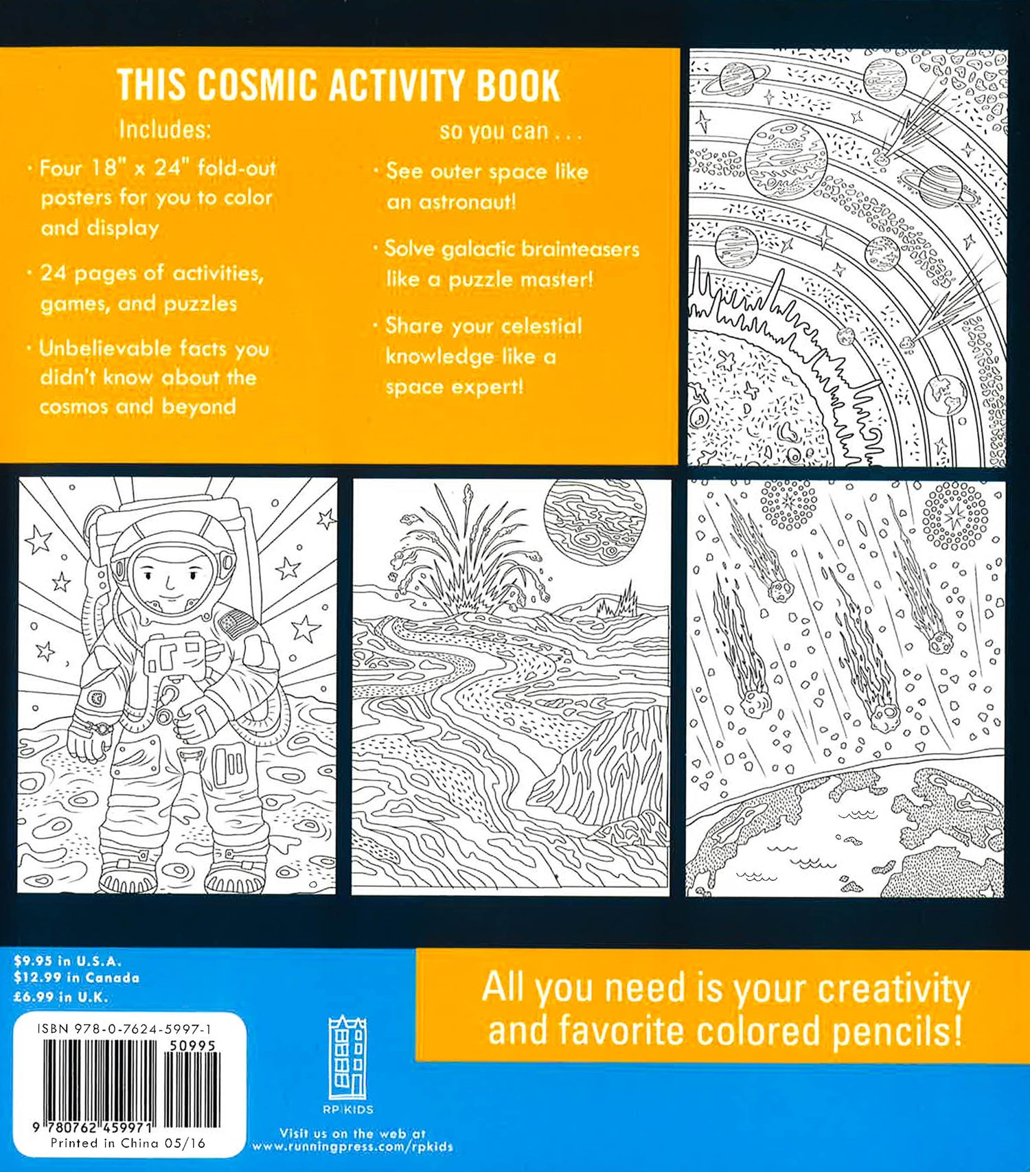 THIS COSMIC ACTIVITY BOOK Includes: Four 18" x 24" fold-out posters for you to colour and display, 24 pages of activities, games, and puzzles, Unbelievable facts you didn't know about the cosmos and beyond so you can . . . See outer space like an astronaut! Solve galactic brainteasers like a puzzle master! Share your celestial knowledge like a space expert!