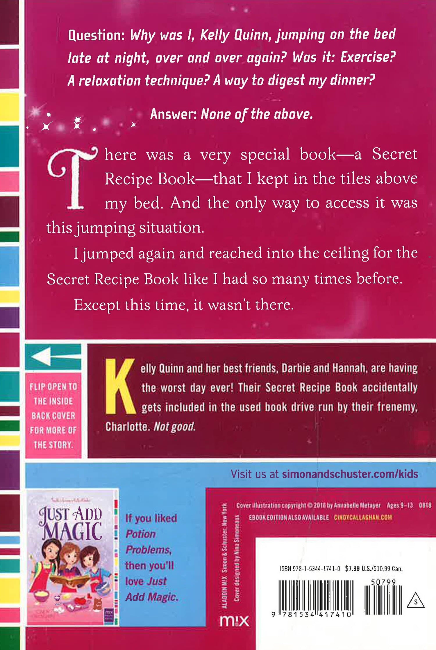Kelly Quinn and her friends must figure out a way to save a beloved local store and find their infamous Secret Recipe Book, which has gone missing in this sequel to Just Add Magic (the inspiration for the family-friendly TV series)! Kelly Quinn and her best friends, Darbie and Hannah, are having the worst day ever! Their Secret Recipe Book accidentally gets included in frenemy, Charlotte's used book drive. Not good.