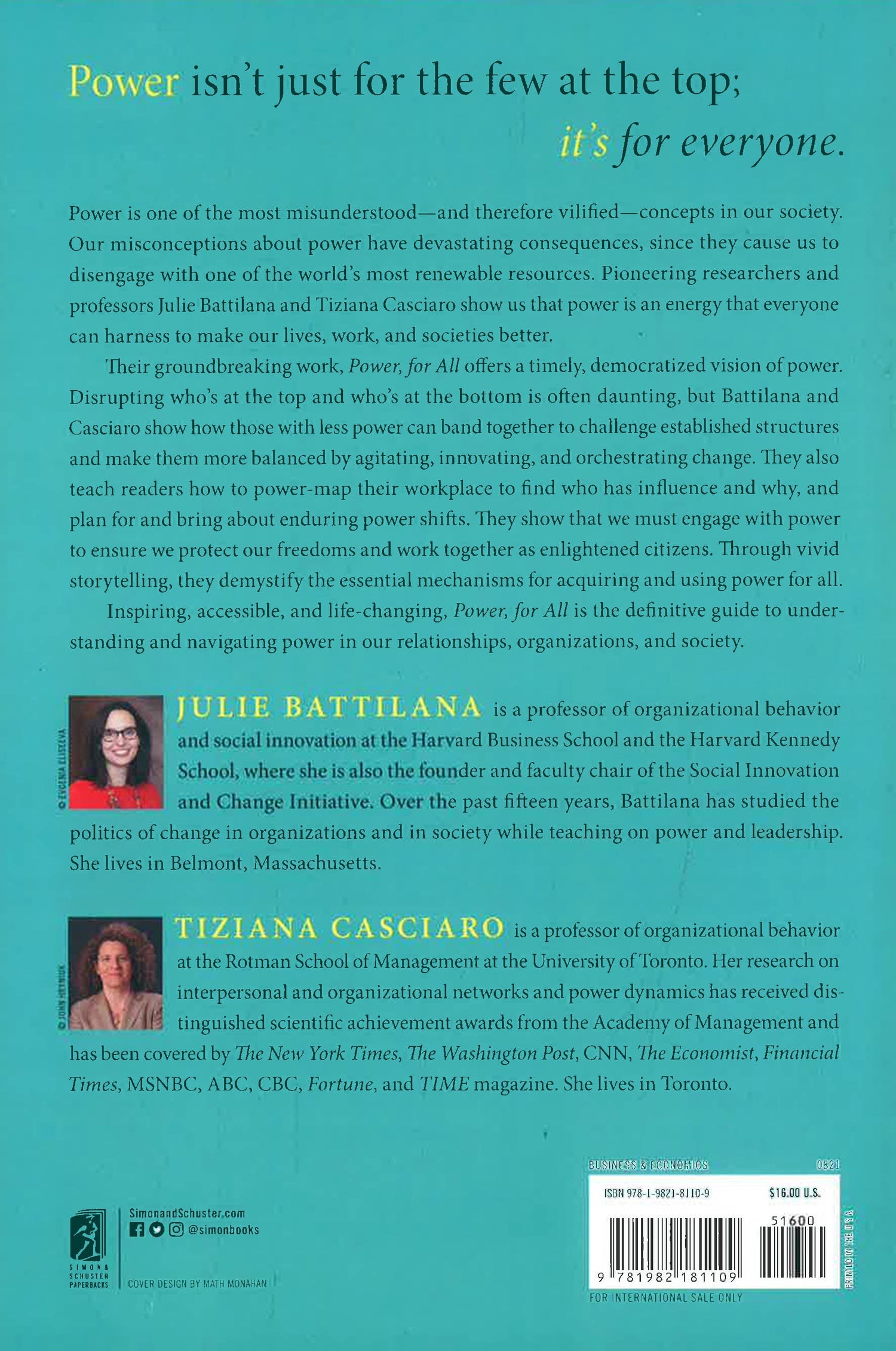 Battilana and Casciaro offer a timely, democratized vision of power. While hierarchies tend to stay in place because power is often sticky, by agitating, innovating, and orchestrating change, they show how those with less power can challenge established structures to make them more balanced. They teach readers how to power-map their workplace to find who can create real change at work, plan for and cause sustaining power shifts, and understand the five motivations for seeking power—money and status, but also autonomy, achievement, affiliation, and morality. They explore how these dynamics play out through vivid storytelling: as Dontella Versace successfully leads her brother’s company after his death—despite having a title, but little influence; what social movements can learn from youth climate activists and how they can go farther; and how a manager can gain the trust of skeptical employees and improve the workplace. Ultimately, Power for All demystifies the essential mechanisms for acquiring and using power for all people.