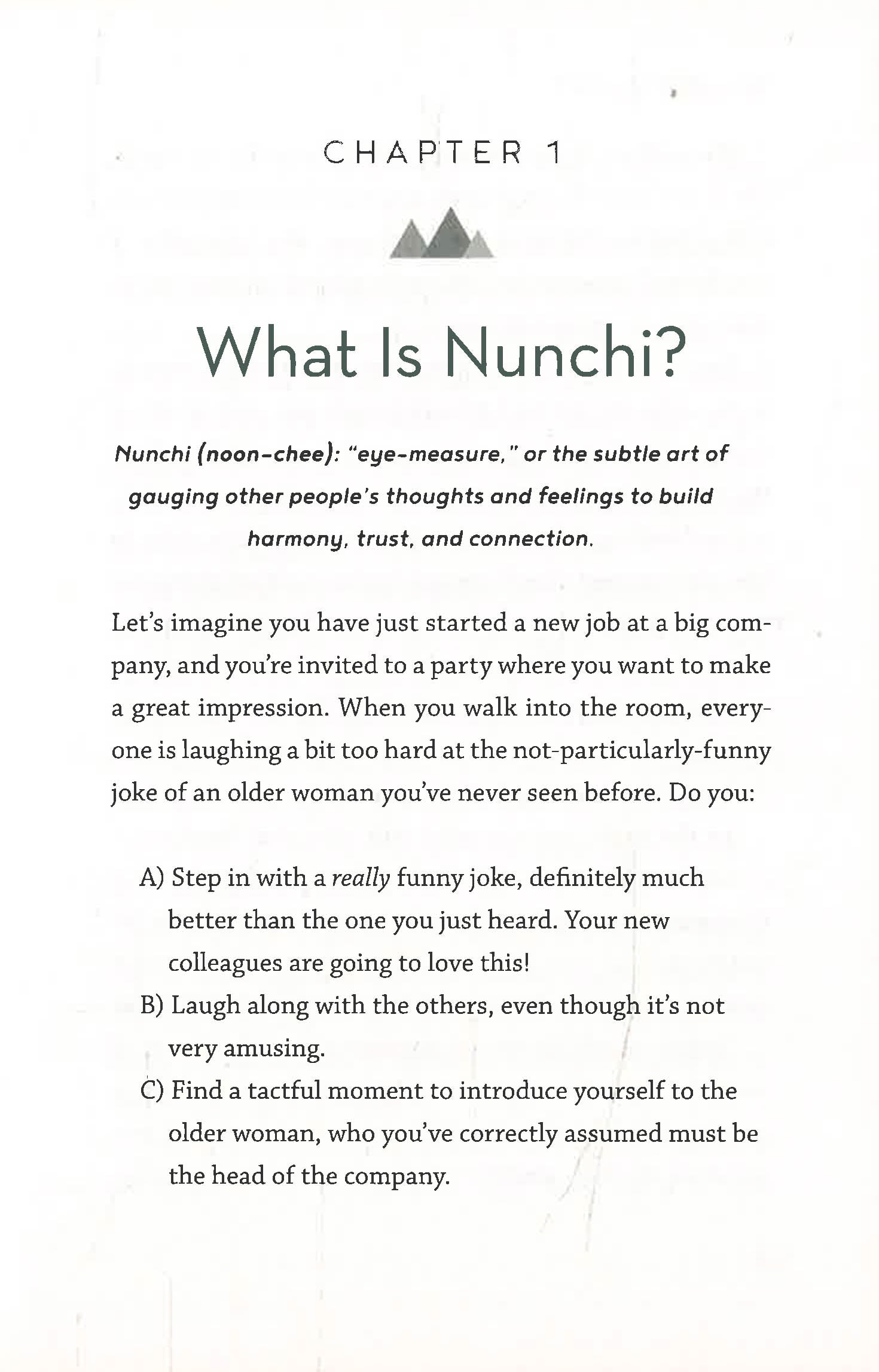 Have you ever wondered why your less-skilled coworker gets promoted before you, or why that one woman from your yoga class is always surrounded by adoring friends? They probably have great nunchi. The art of reading a room and understanding what others are thinking and feeling, nunchi is a form of emotional intelligence that anyone can learn--all you need are your eyes and ears. Sherlock Holmes has great nunchi. Cats have great nunchi. Steve Jobs had great nunchi. With its focus on observing others rather than asserting yourself--it's not all about you!--nunchi is a refreshing antidote to our culture of self-promotion, and a welcome reminder to look up from your cell phone.