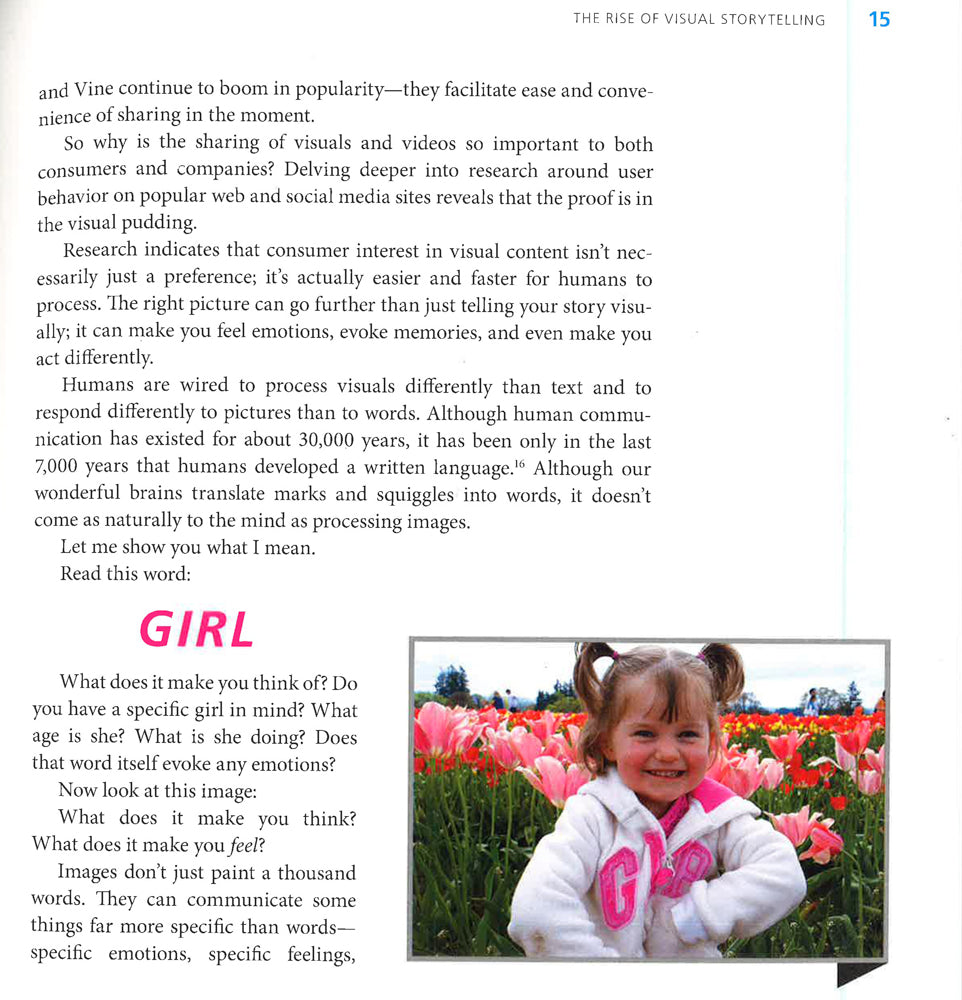 Attention is the new commodity. Visual Storytelling is the new currency.Human brain processes visuals 60,000x faster than text.Web posts with visuals drive up to 180% more engagement than those without.Viewers spend 100% more time on web pages with videos.Filled with full-color images and thought-provoking examples from leading companies, The Power of Visual Storytelling explains how to grow your business and strengthen your brand by leveraging photos, videos, infographics, presentations, and other rich media. The book delivers a powerful road map for getting started, while inspiring new levels of creativity within organizations of all types and sizes."This book is not only a complete overview of [visual storytelling] but, most importantly, the key to doing it right, a total Right Hook!"-Gary Vaynerchuk, New York Times bestselling author of Crush It! and Jab, Jab, Jab, Right Hook"A valuable guide to understanding how to develop powerful marketing programs using the art of visual storytelling."-Guy Kawasaki, author of APE: Author, Publisher, Entrepreneur and former chief evangelist of Apple"The Power of Visual Storytelling is the new marketing bible!"-Nancy Bhagat, Vice President, Global Marketing Strategy and Campaigns, Intel"If a picture is worth a thousand words, The Power of Visual Storytelling is worth a million."-Scott Monty, Global Digital & Multimedia Communications for Ford Motor Company