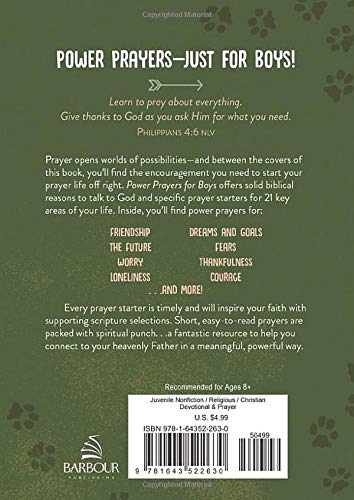 Power Prayers for Boys offers solid biblical reasons to talk to God and specific prayer starters for 21 key areas of your life. Chapters address topics such as Courage, Competition, Fears, Friendship, Dreams and Goals, Doing the Right Thing, Honesty, and Being Thankful. Every prayer starter is timely and will encourage your spirit with supporting scripture selections. Short, easy-to-read prayers are packed with spiritual punch. . .a fantastic resource to help you connect to your heavenly Father in a meaningful, powerful way.
