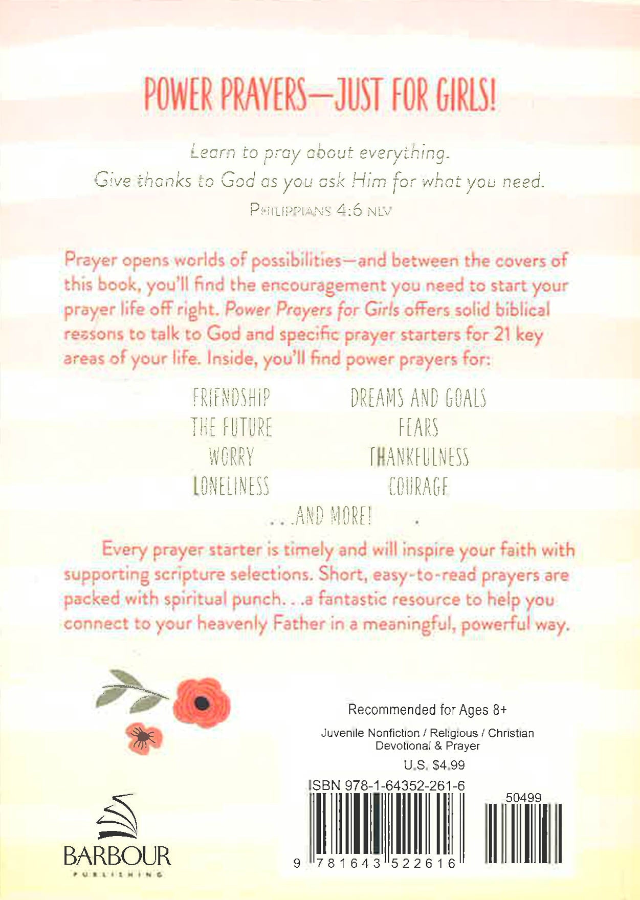 Power Prayers for Girls offers solid biblical reasons to talk to God and specific prayer starters for 21 key areas of your life. Chapters address topics such as Friendship, Future, Worry, Loneliness, Dreams and Goals, Fears, Thankfulness, and Courage. Every prayer starter is timely and will touch your heart with supporting scripture selections. Short, easy-to-read prayers are packed with spiritual punch. . .a fantastic resource to help you connect to your heavenly Father in a meaningful, powerful way.