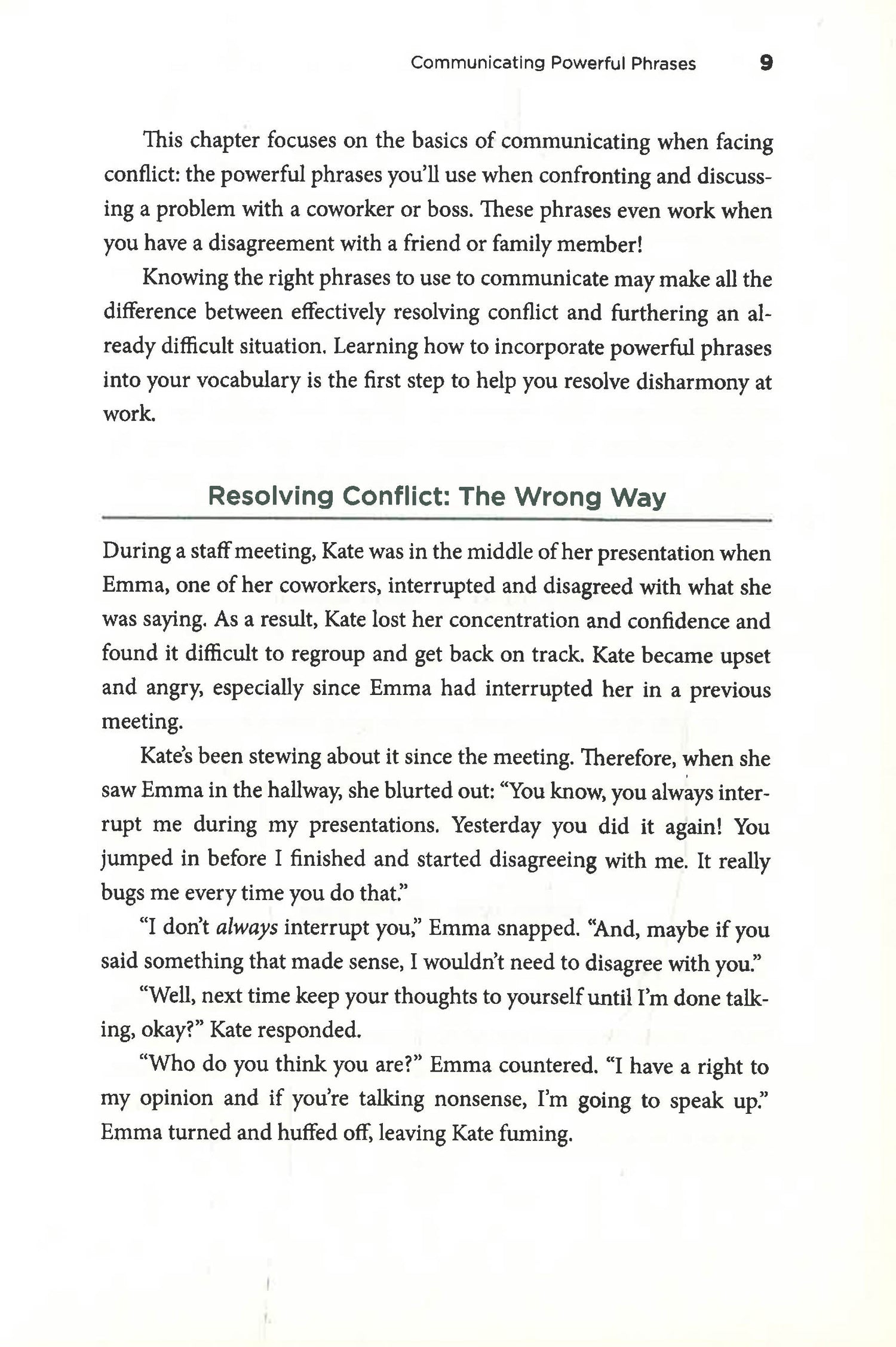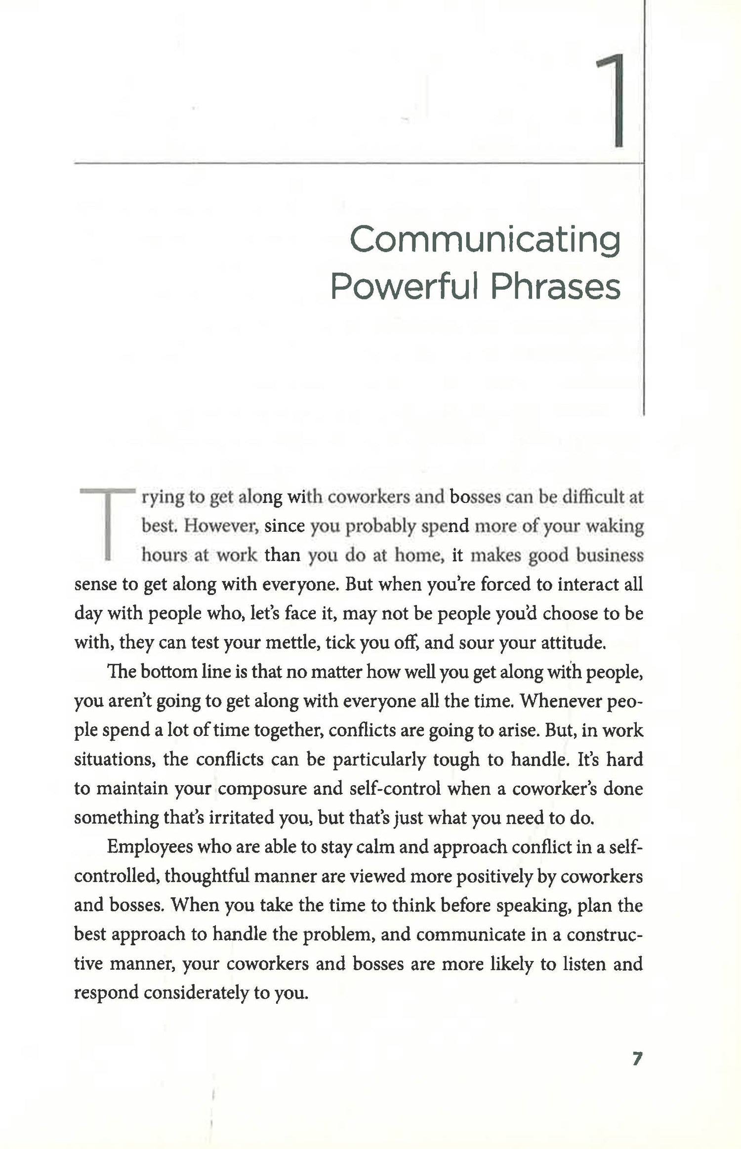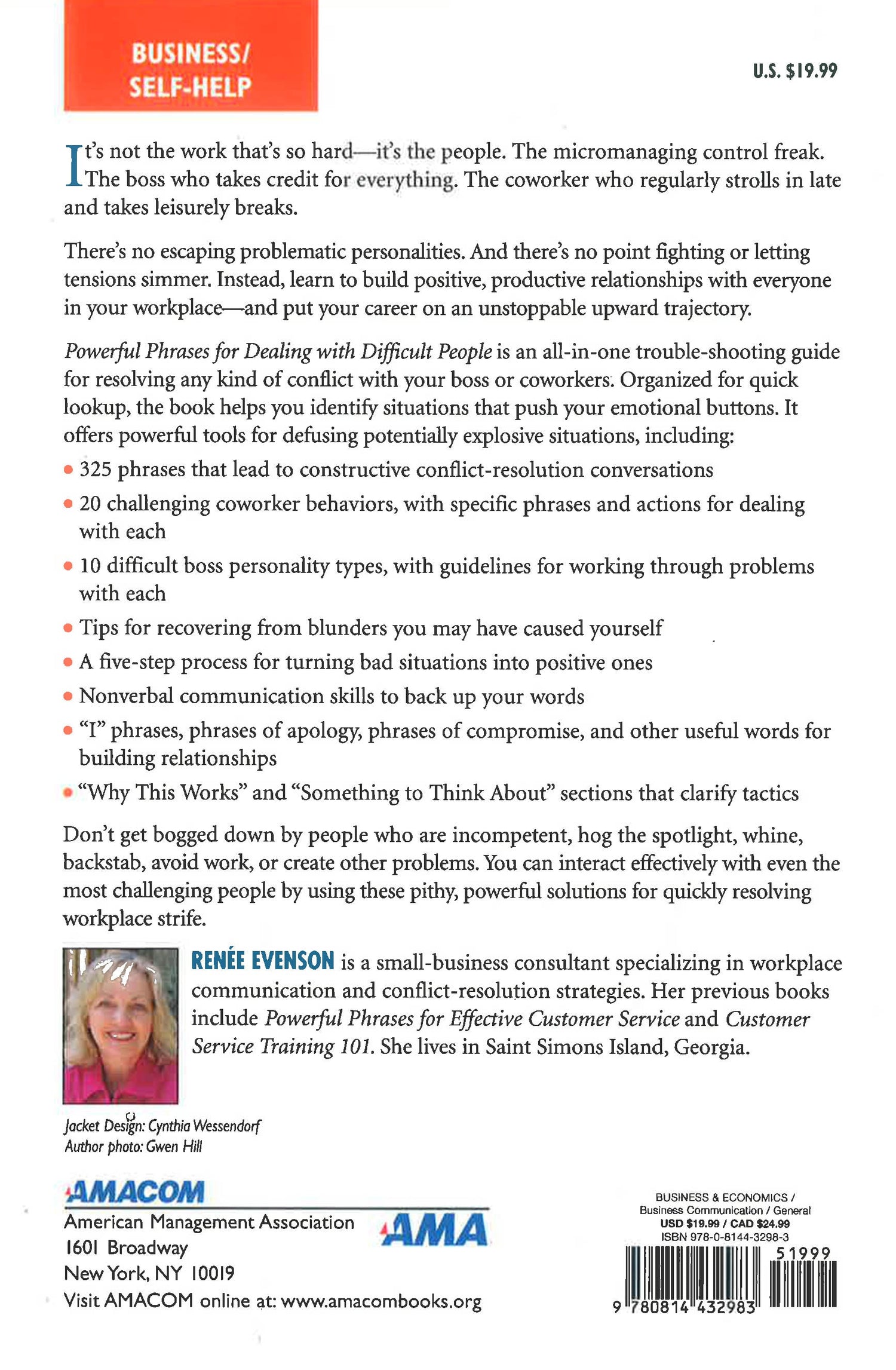 The key to a harmonious, highly effective work environment is not by ensuring you work among carbon-copies of yourself whose personalities never clash with one another or with you. That pipe dream could not ever happen, nor would it result in a successful team collaboration even if it could. Instead, most of us are going to work today with individuals who at times come across as incompetent, lazy, spotlight-hugging, whiny, or backstabbing. And then tomorrow we go to work with them again . . . and again . . . and again.Like it or not, the bulk of our waking hours are spent with people at work--people who can grate on our nerves. Therefore, learning to interact effectively with difficult employees, colleagues, and bosses is an absolute essential for our success. With Powerful Phrases for Dealing with Difficult People, anyone can learn how to confront head-on the difficult situations that can arise when dealing with these personalities, before they fester and spread. Helpful features inside this practical and easy-to-use book include:• Thirty common personality traits, behaviors, and workplace scenarios along with the phrases that work best with each • Nonverbal communication skills to back up your words • Sample dialogues that demonstrate how phrasing improves interactions • A five-step process for moving from conflict to resolution • “Why This Works” sections that provide detailed explanationsButton-pushing situations are going to come up today at work--and tomorrow too. Don’t let them rent space inside of you and turning everything to mold. Instead, choose to deploy simple phrases to regain control and resolve conflicts. When you do, you, your colleagues, and your company will be all the better for it!