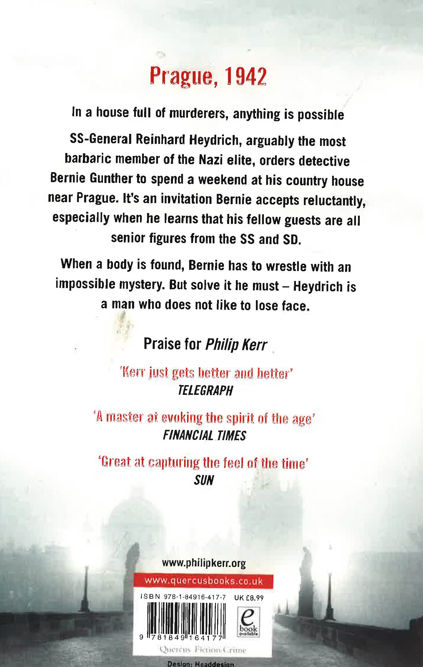 He begins to investigate the death of a railway worker, but is obliged to drop everything when Reinhard Heydrich of the SD orders him to Prague to spend a weekend at his country house. Bernie accepts reluctantly, especially when he learns that his fellow guests are all senior figures in the SS and SD.