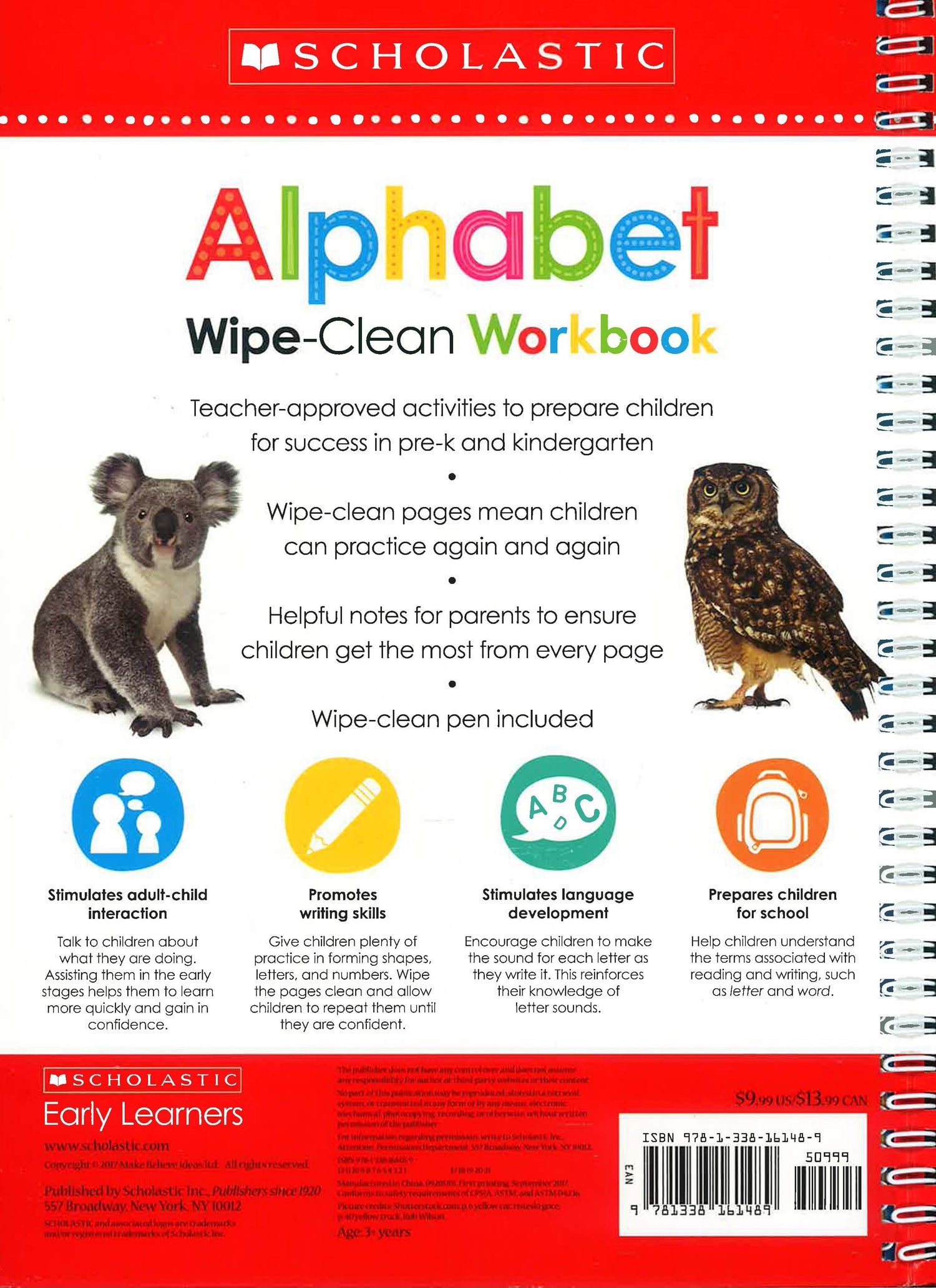 This interactive workbook boosts essential preschool skills. Featuring pictures, shapes and patterns for children to trace, the wipe-clean workbook allows for repeated practice that will build future writing confidence and achievement.56 pages of activities focused on important preschool skills, including: upper- and lowercase letters, tracing, writing, and language development. Builds fine motor skillsSpiral-bound wipe-clean pages allow for repeated practiceIncludes a wipe-clean pen and high gloss wipe-clean pagesAimed at children ages 3-5Bright, colorful pages blend photographs and illustrations to make this workbook one of the most eye-catching and engaging availableTeacher approved!Scholastic Early Learners is a dedicated learning program that builds school skills from infancy through second grade. Created by experts and focused on reinforcing curriculum topics and current academic guidelines with kid-friendly activities, this educational line is the best partner in your child's learning journey.Scholastic Early Learners: The Most Trusted Name in Learning!