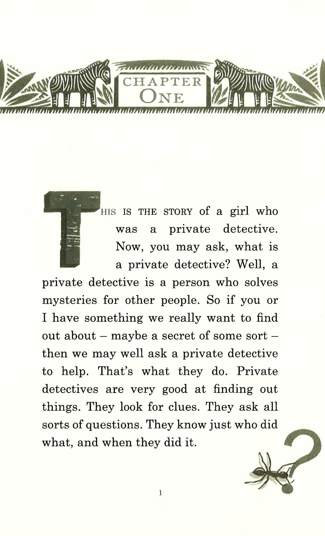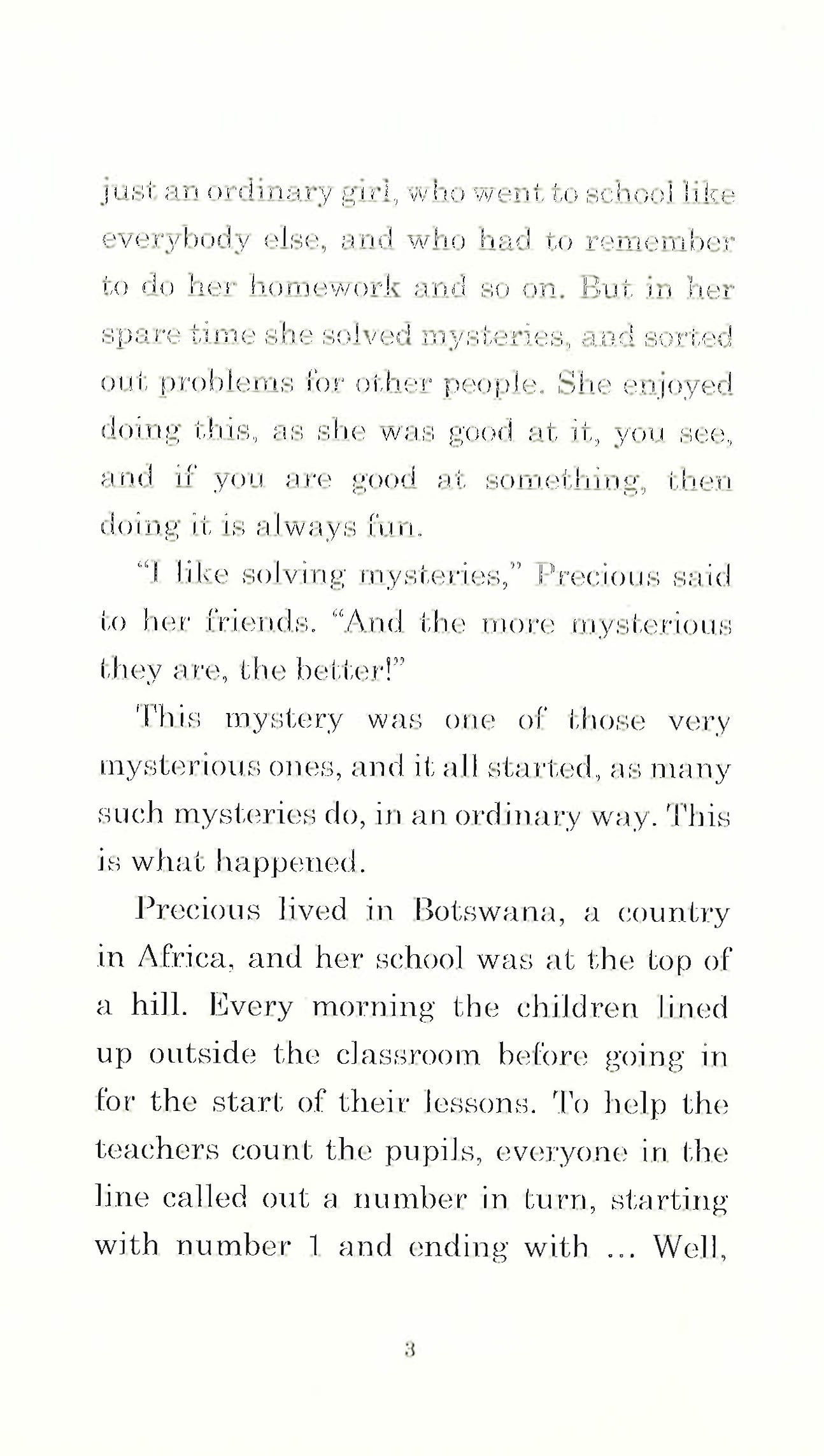 A new pupil, Nancy, arrives at Precious Ramotswe's school, and the two girls soon become firm friends. When Precious finds out that all Nancy has to remind her of her missing parents is a photograph and a necklace of beautifully carved zebras, she offers to help find them. This is the start of an exciting adventure that leads the two girls deep into the remotest parts of Botswana, where they meet an old lady who recognises the necklace and has some extraordinary news for Nancy.