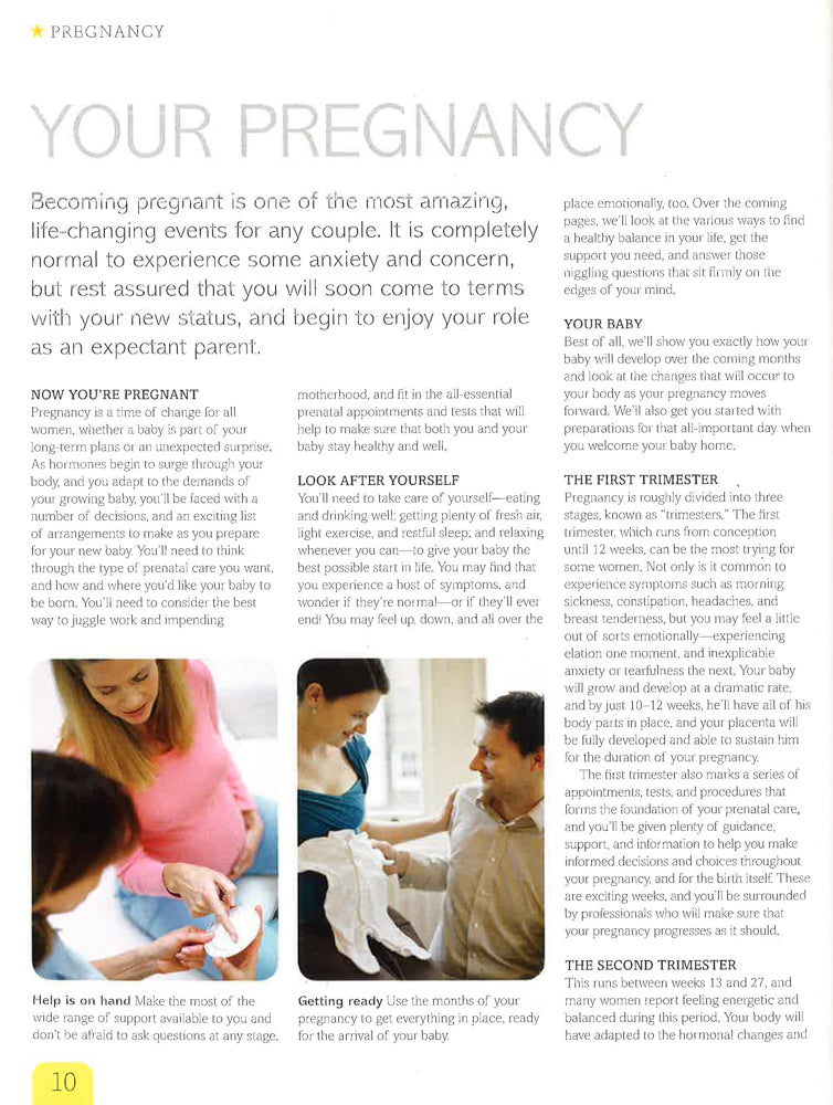 Provides a guide for dealing with pregnancy, childbirth, and newborns that includes calculating delivery dates, changes that an expecting mother experiences, baby delivery options, stages of labor, and breastfeeding tips.