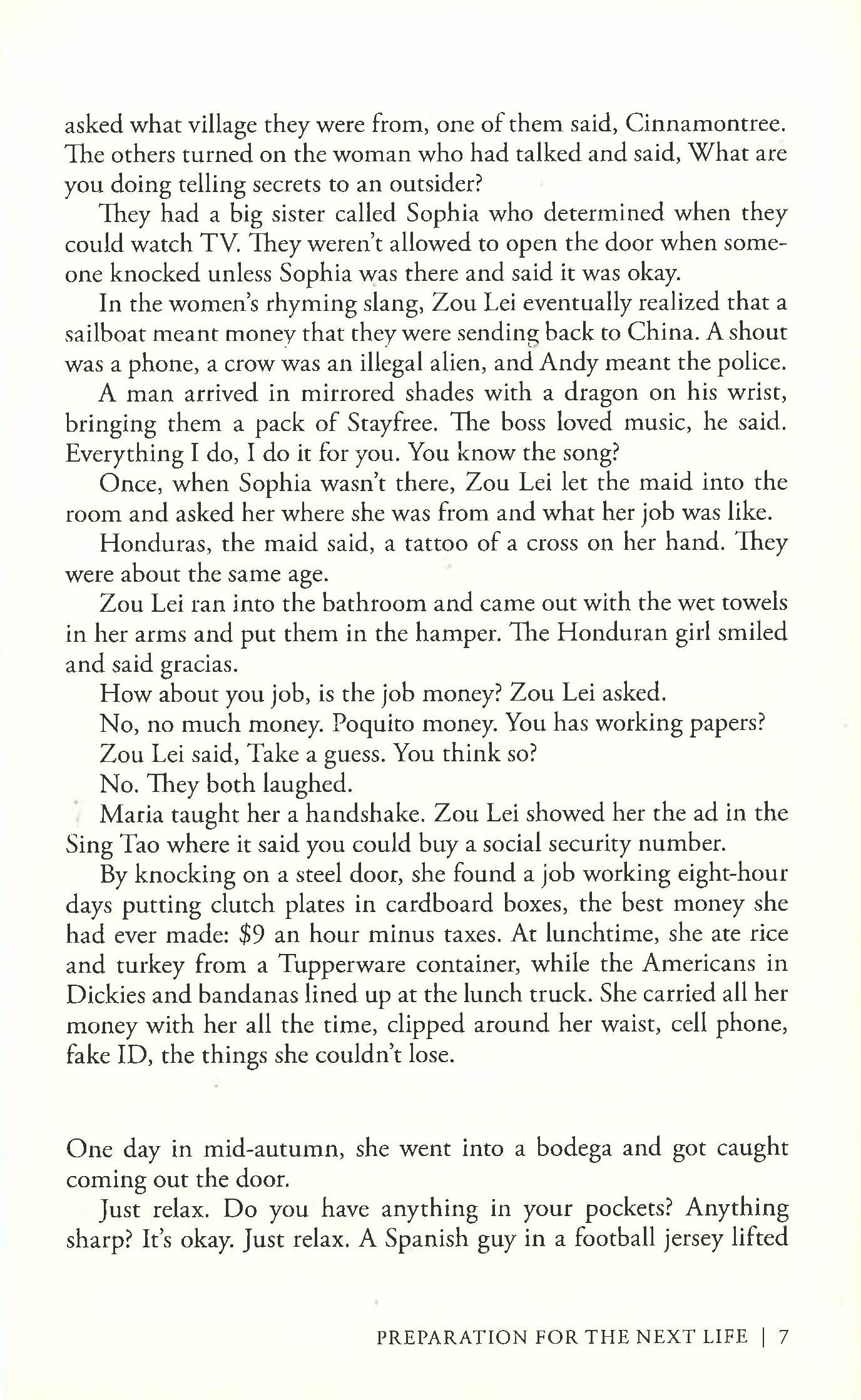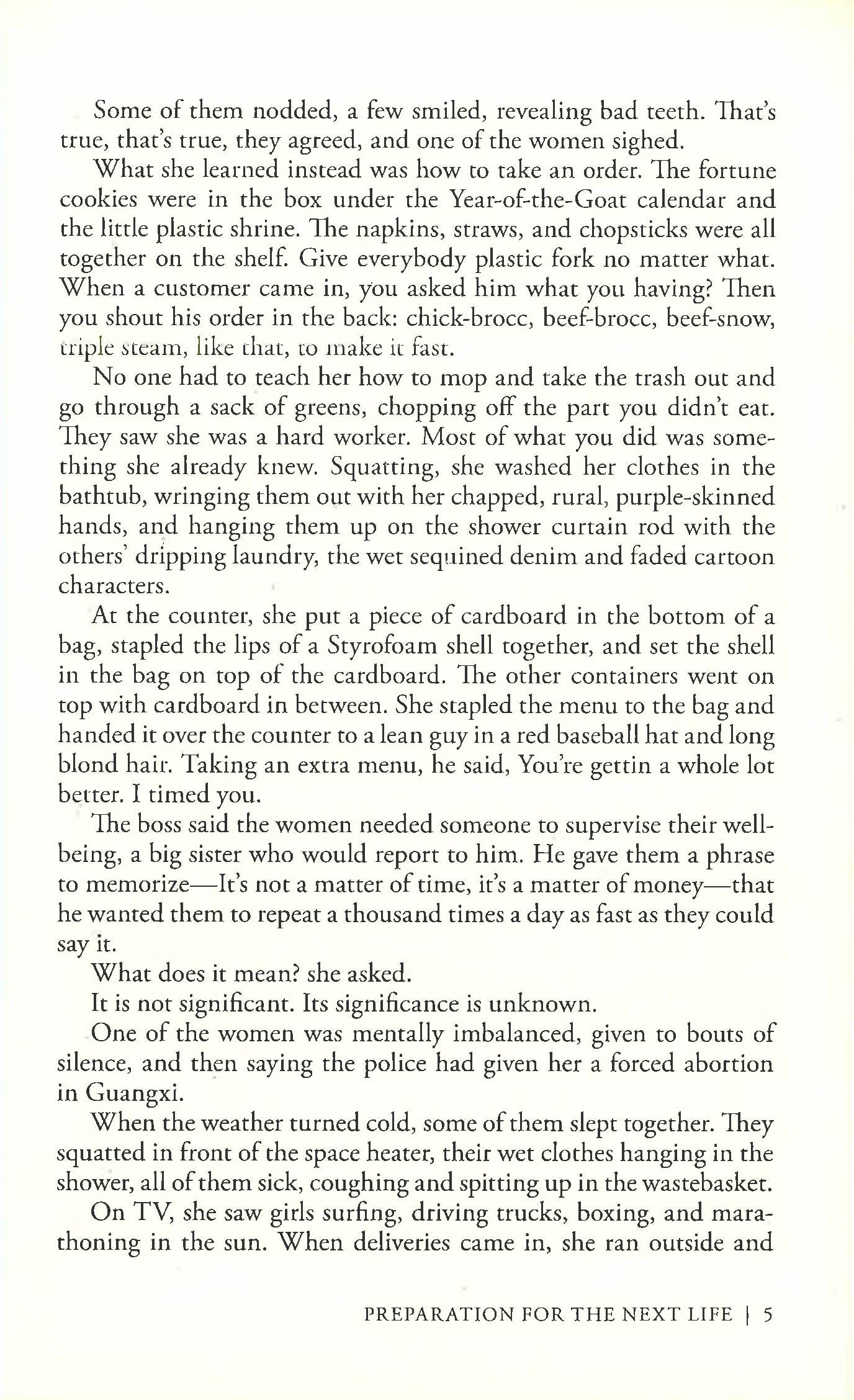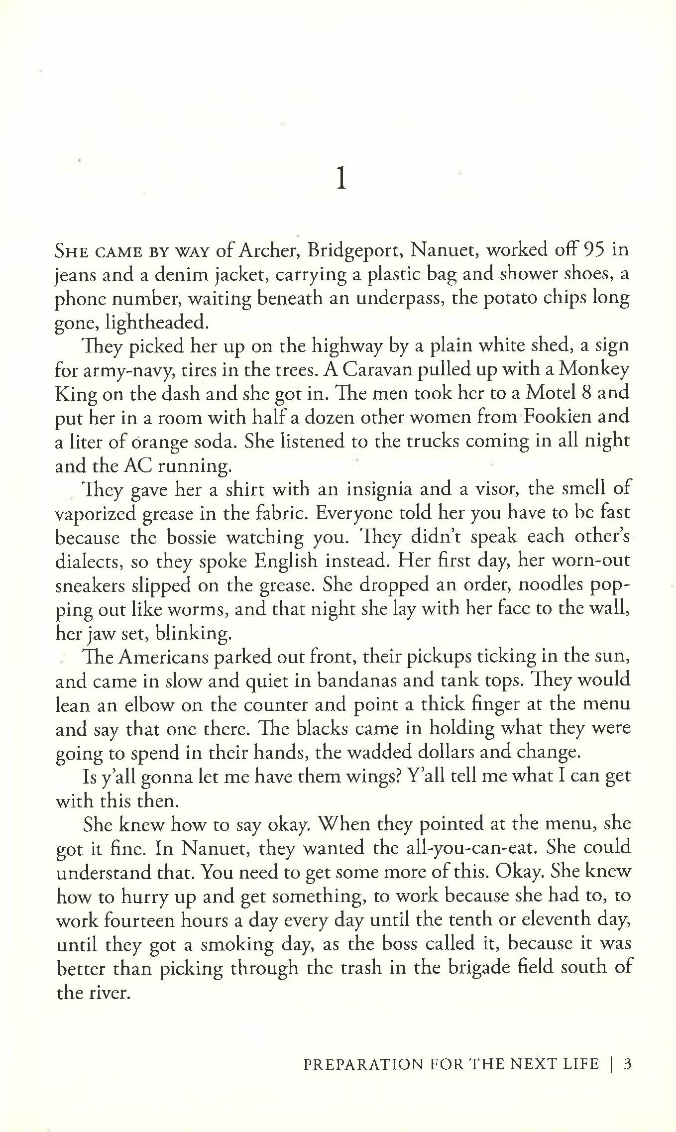 In post-9/11 New York, Zou Lei is an illegal immigrant from northwest China. Forced to work fourteen-hour days and live in squalor, she nevertheless embraces the many freedoms her adopted homeland has to offer. Damaged by three tours in Iraq, veteran Brad Skinner comes to New York with the sole intention of partying as hard as he can in order to forget what he's seen. Impulsive and angry, Skinner's re-entry into civilian life seems doomed. But when he meets Zou Lei they discover that new beginnings may be possible for both of them, that is if they can survive homelessness, lockup and Skinner's post-traumatic stress disorder. Set in the underbelly of New York, Preparation for the Next Life exposes an America as seen from the fringes of society in devastating detail and destroys the myth of the American Dream through two of the most remarkable characters in contemporary fiction.