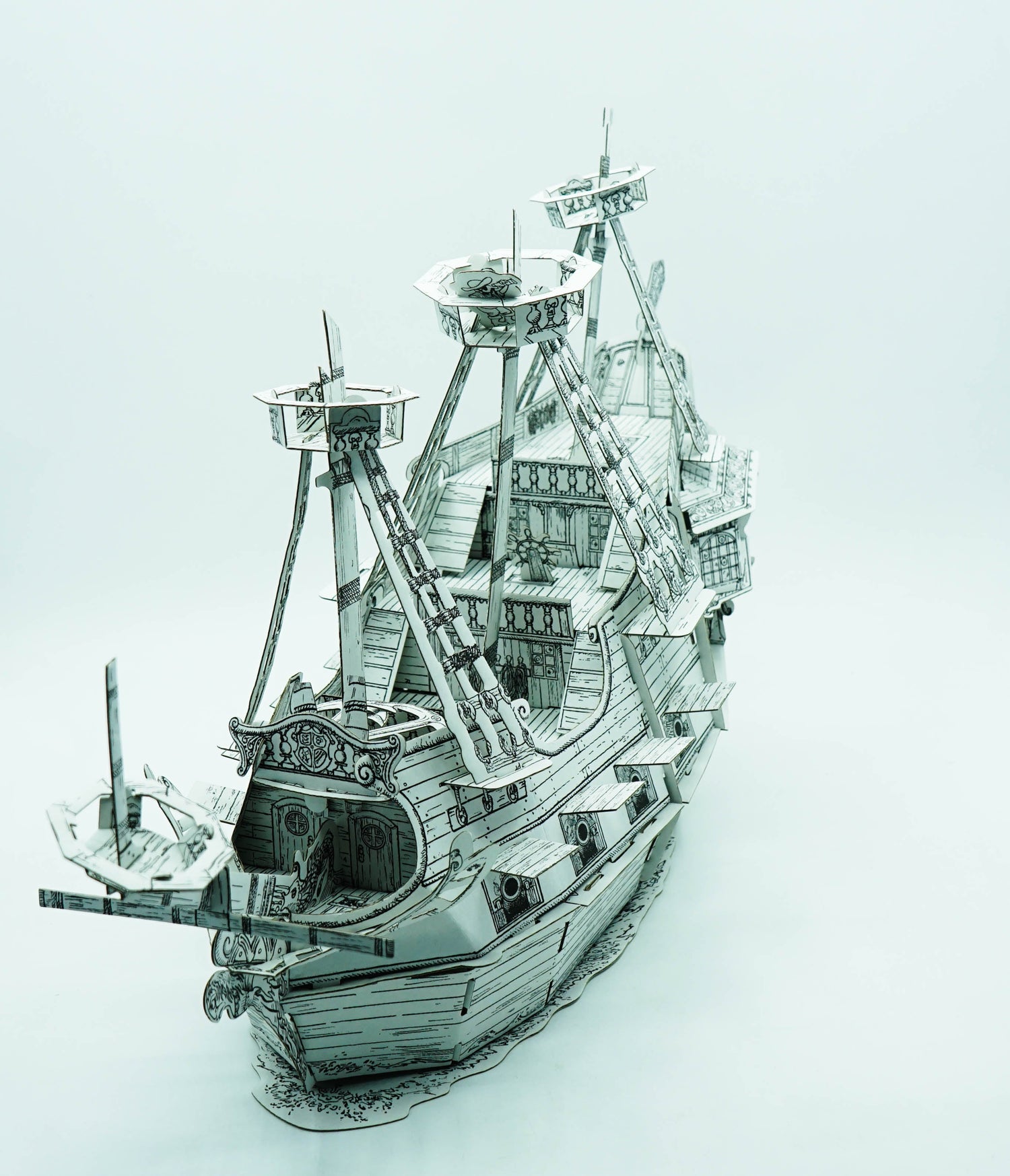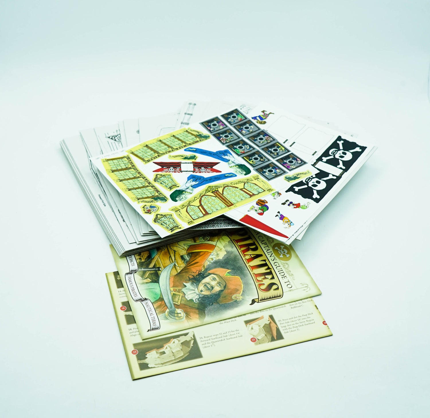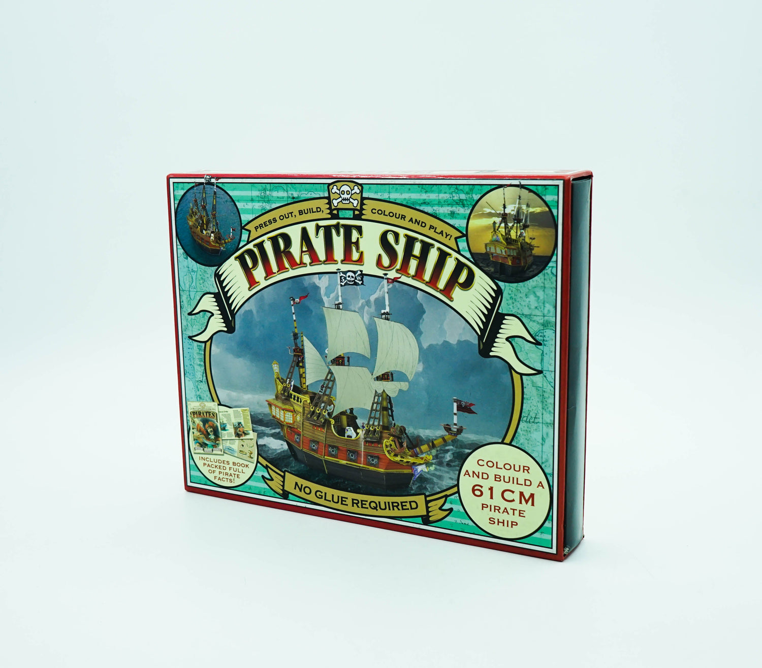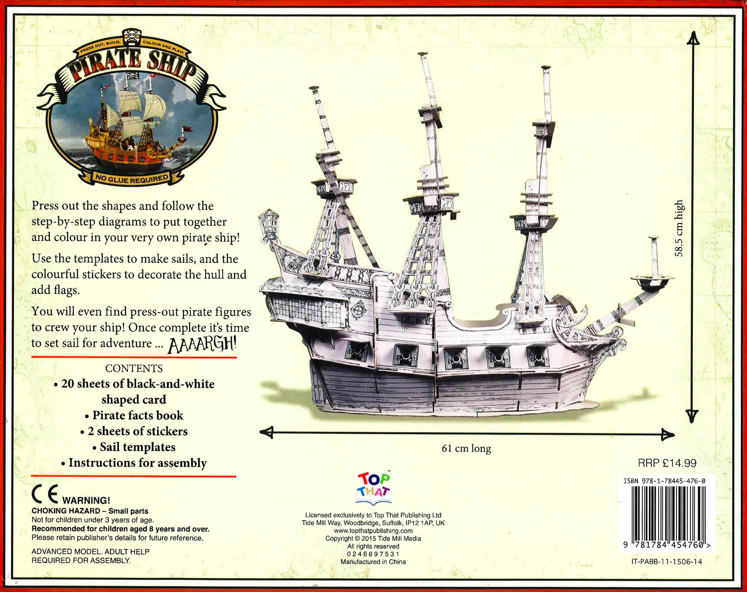 Press out the shapes and follow the step-by-step diagrams to put together and colour in your own "pirate ship!" Use the templetes to make sails, and the colourful stickers to decorate the hull and add flags. You will even find press-out pirrate figures to crew your ship! Once complete it's time to set sail for adventure.......aaaargh!