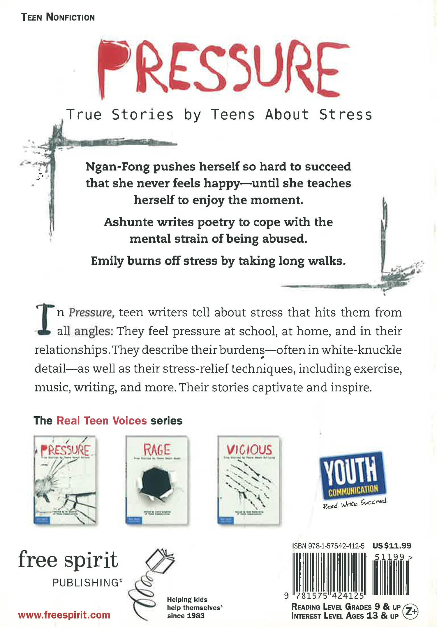Youth Communication. Gritty, honest personal stories from teens offer courage and hope in the face of bullying, stress, and anger. Teenagers open up to tell personal stories that tackle difficult, real-life issues. Direct, revealing, and often raw, these voices will ring true for any teen reader who has faced bullying, anger, or stress. Each piece has been selected and edited to appeal to reluctant and emerging readers as young as seventh grade. Readers will be inspired by the writers' courage and strength in working hard to overcome problems both large and small. It will engage reluctant readers. Books include tips for teens to get more out of the books. Free online download provides discussion and training guidelines for adults. Stress hits these teens from all angles: pressure at school, at home, and in their relationships. The writers describe their stress relief techniques, including exercise, music, writing, and more, and offer inspiring examples of perseverance. Includes tips for cooling down.