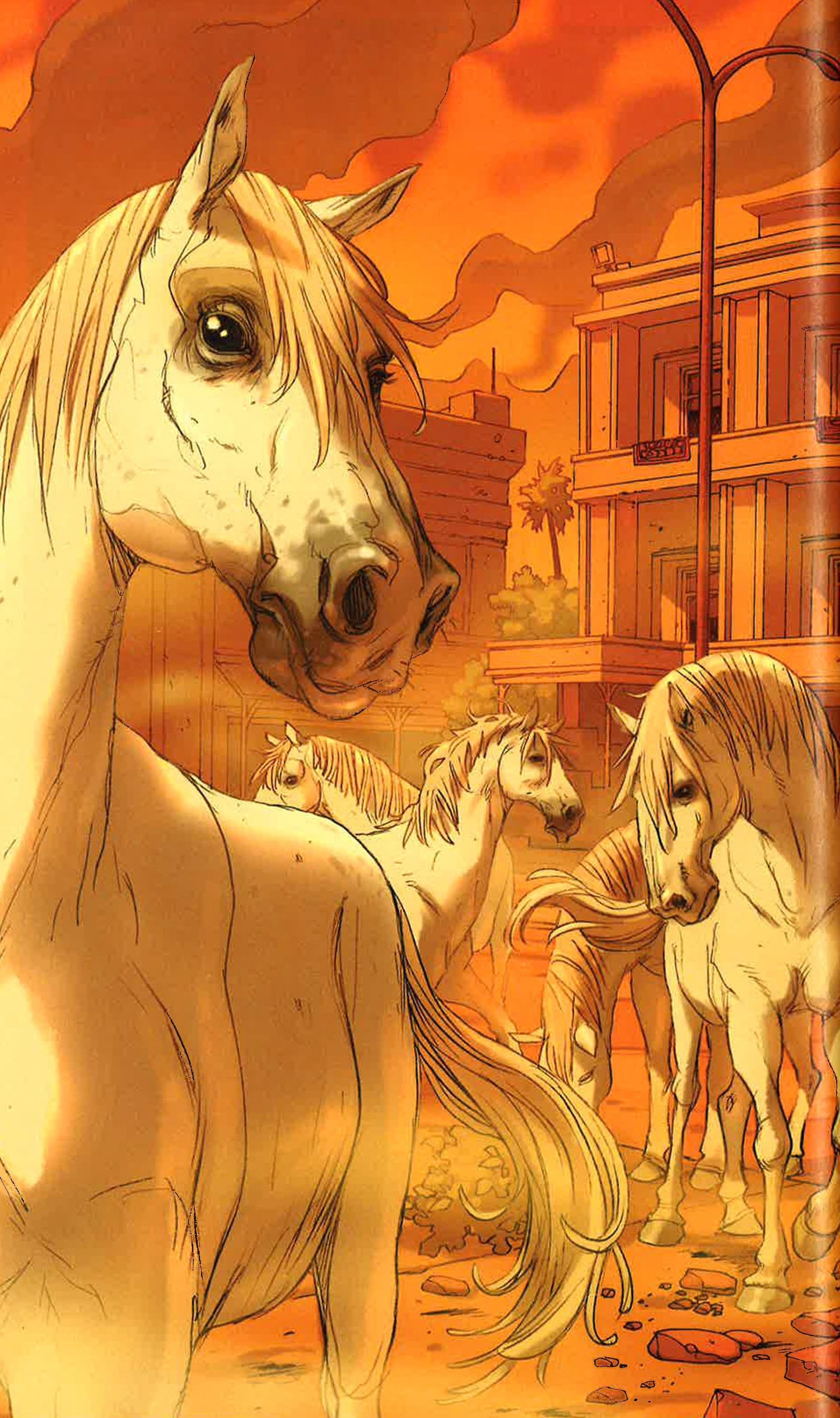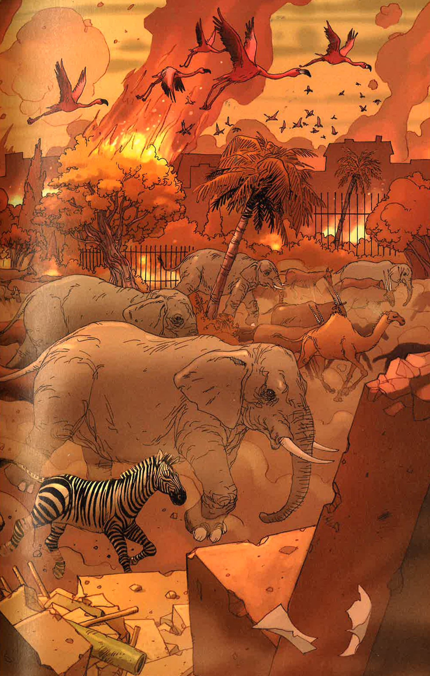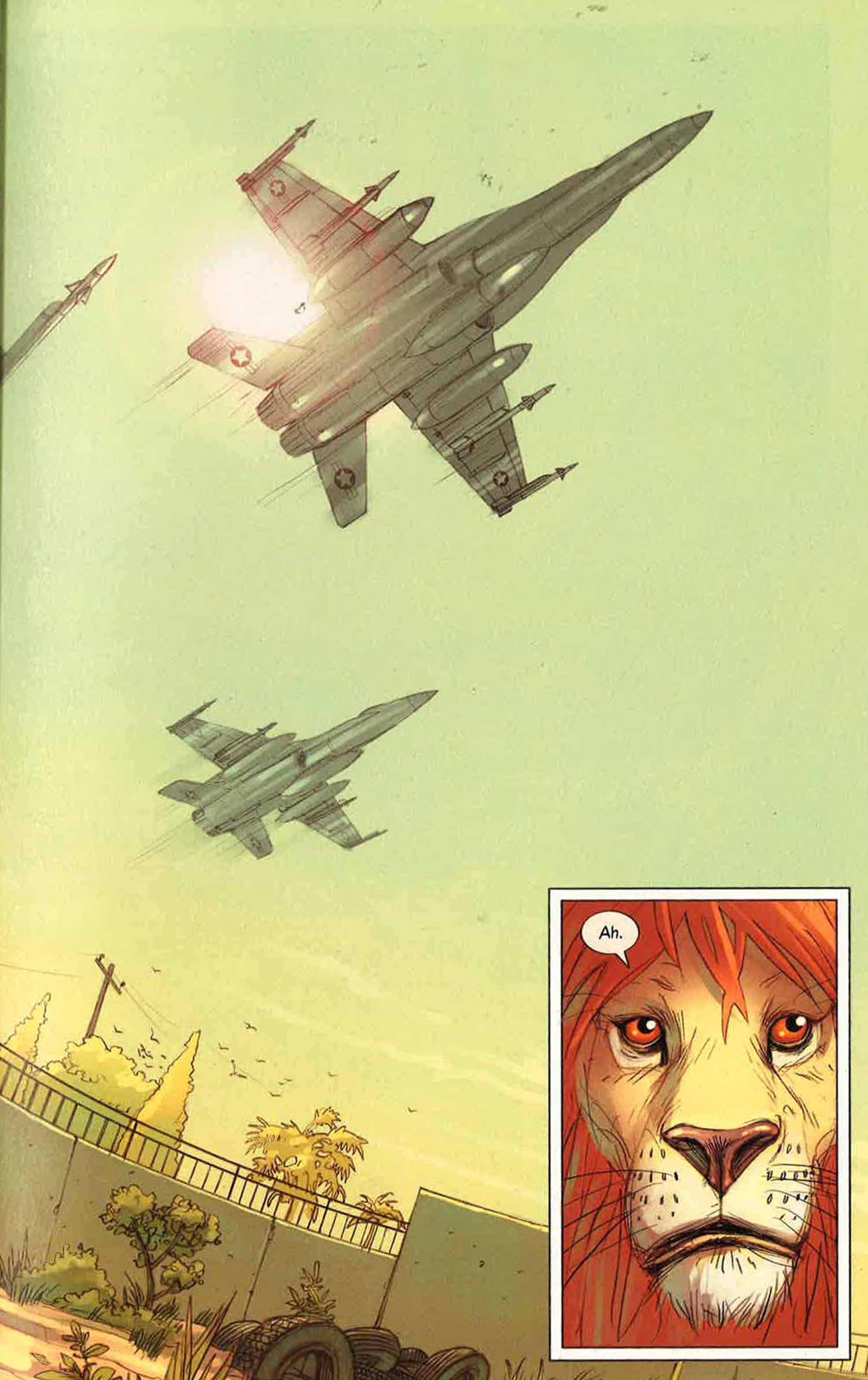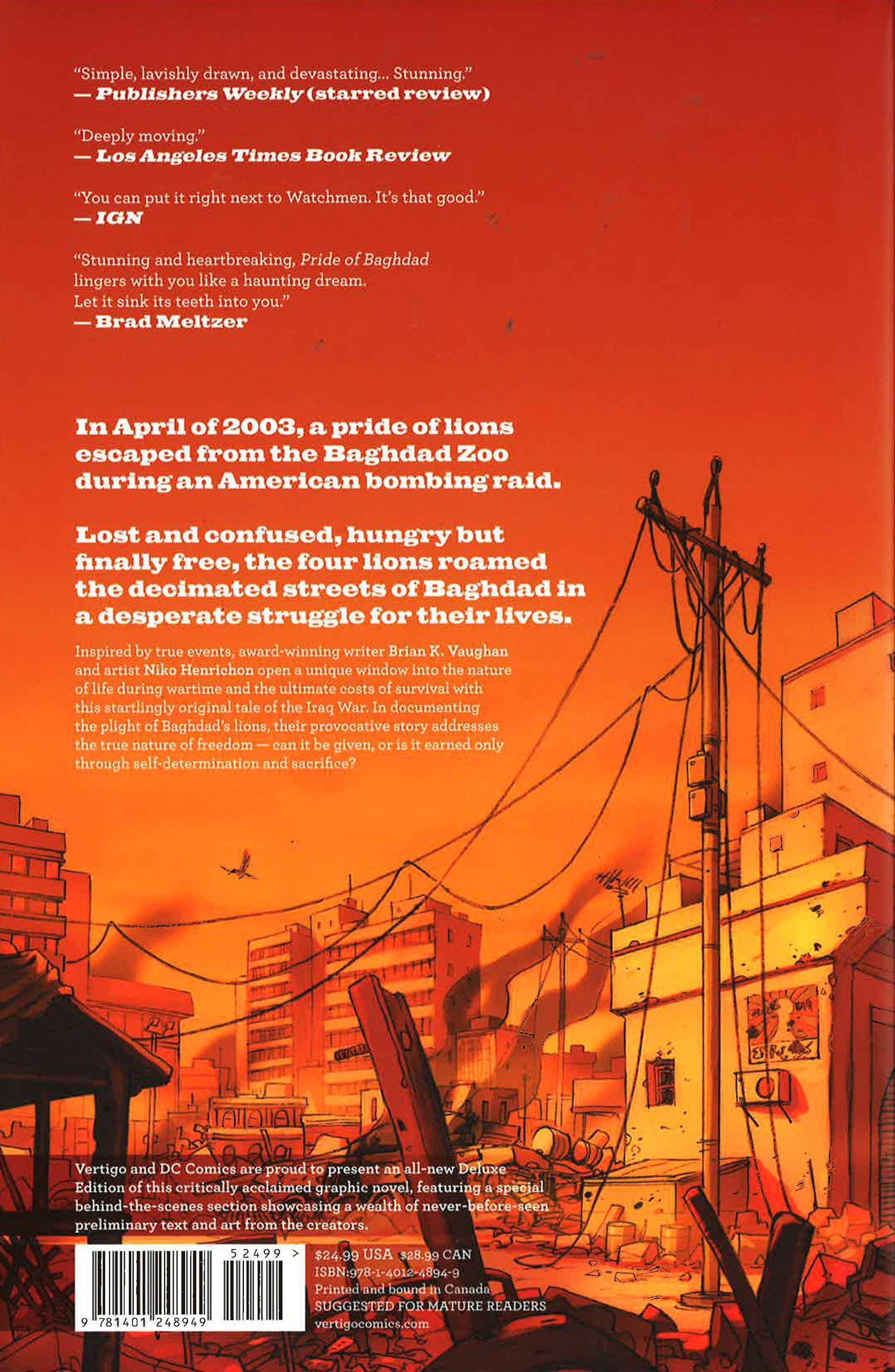 In this provocative graphic novel, superstar comics writer Brian K. Vaughan examines life on the streets of war-torn Iraq. In the spring of 2003, a pride of lions escaped from the Baghdad Zoo during an American bombing raid. Lost and confused, hungry but finally free, the four lions roamed the decimated streets of Baghdad in a desperate struggle for their lives. In documenting the plight of the lions, PRIDE OF BAGHDAD raises questions about the true meaning of liberation: Can it be given, or is it earned only through self-determination and sacrifice? And in the end, is it truly better to die free than to live life in captivity? This moving graphic novel is inspired by true events.This new Deluxe Edition hardcover presents the original graphic novel, plus developmental art and more.