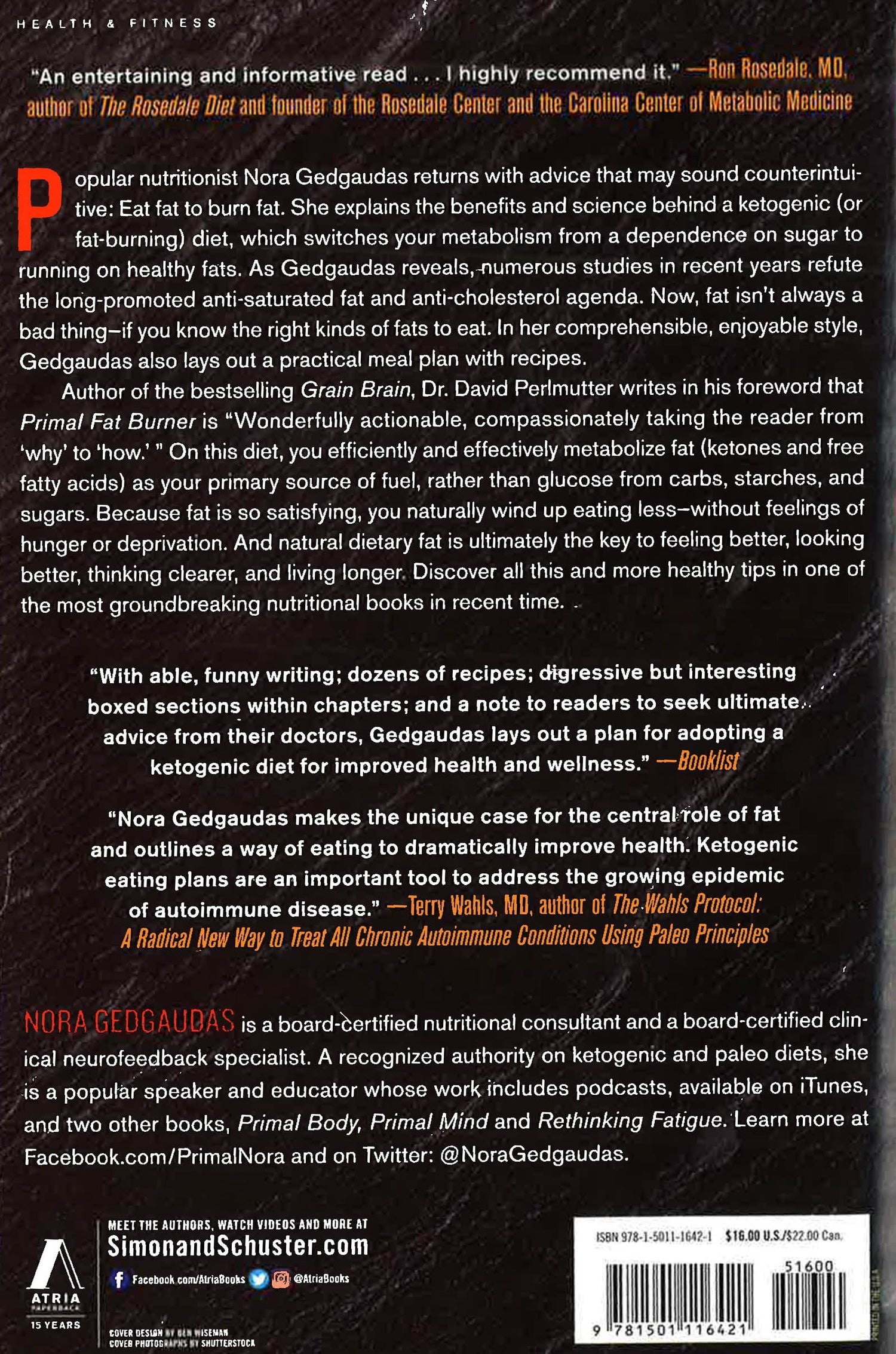 Author of the popular Primal Body, Primal Mind and widely recognized Paleo expert and nutritionist Nora Gedgaudas presents a revolutionary and accessible high-fat diet for maintaining health, losing weight, and reversing some chronic diseases. Popular nutritionist Nora Gedgaudas returns with advice that may sound counterintuitive: Eat fat to burn fat. In Primal Fat Burner, she explains the benefits and science behind a ketogenic (or fat-burning) diet, which switches your metabolism from a dependence on sugar to running on healthy fats. As Gedgaudas reveals, numerous studies in recent years refute the long-promoted anti-saturated fat and anti-cholesterol agenda. Now, "with able, funny writing" (Booklist), Gedgaudas explains the science that fat isn't always a bad thing--if you know the right kinds of fats to eat. In her comprehensible, enjoyable style, she also lays out a practical meal plan with recipes. Author of the bestselling Grain Brain, Dr. David Perlmutter writes in his foreword that Primal Fat Burner is, "Wonderfully actionable, compassionately taking the reader from 'why' to 'how.'" On this diet, you efficiently and effectively metabolize fat (ketones and free fatty acids) as your primary source of fuel, rather than glucose from carbs, starches, and sugars. Because fat is so satisfying, you naturally wind up eating less--without feelings of hunger or deprivation. And natural dietary fat is ultimately the key to feeling better, looking better, thinking clearer, and living longer. Discover all this and more healthy tips in one of the most groundbreaking nutritional books in recent time.