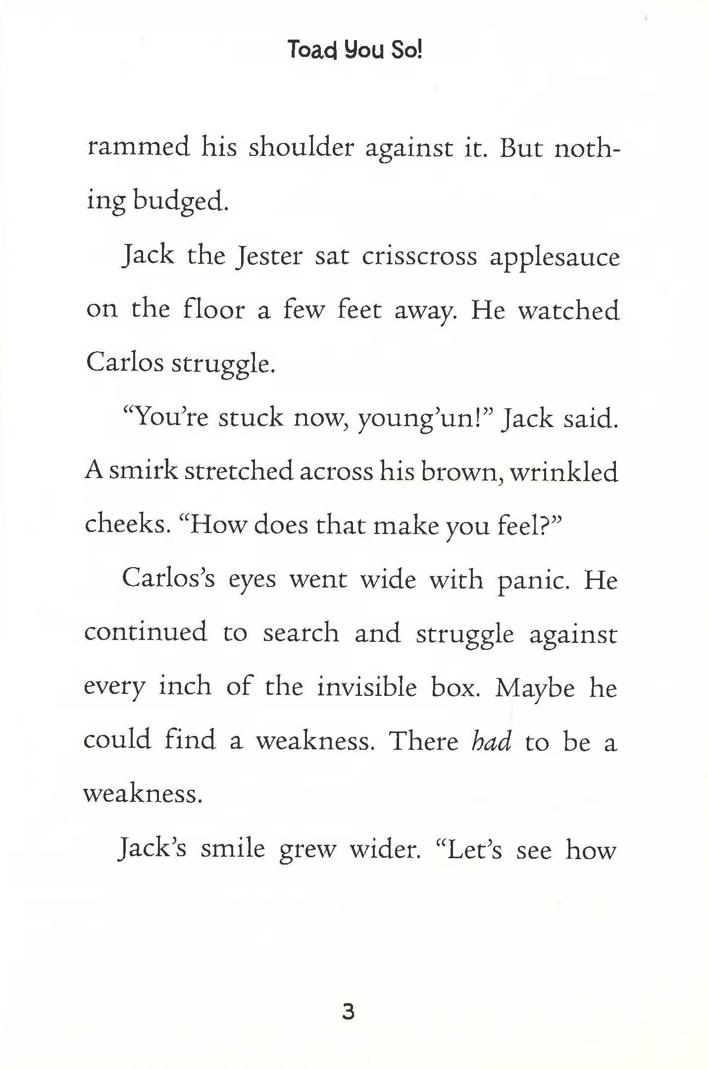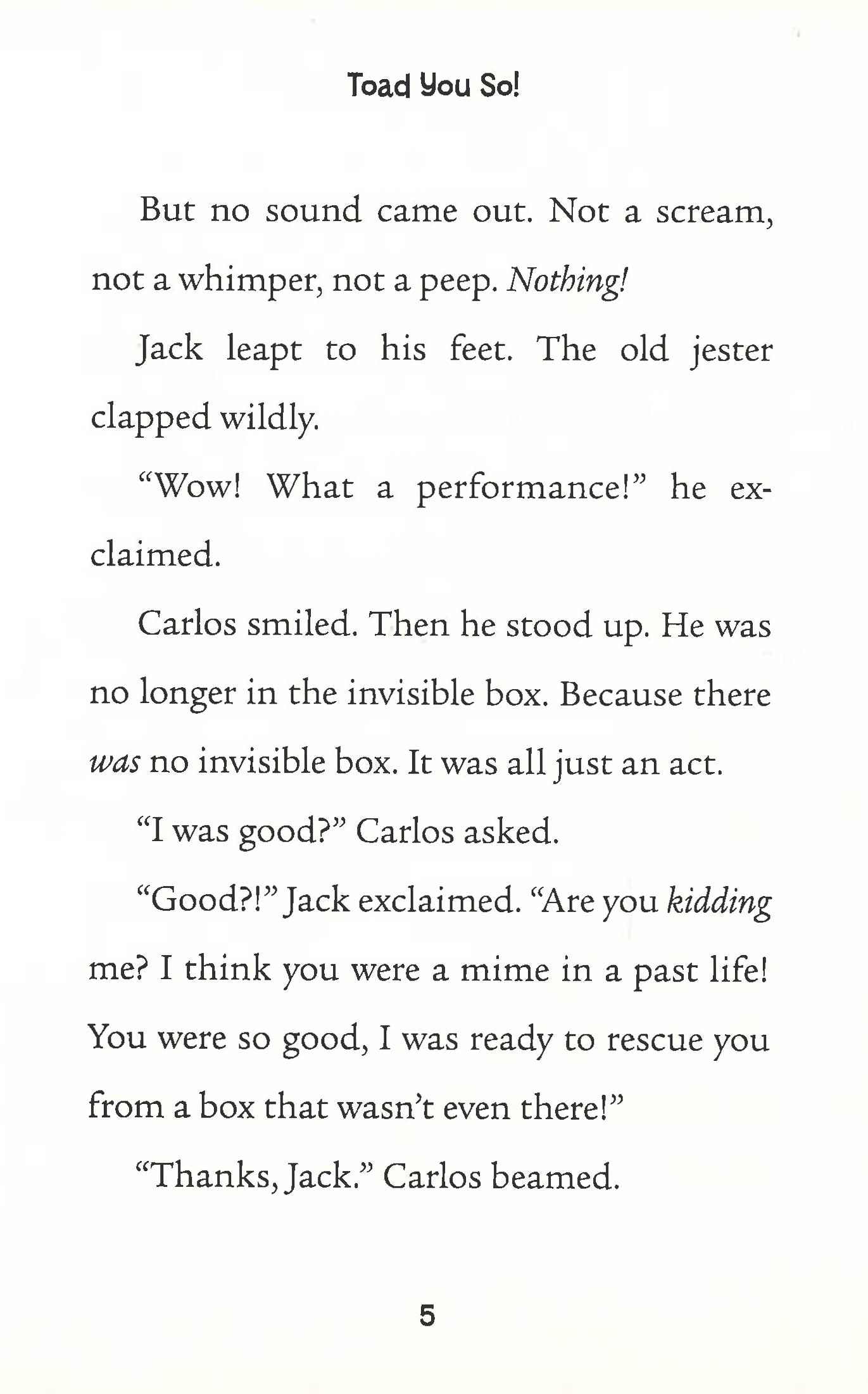 Prince Carlos Charles Charming is finally figuring out how to be both a prince and a court jester. But then a mixed-up wizard transforms Carlos into a toad who eats bugs and croaks instead of speaks. Unfortunately, the wizard doesn't have a spell for reversing it. Even more unfortunately, "Toad Surprise" is on the menu for today's lunch at Fancy Castle! Can Carlos escape the kitchen and leap back into his normal life--warts and all?