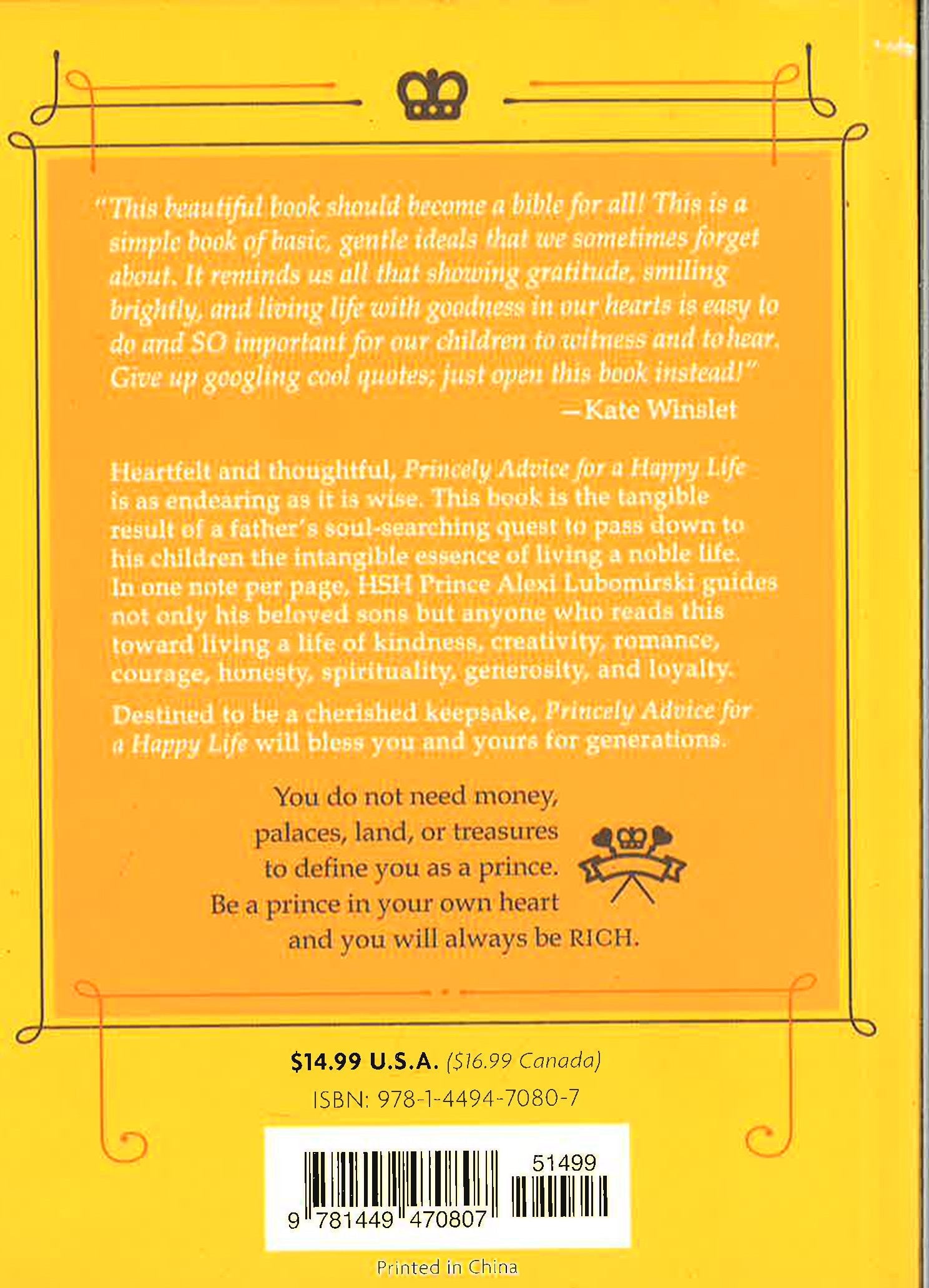 How does one behave like a prince in today's world? Mixing old-world charm with modern-day spirituality HSH Prince Alexi Lubomirski advises on all aspects of life from romance to spirituality, manners to chivalry, love, balance, and leadership. Offering eloquent, timeless counsel for living a gracious life and cultivating inner nobility, Princely Advice for a Happy Lifeis the perfect book to give for graduation, a milestone birthday, or any occasion. "Be LOYAL to family, friends, and loved ones. Look after them and they will look after you. Maintain the flow of loyalty." "Be ROMANTIC. Think of different ways each day to express your love to your loved ones. Love needs to be encouraged, fed, and celebrated. Do it every day!" "You do not need money, palaces, land, or treasures to define you as a prince. Be a prince in your own heart and you will always be RICH." Destined to be a treasured family keepsake, this book is truly for everyone.