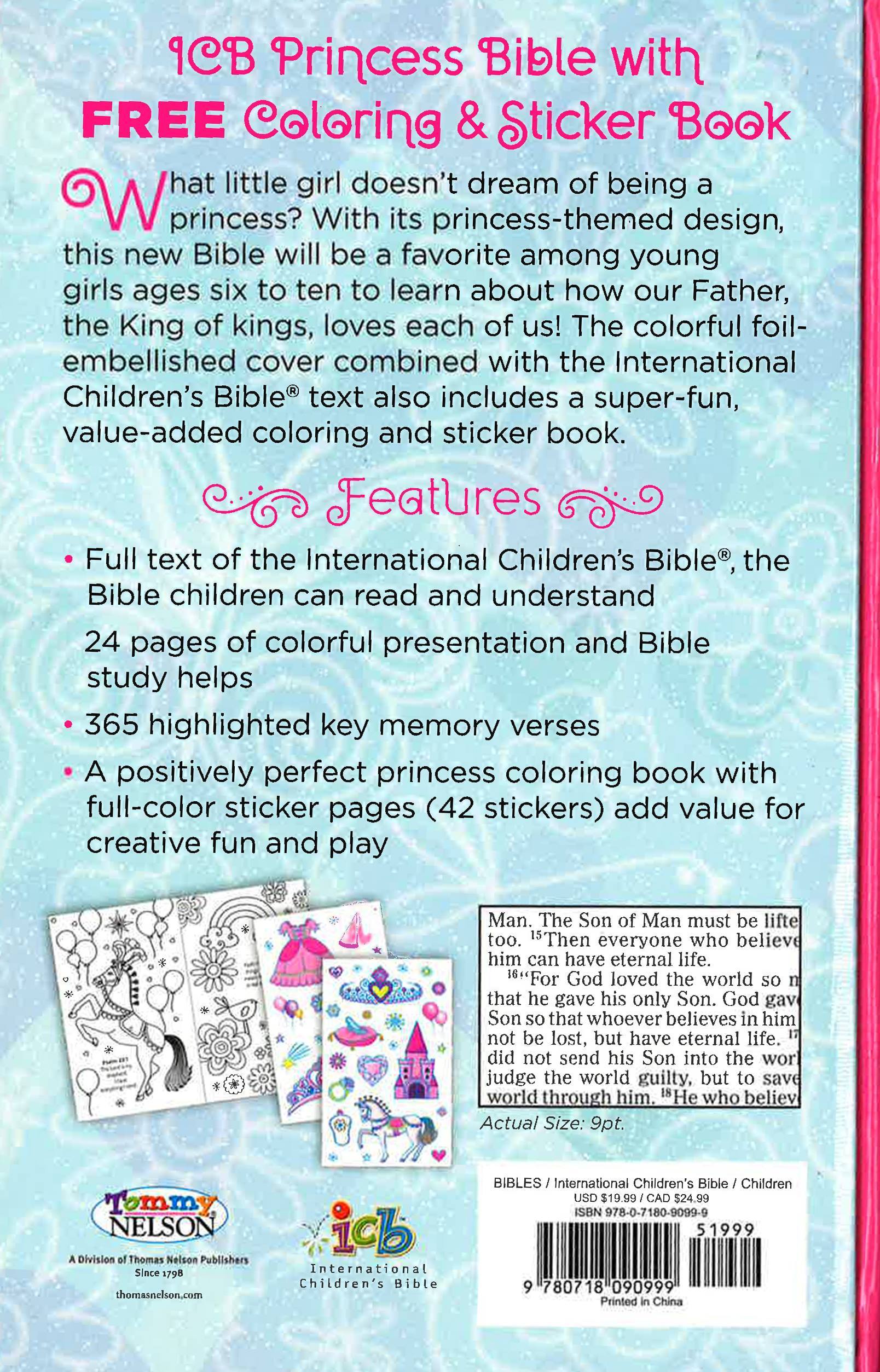 What little girl doesn't dream of being a princess? Everywhere you look in toys, media, fashion, and home decor the princess theme is a timeless classic. And what better than as a child to learn that our Father, the King of kings, loves each of us! We have combined that love for the royal look with our International Children's Bible?, the Bible kids can read and understand. And just for fun, added a bonus coloring and sticker book. Little girls everywhere love all things princess. The ICB Princess Bible is the perfect Bible to get your little princess reading and engaging with God's Word! It combines a princess-themed cover, the bestselling International Children's Bible? text, and a fun coloring sticker book with more than 50 stickers. The International Children's Bible? is the translation of the Bible that kids can read and understand. Translated at a third-grade reading level, it is the perfect first Bible for young readers to learn and grow with. Now even more readable with large type, bold subject headings, 365 highlighted key verses, and a kid-friendly dictionary and concordance, the ICB is a natural way to introduce God's Word to your little princess. The ICB Princess Bible has twenty-four full-color princess-designed Bible study helps included within the text, and the bonus coloring sticker book includes sixteen pages of royal images and more than 50 sparkly stickers! Show your little princess that she is also God's princess with the new ICB Princess Bible.