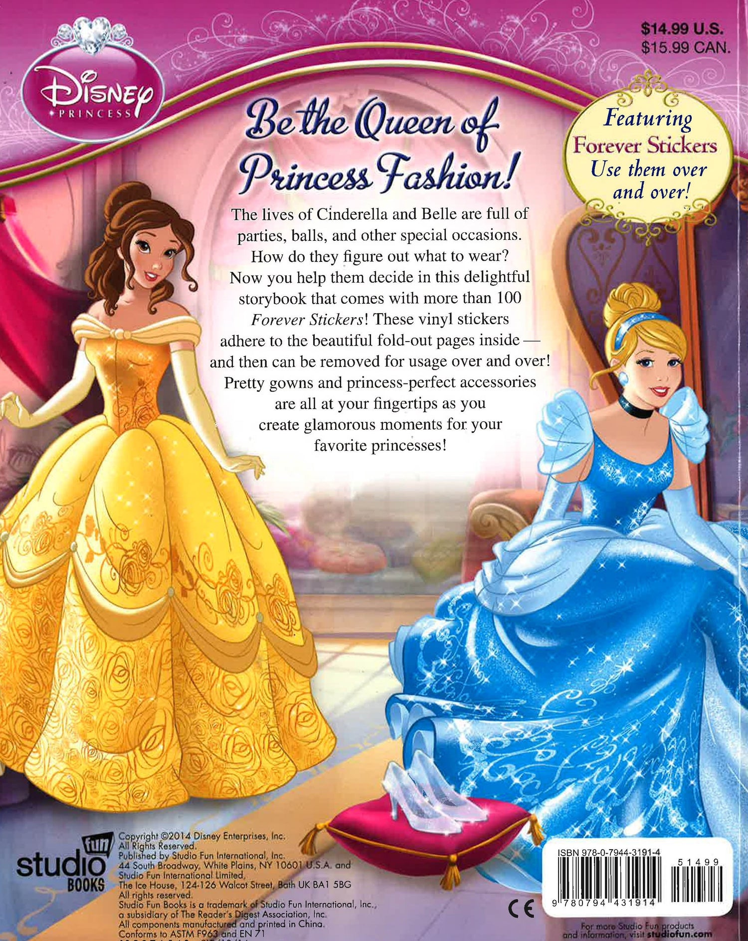 This cardstock storybook with fold-out play board comes with vinyl clings that can be stored in a pocket on the inside cover. Hours of creative fun await Disney princess fans! First they get to read amazing stories about their favorite Disney princesses. Then they get to design special new outfits for each princess using the Forever Stickers on every page of this interactive storybook, which comes complete with a fold out playscene and vinyl clings.