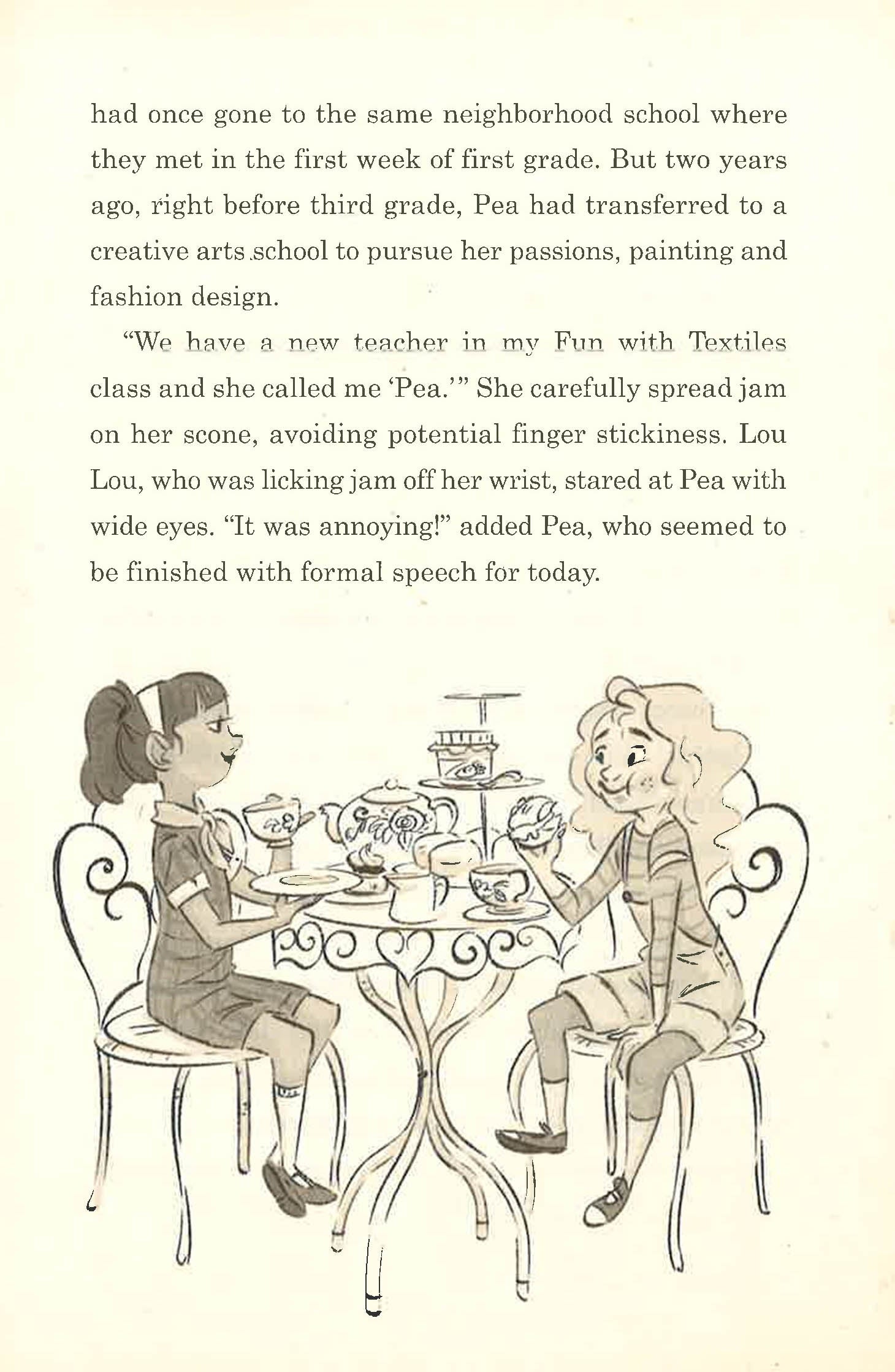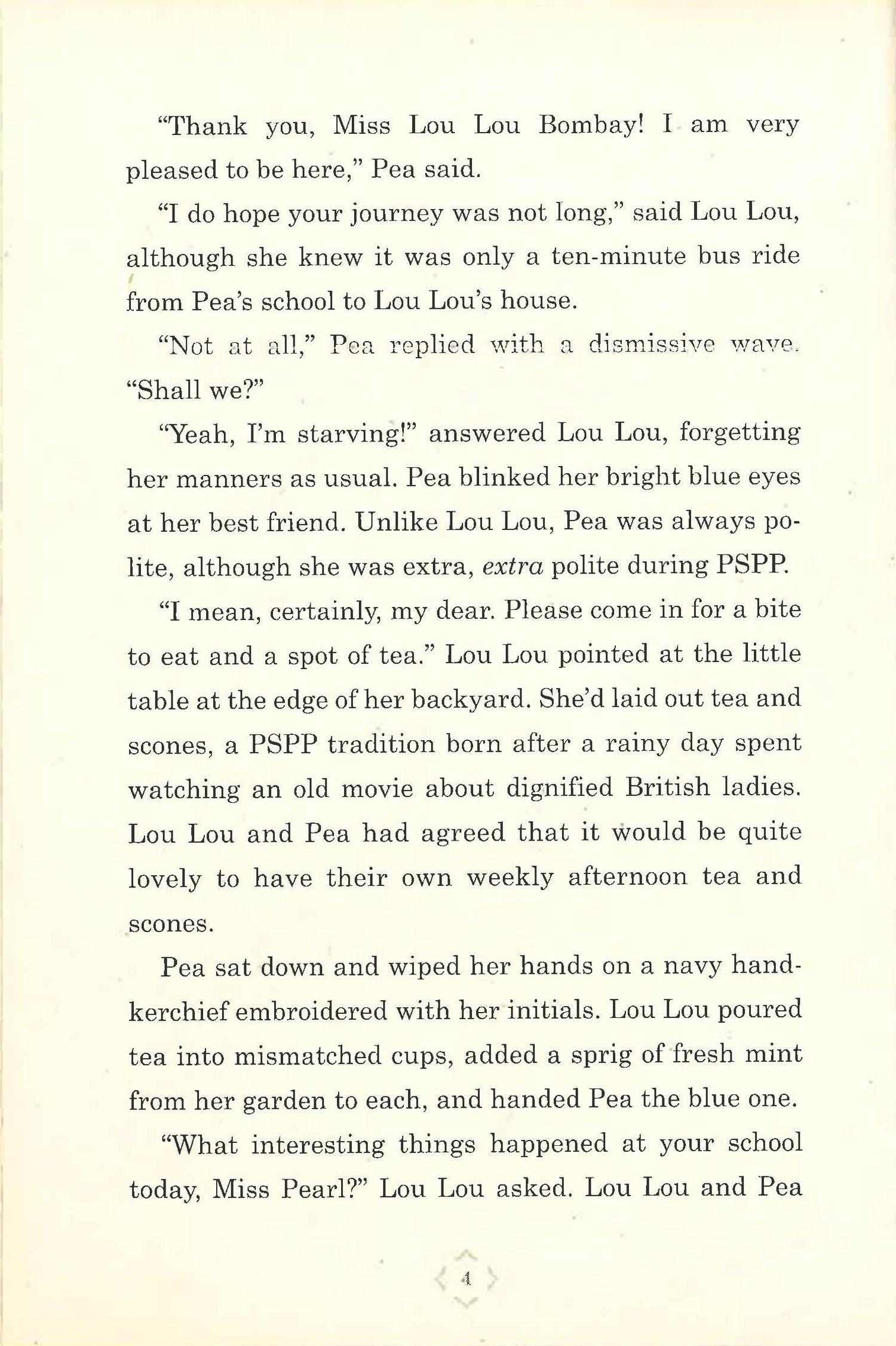 Lou Lou Bombay and Peacock Pearl have been best friends since first grade. Every Friday afternoon, they get together in Lou Lou's backyard garden for their PSPP (Post-School Pre-Parents) tea party. They chat about school, discuss Pea's latest fashions, and plot the weekend's activities.