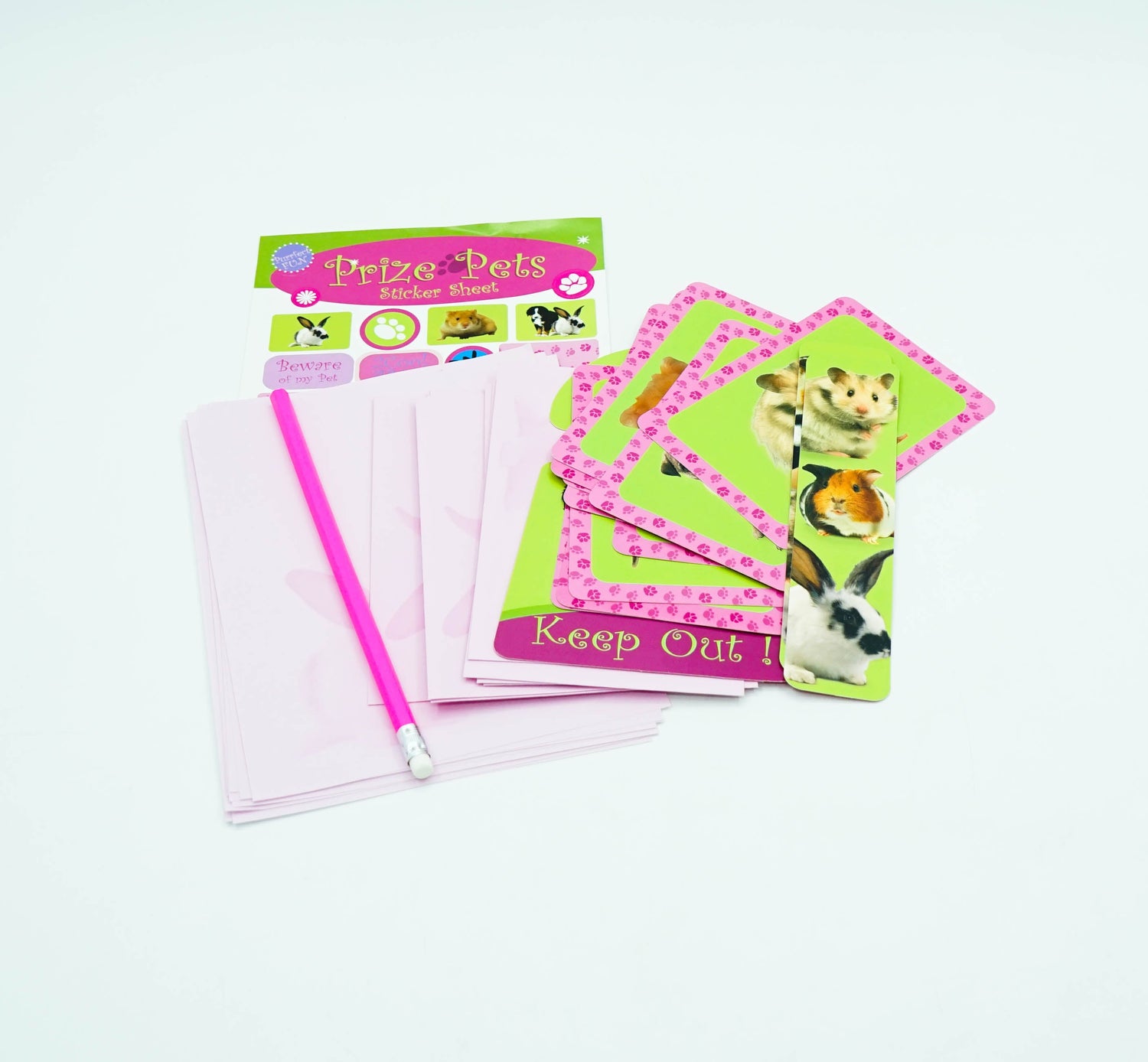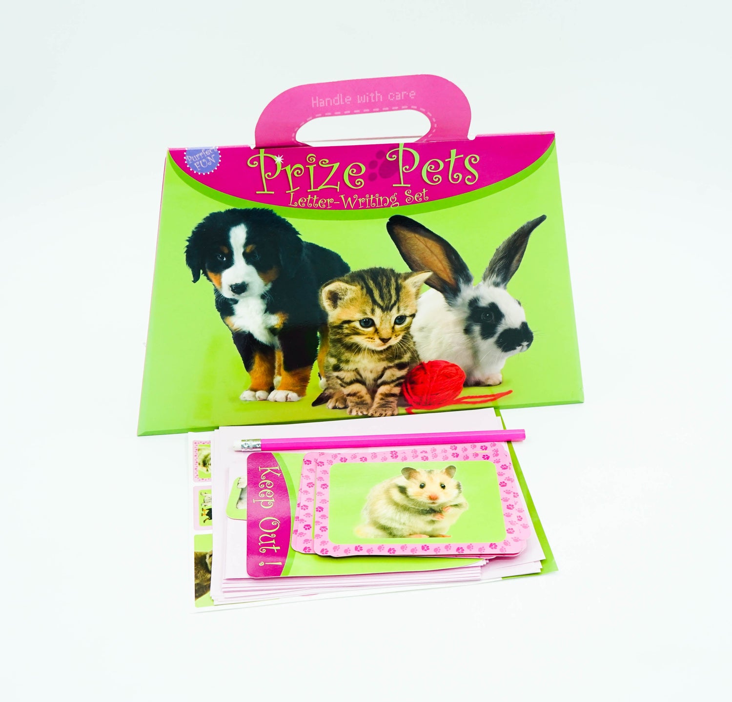 Carry folder contains 10 sheets of writing paper, 10 envelopes, 10 postcards, 2 bookmarks, door hanger, sticker sheet and pencil.