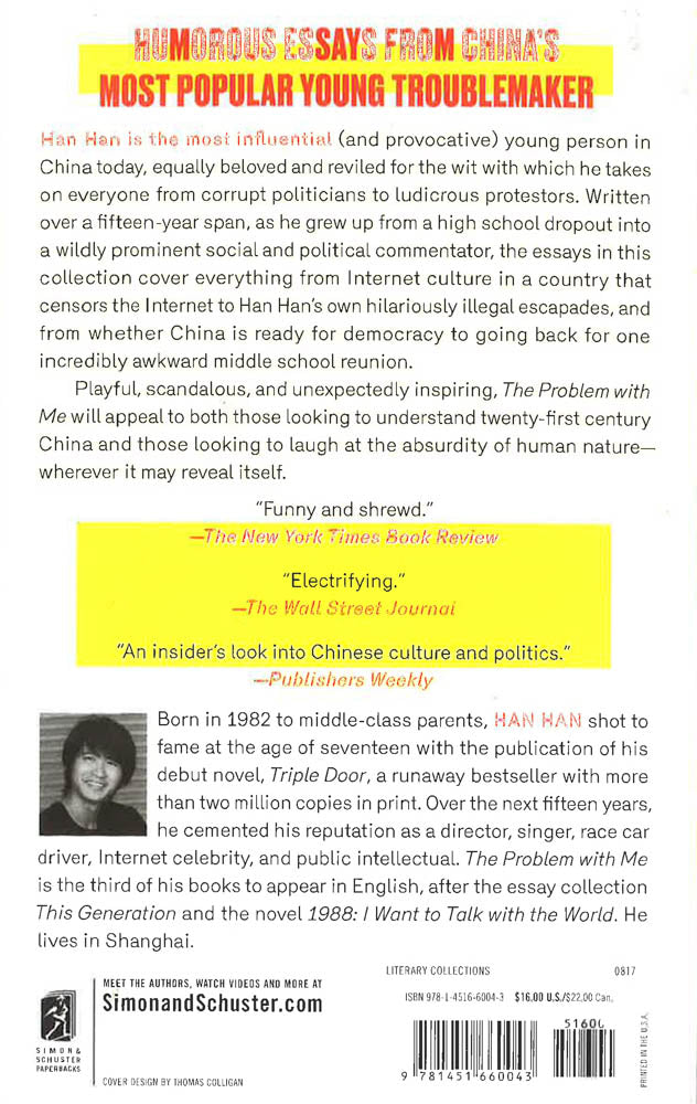 Satirical essays from China's most influential blogger on growing up millennial and making political trouble today."Funny and shrewd" (The New York Times Book Review) essays from China's most popular young troublemaker about growing up millennial and causing social and political scandal today.Han Han "owes equal debt to Jack Kerouac and Justin Timberlake" (The New Yorker). He's the most influential (and provocative) young person in China, equally beloved and reviled for the satirical wit with which he takes on everyone from corrupt politicians to ludicrous protesters and everything from Internet culture in a country that censors the Internet to the question of whether China is ready for democracy. "Evocative and funny" and "occasionally electrifying" (The Wall Street Journal), The Problem with Me provides "an insider's look into Chinese culture and politics" (Publishers Weekly).