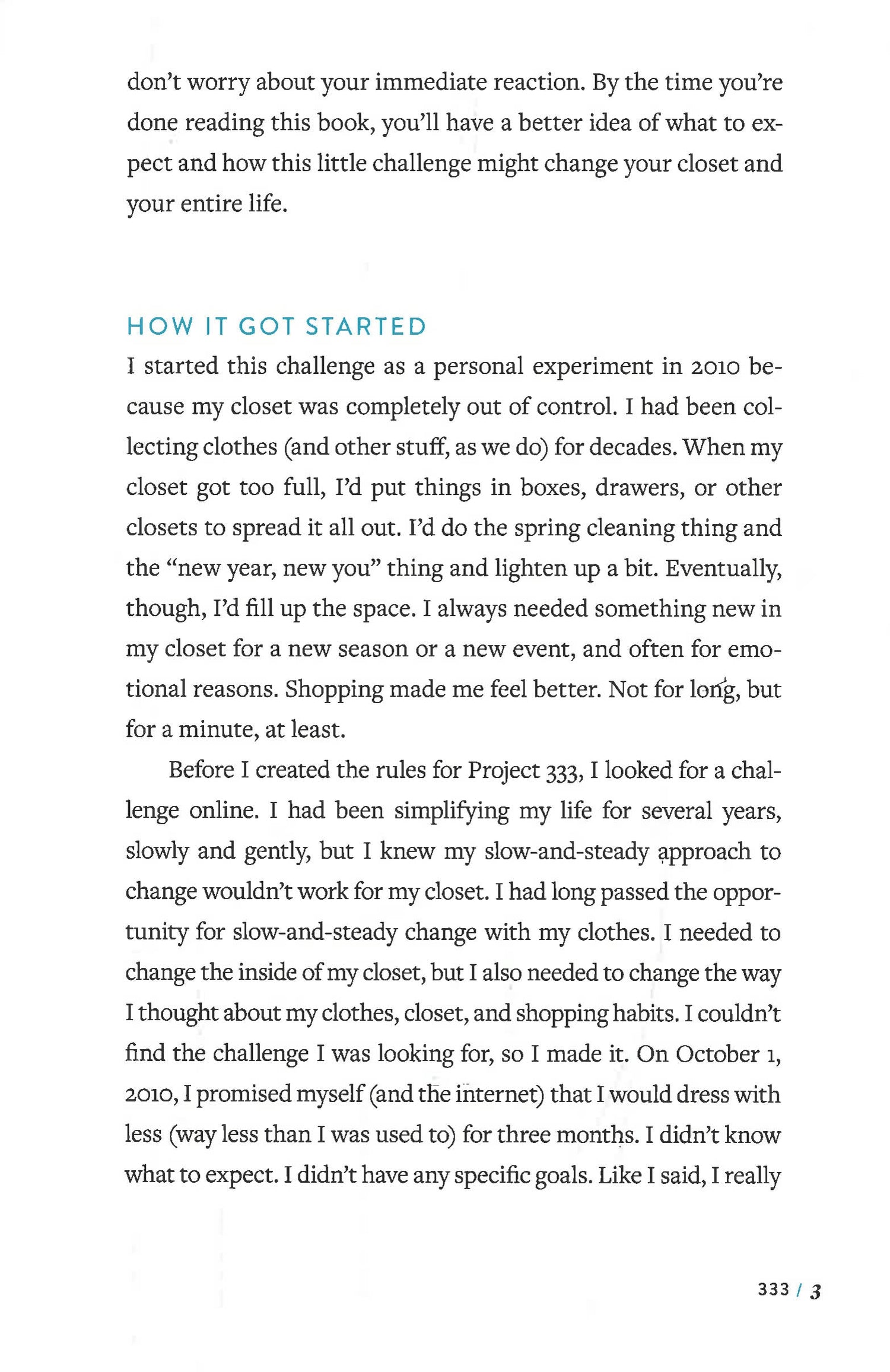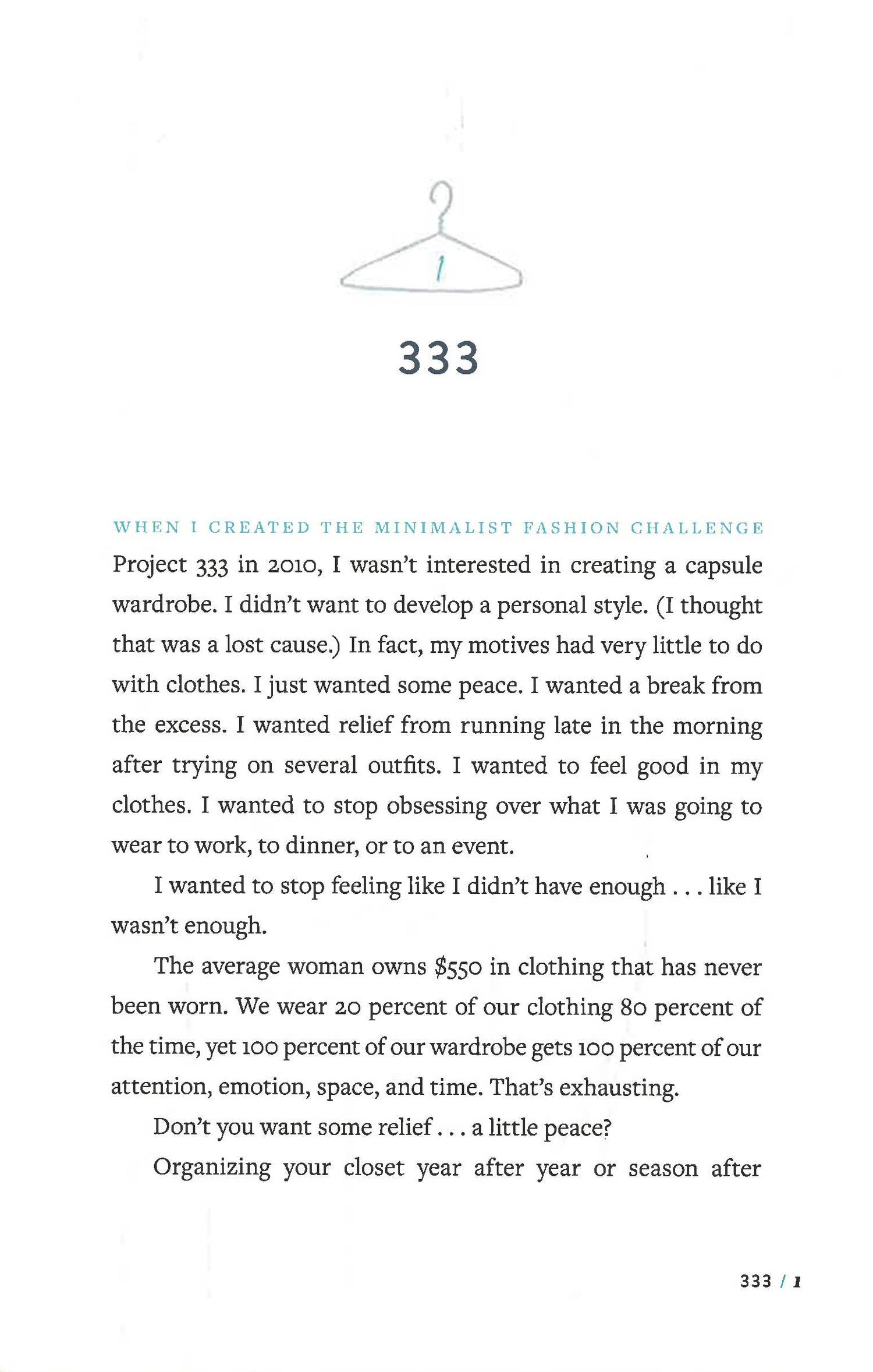 In Project 333, minimalist expert and author of Soulful Simplicity Courtney Carver takes a new approach to living simply--starting with your wardrobe. Project 333 promises that not only can you survive with just 33 items in your closet for 3 months, but you'll thrive just like the thousands of woman who have taken on the challenge and never looked back. Let the de-cluttering begin!